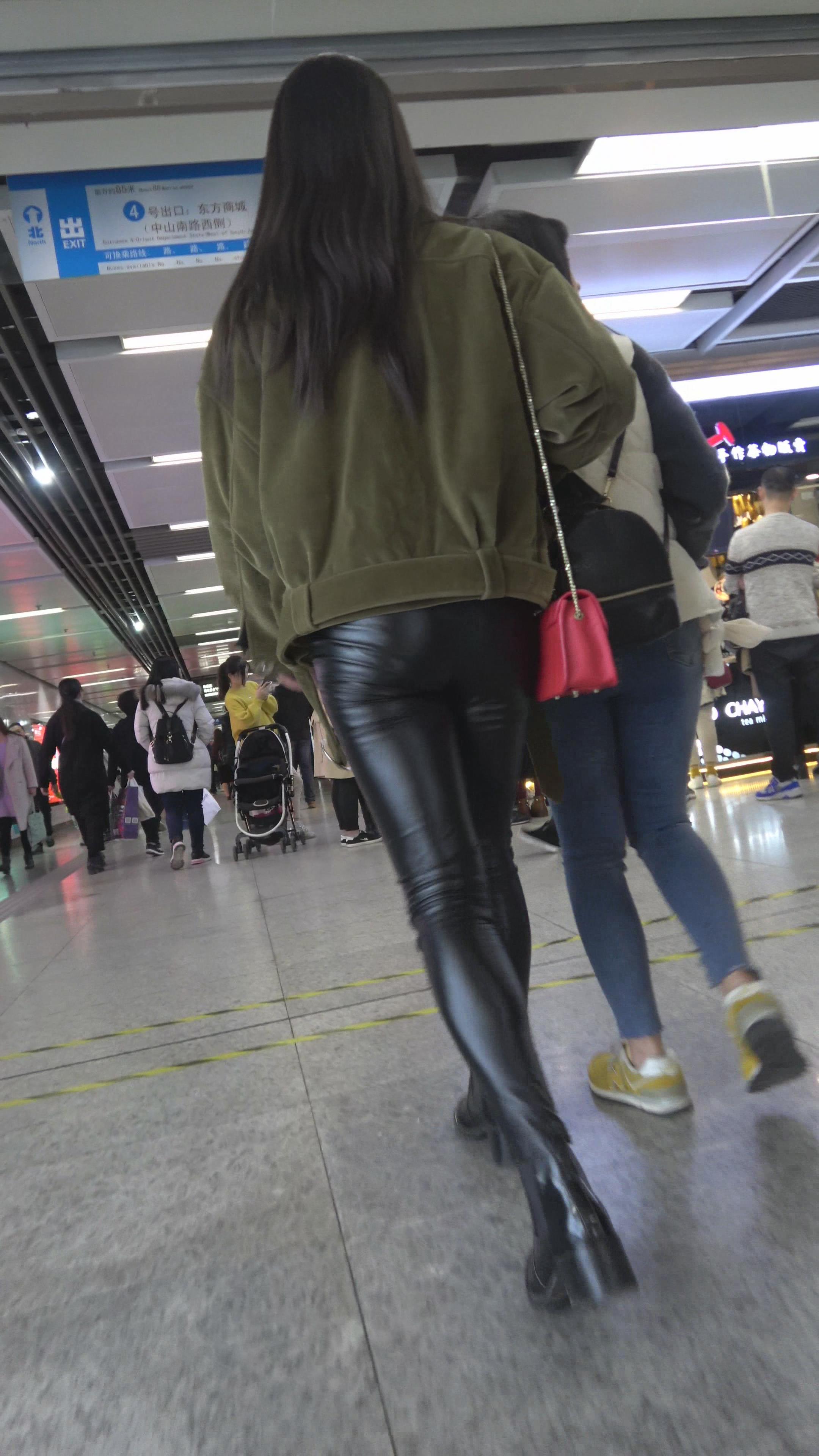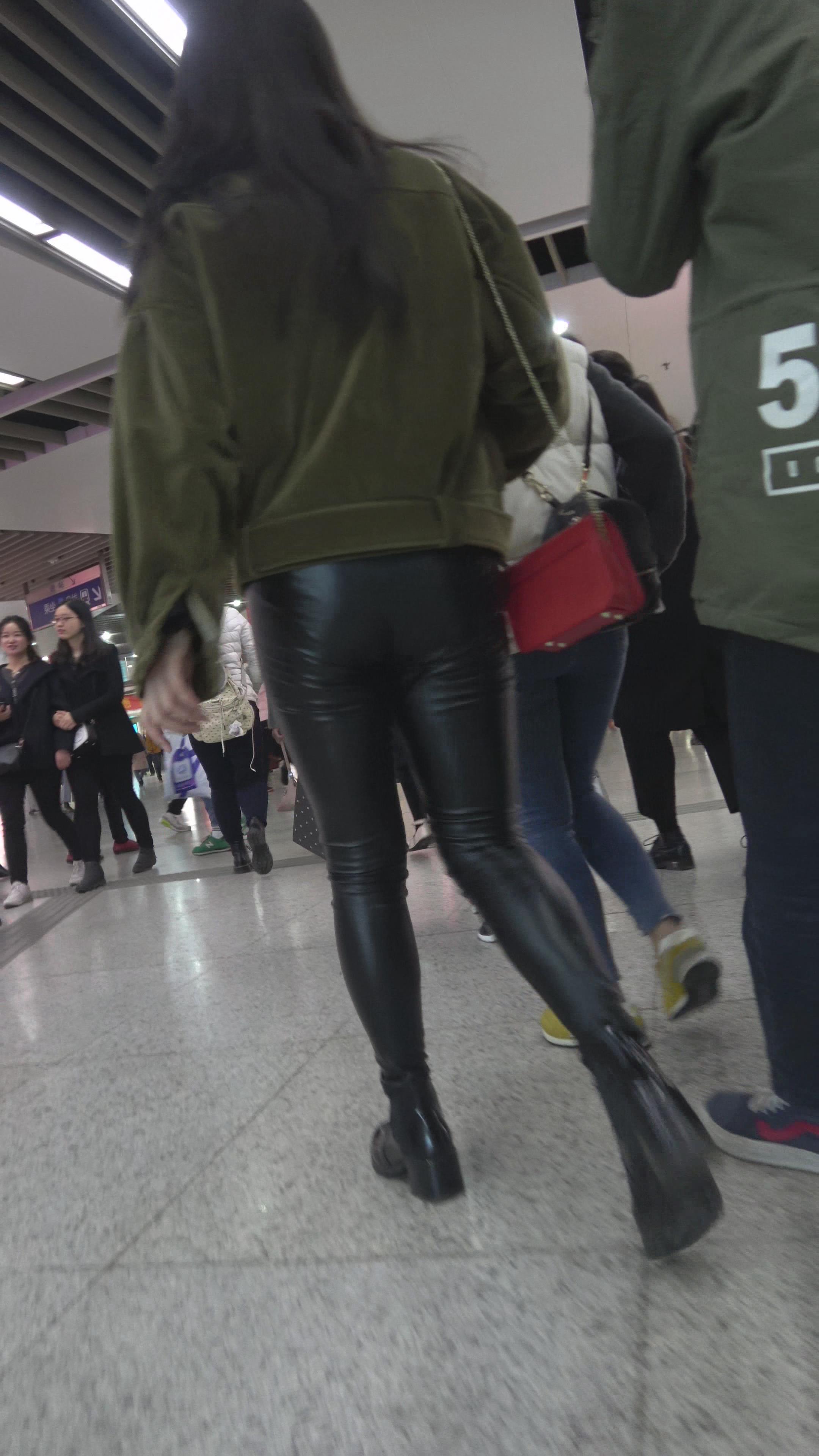 4K 酒红色外套街拍紧身皮裤眼镜美女 编号3138