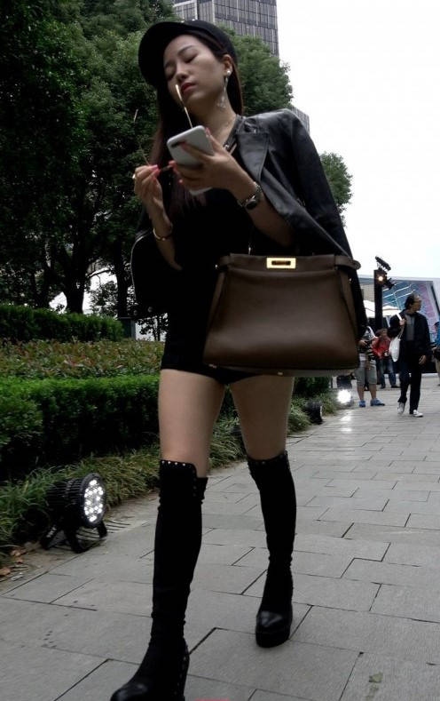 4K-性感黑短裤长腿长靴街拍美女 编号9354