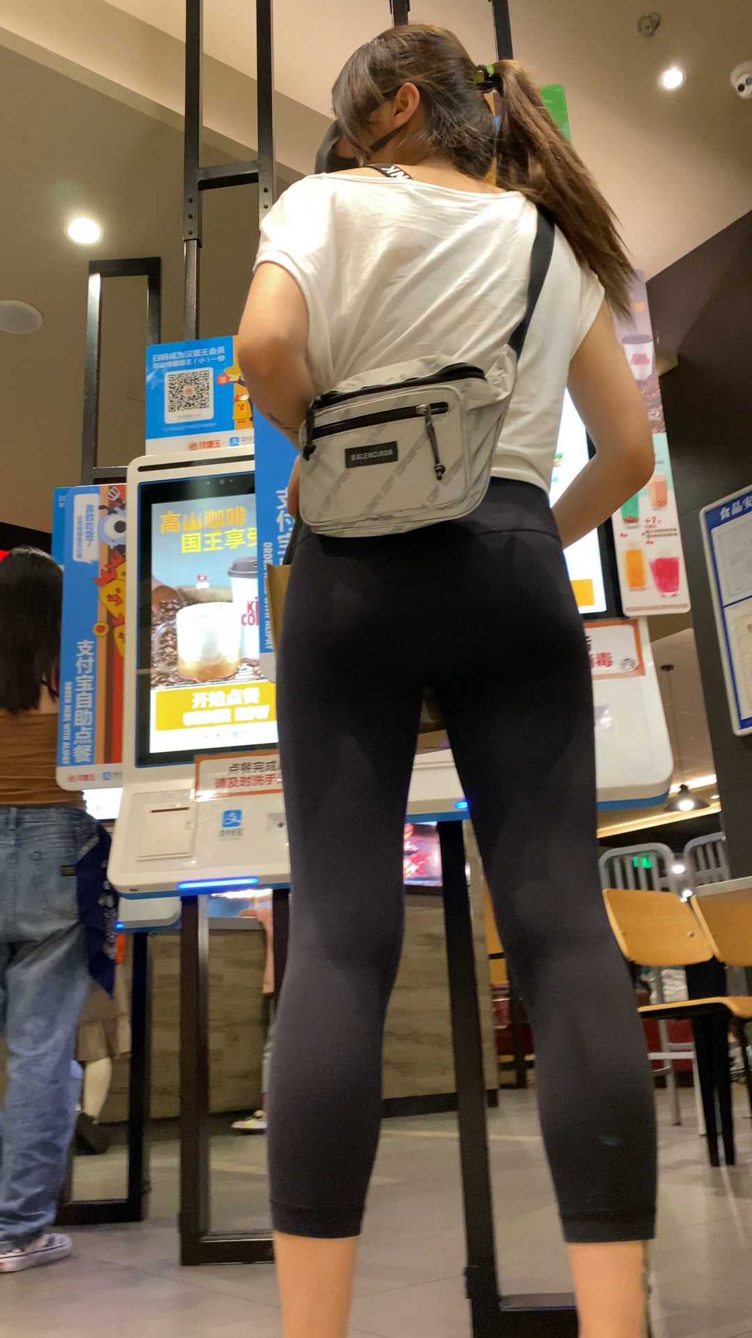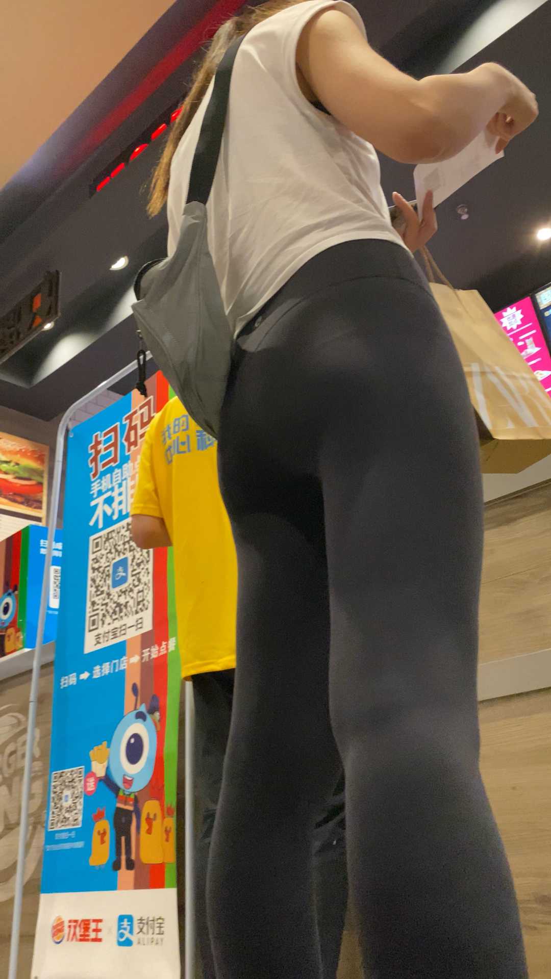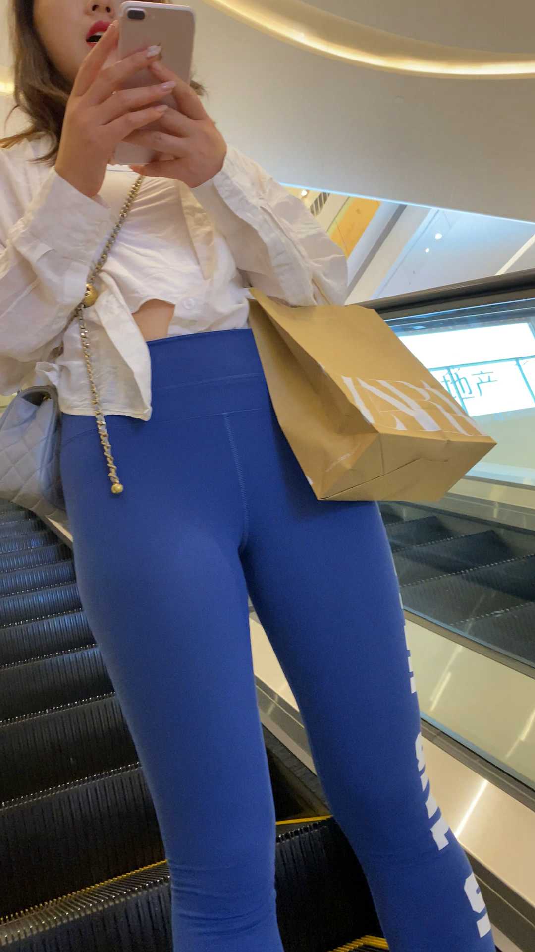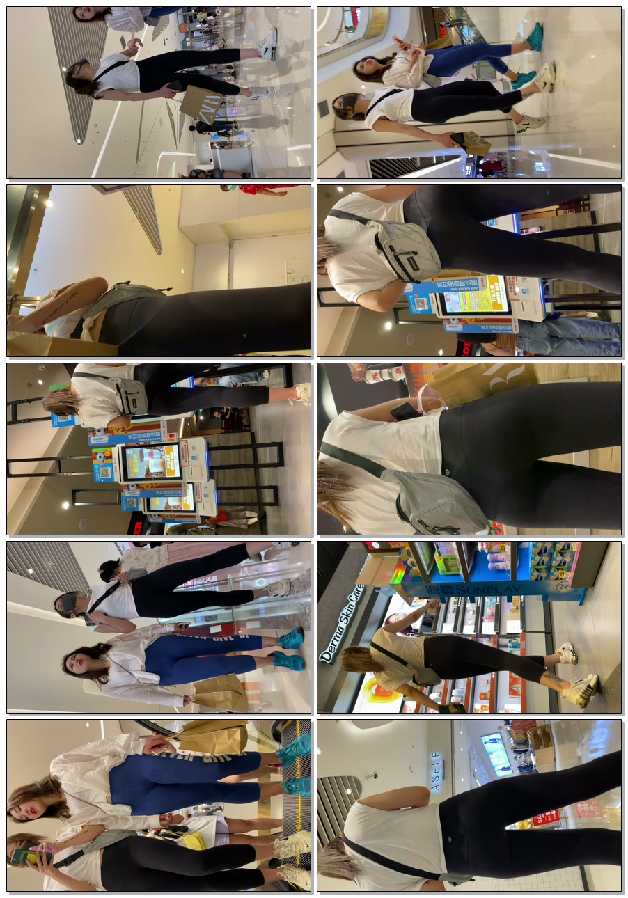 B1137两瑜伽裤妹子逛商场,一灰一蓝,颜色搭配美