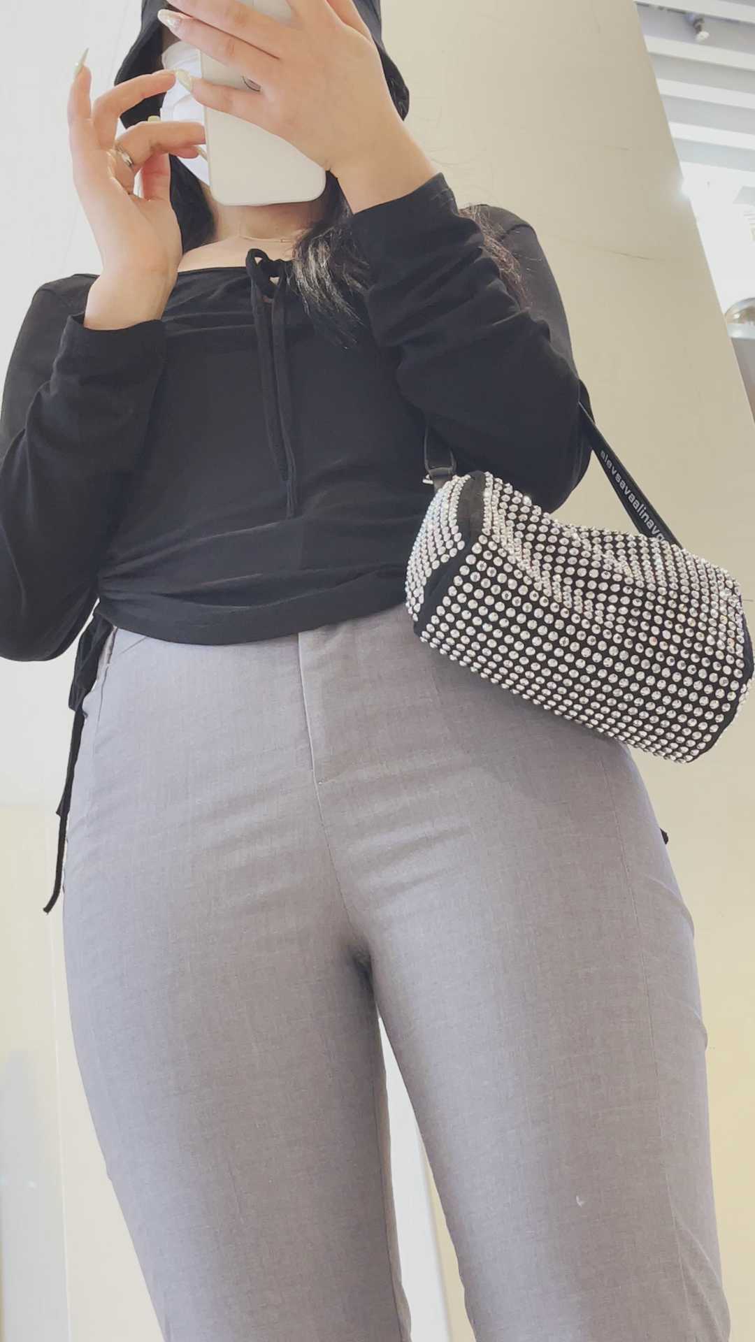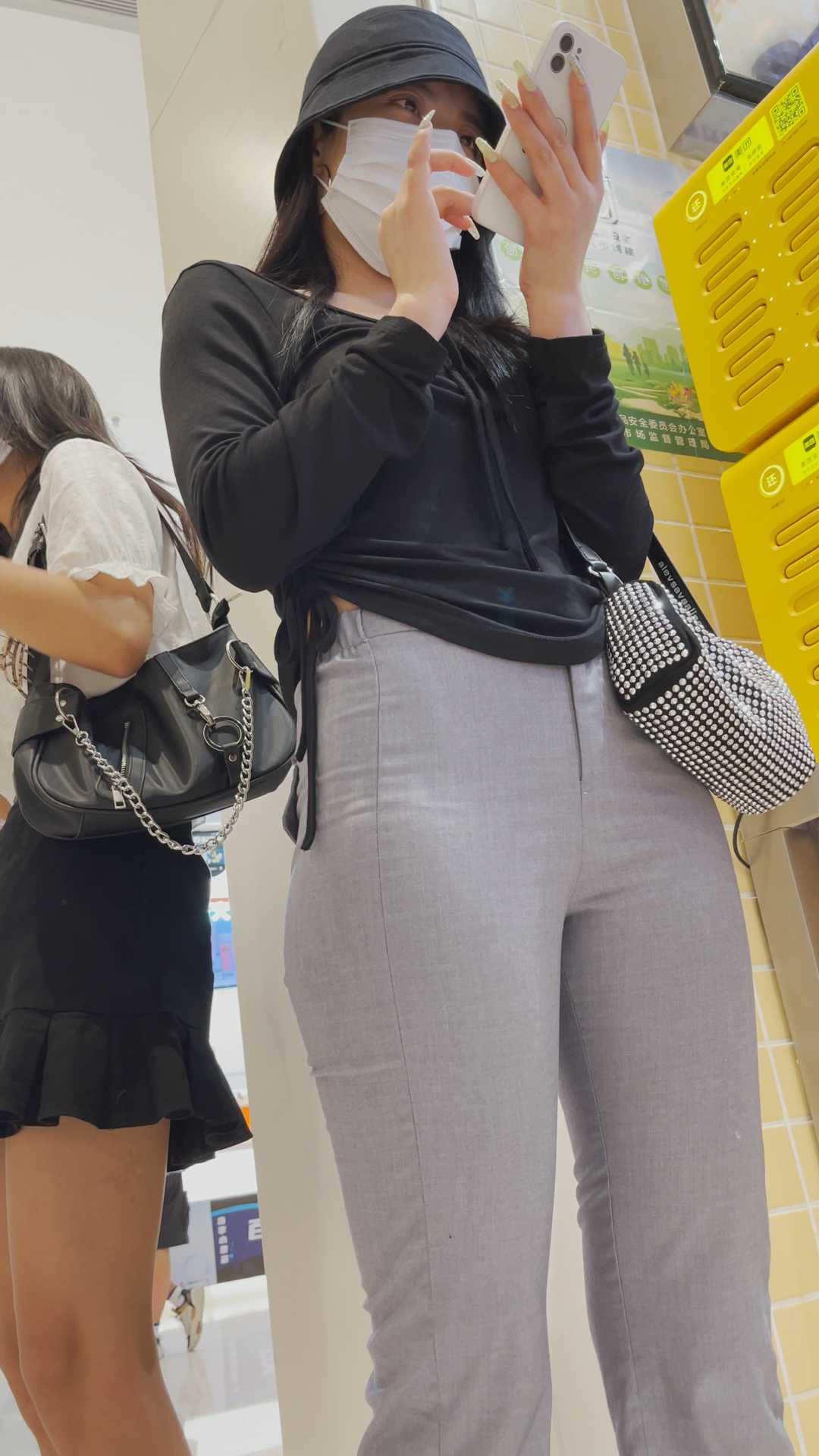 B70紧身灰西裤紧臀金三角妹子