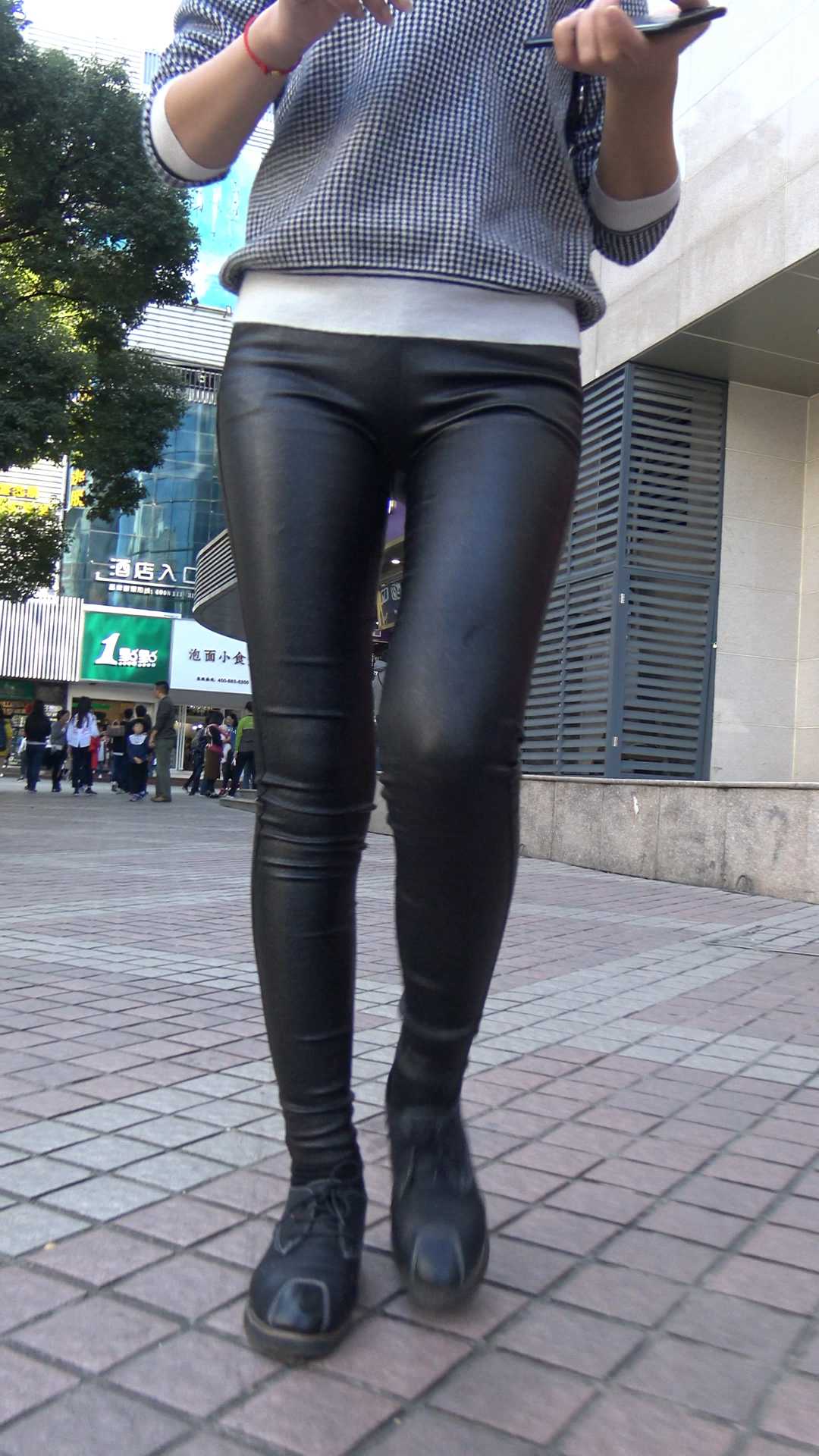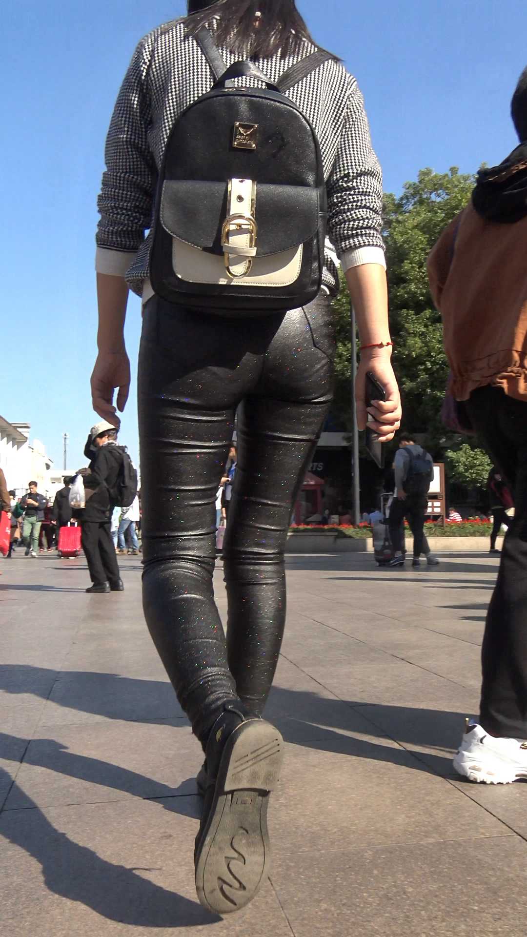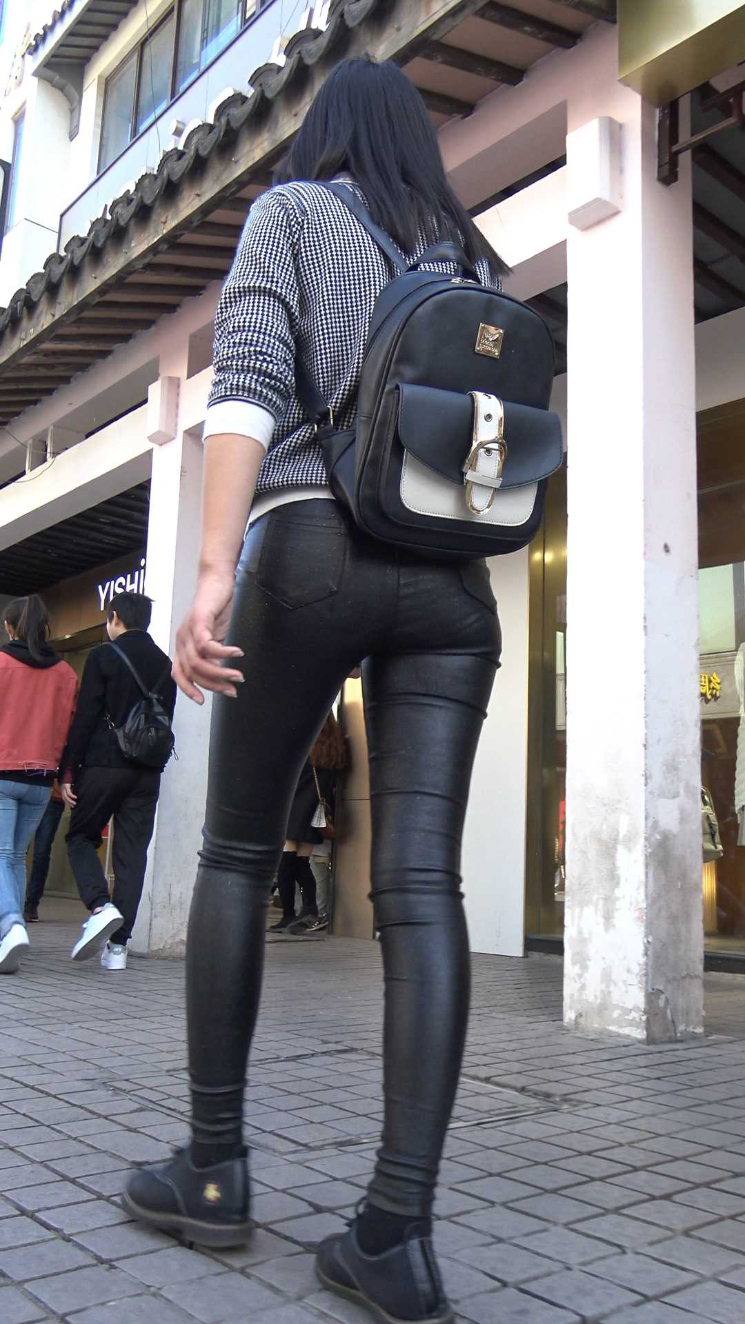 C902紧身皮裤圆臀背包少女
