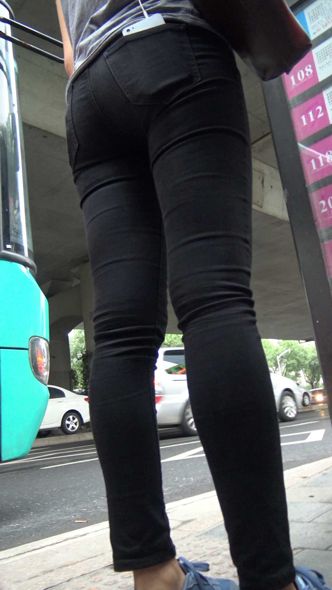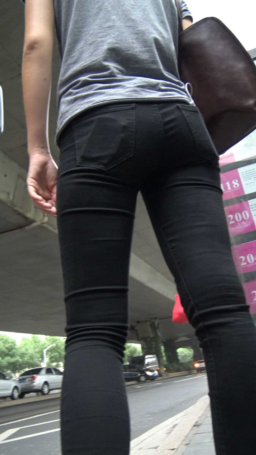 C963紧身黑裤美臀学妹等公交