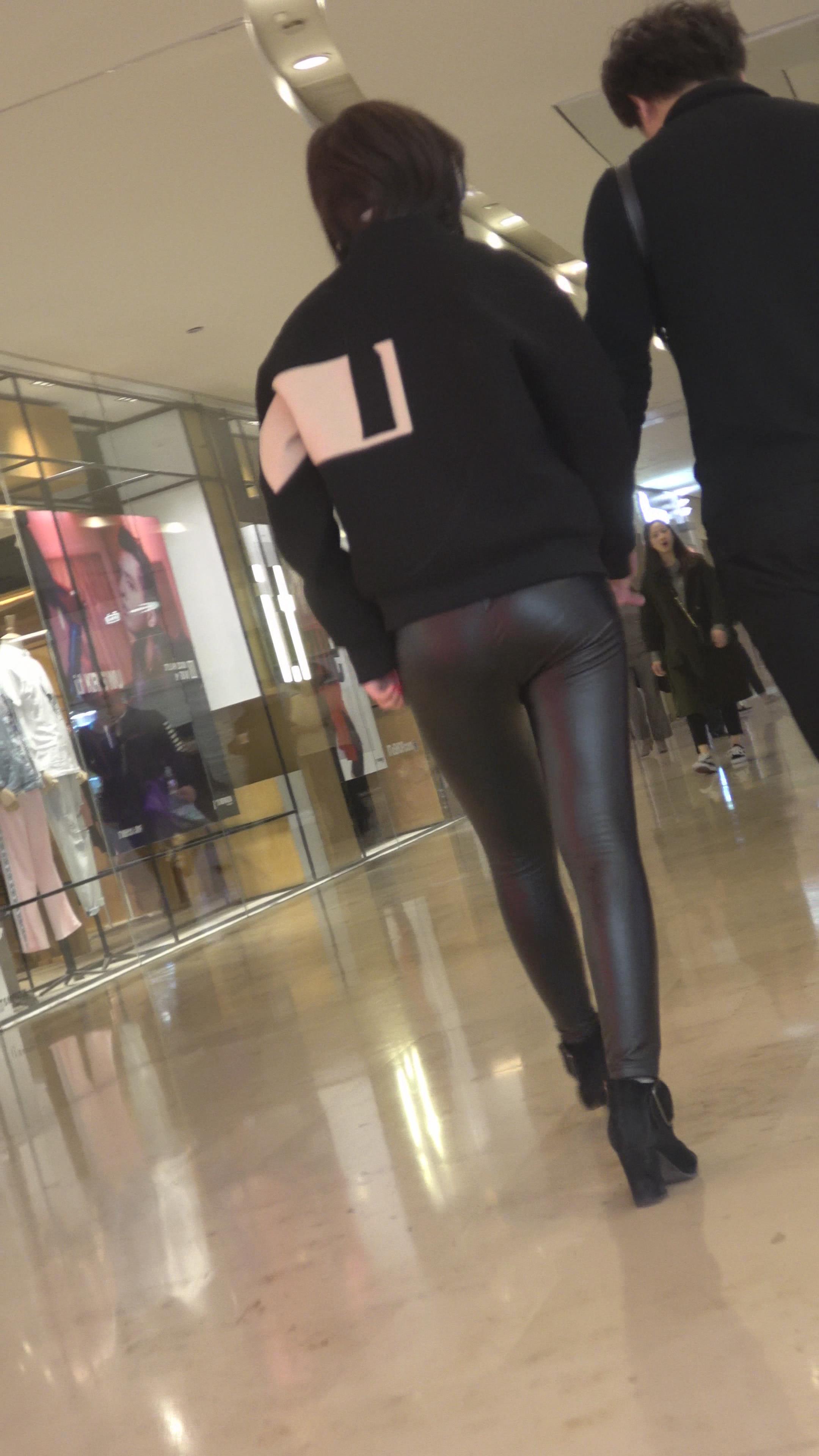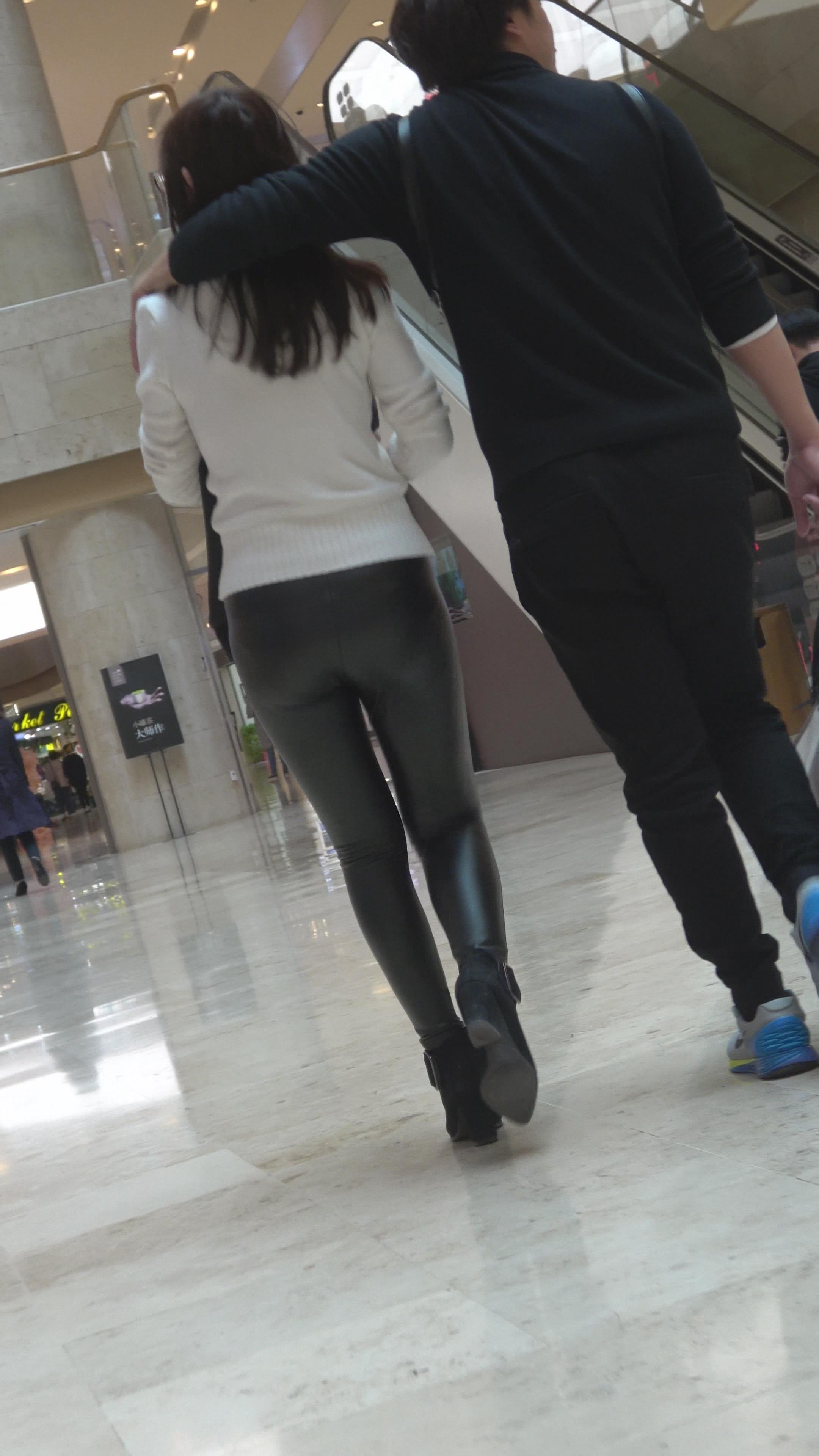 4K 街拍黑色紧身皮裤美女逛商场 编号3320