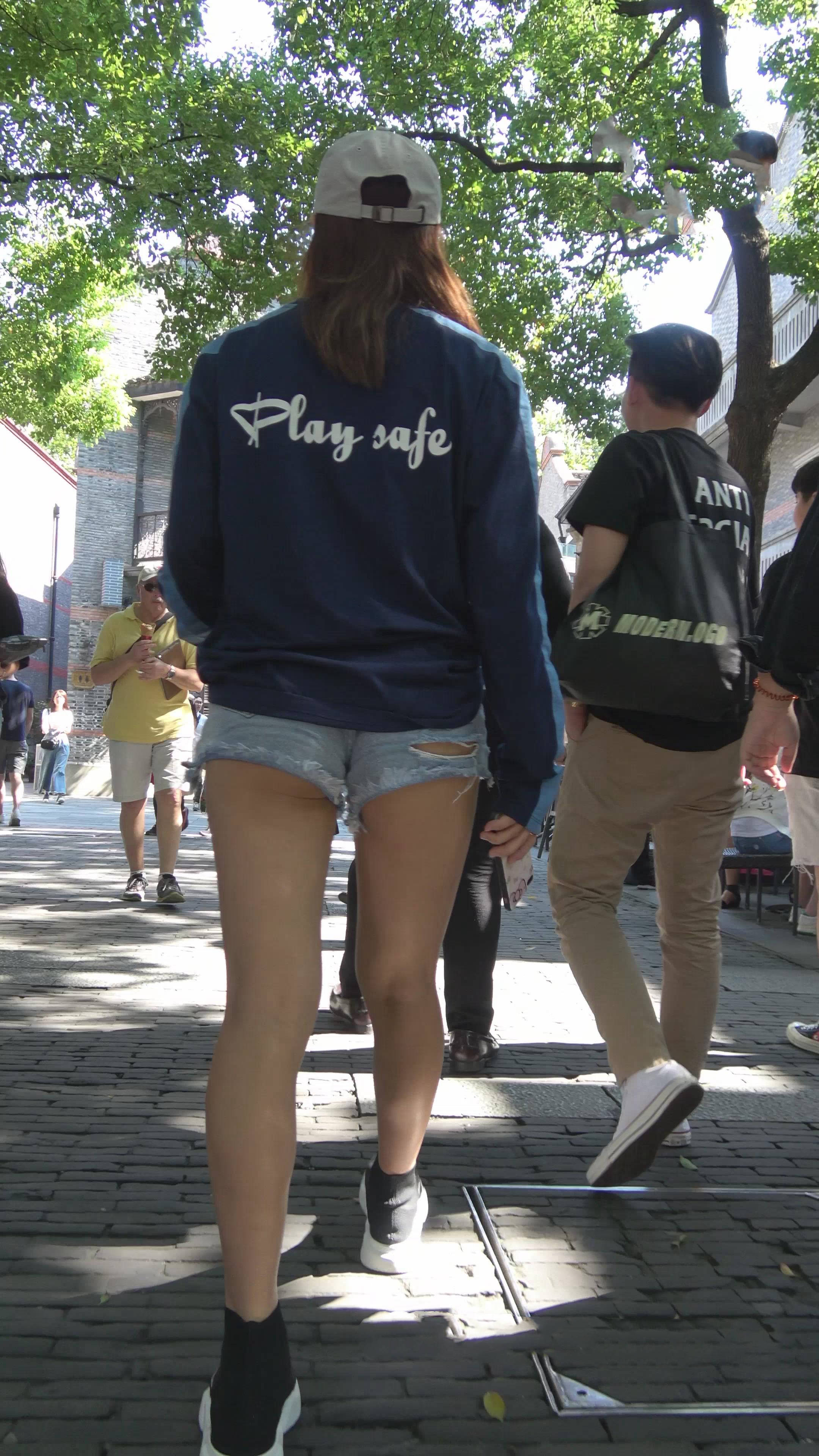 4k-街拍饱满月牙破洞牛仔热裤鸭舌帽小女友 编号7450