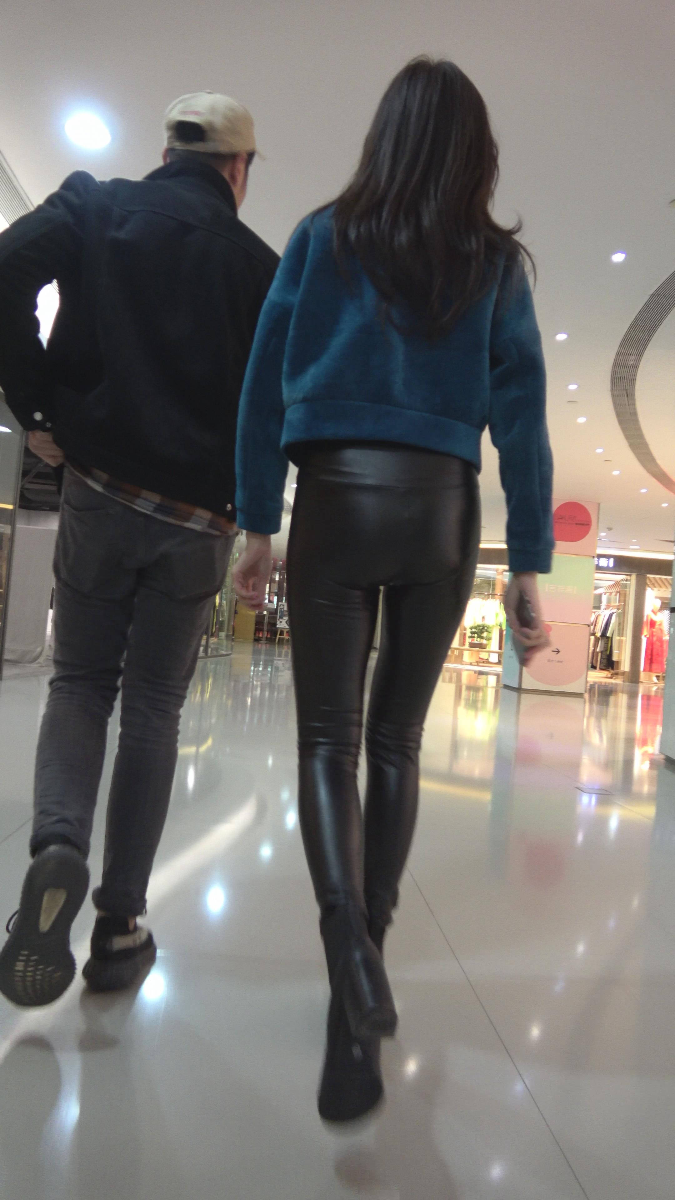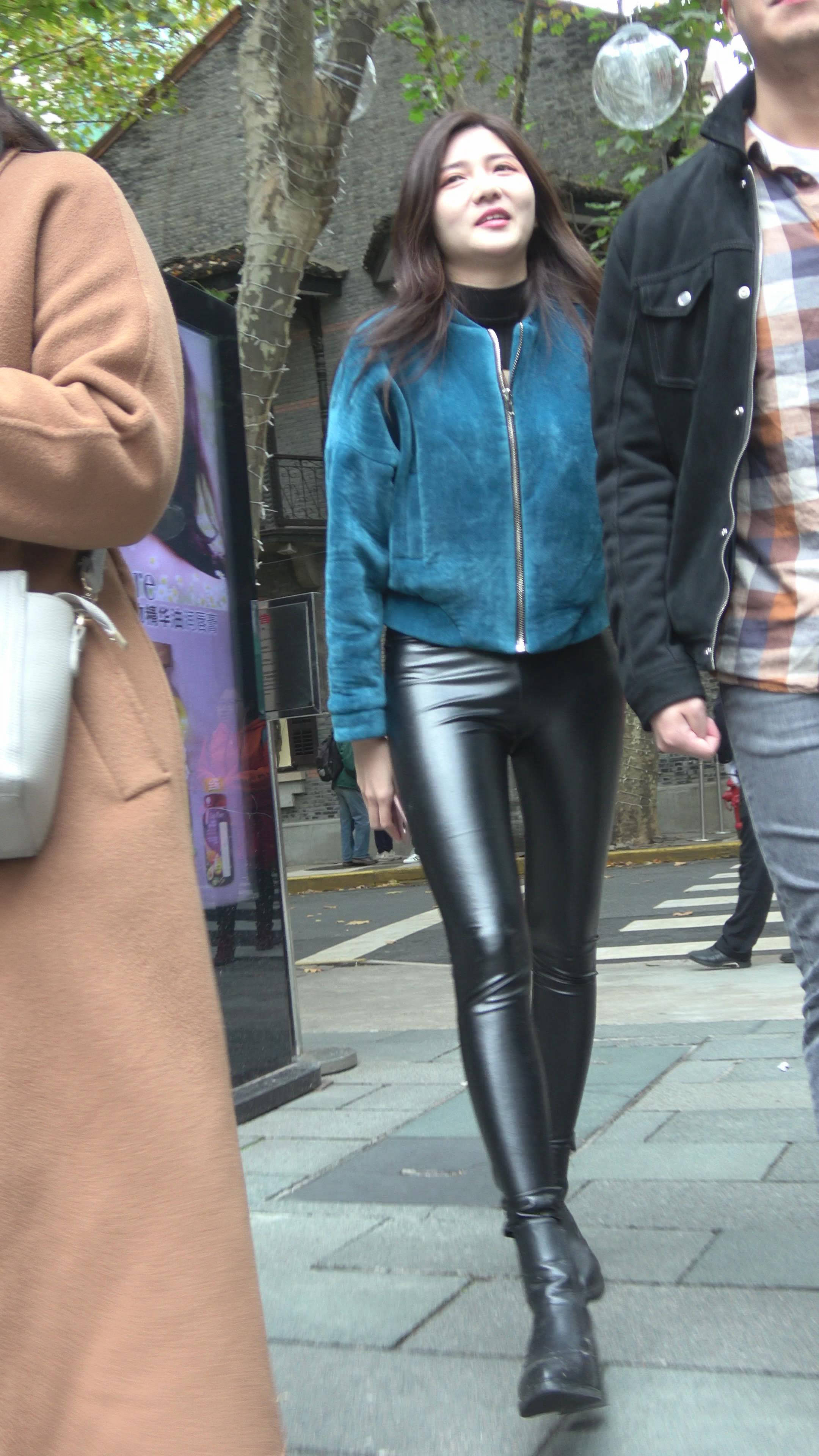 4K - 黑色紧身街拍皮裤性感美女 编号7485