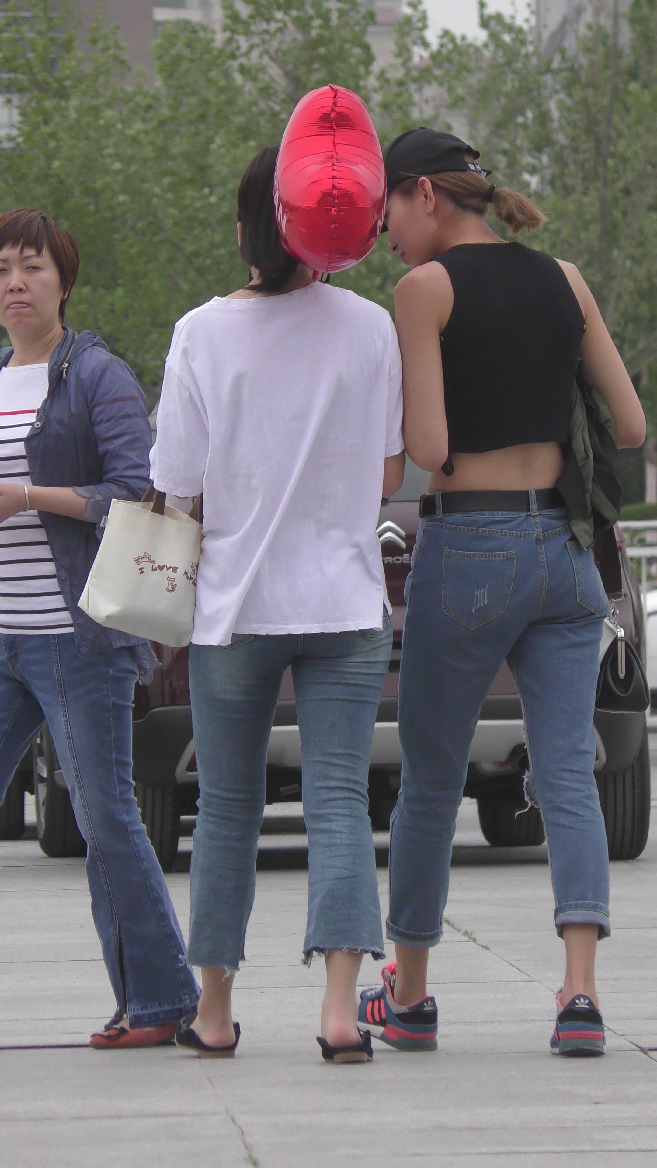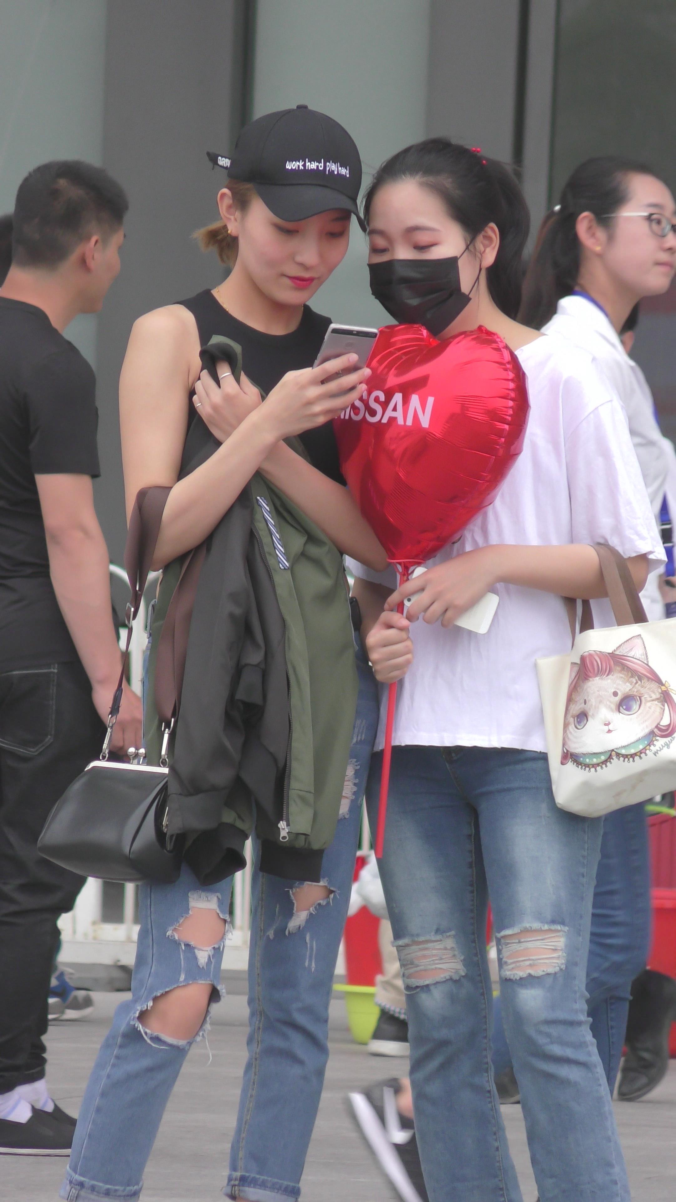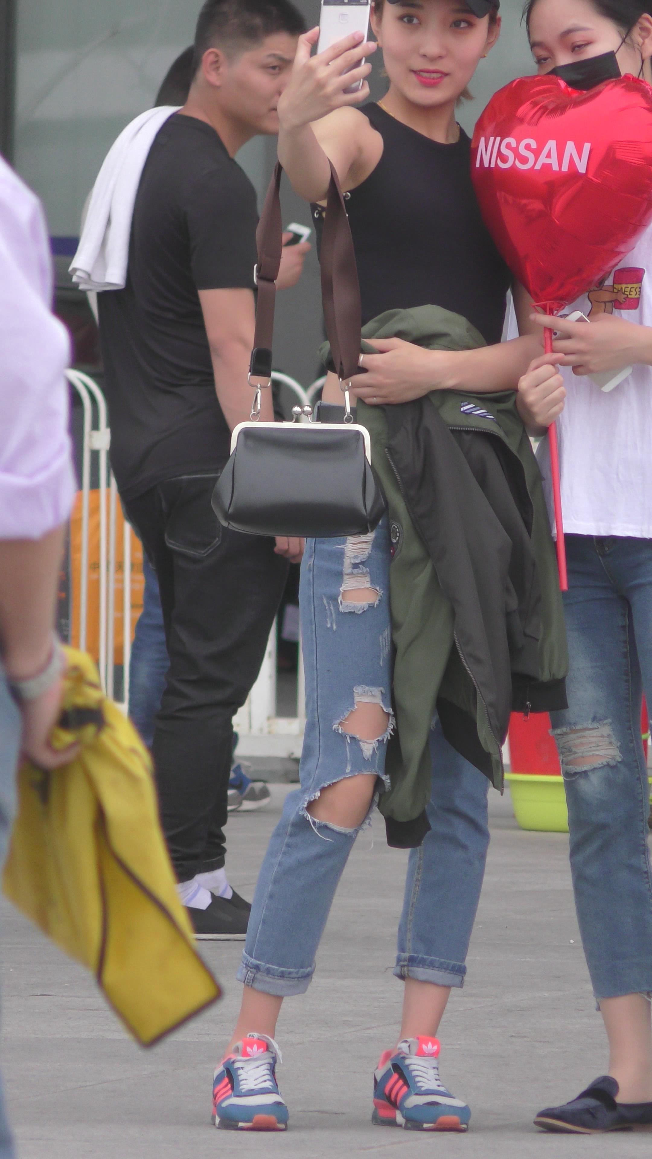 4K - 街拍鸭舌帽极品破洞紧身牛仔美女 编号3353