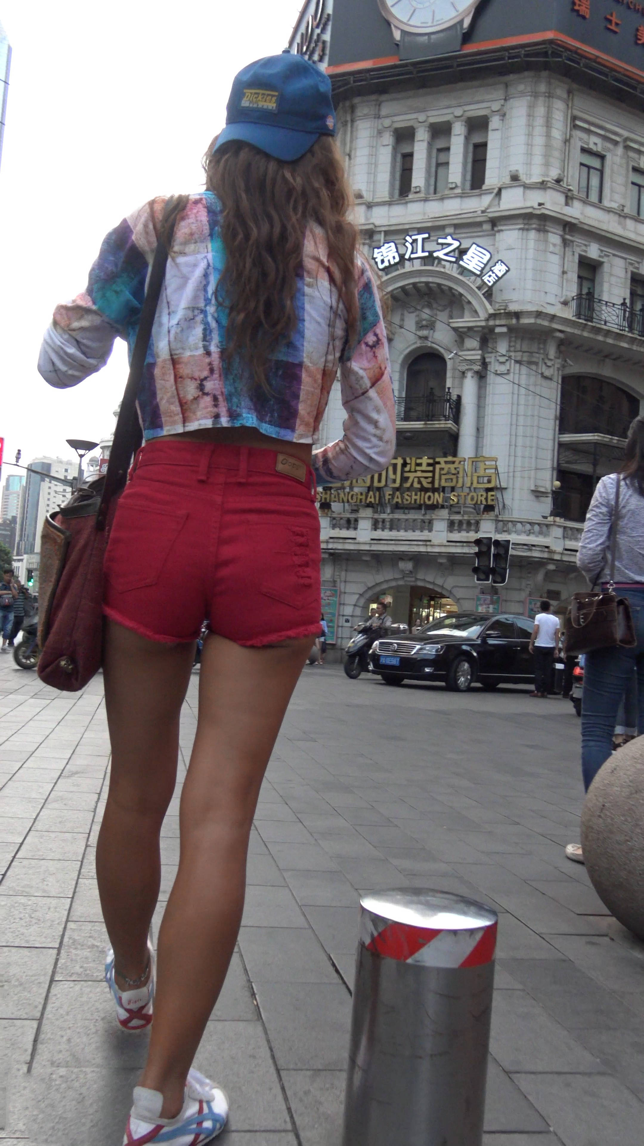 4k-街拍皮肤黝黑的红色高腰短热裤女孩 编号7542