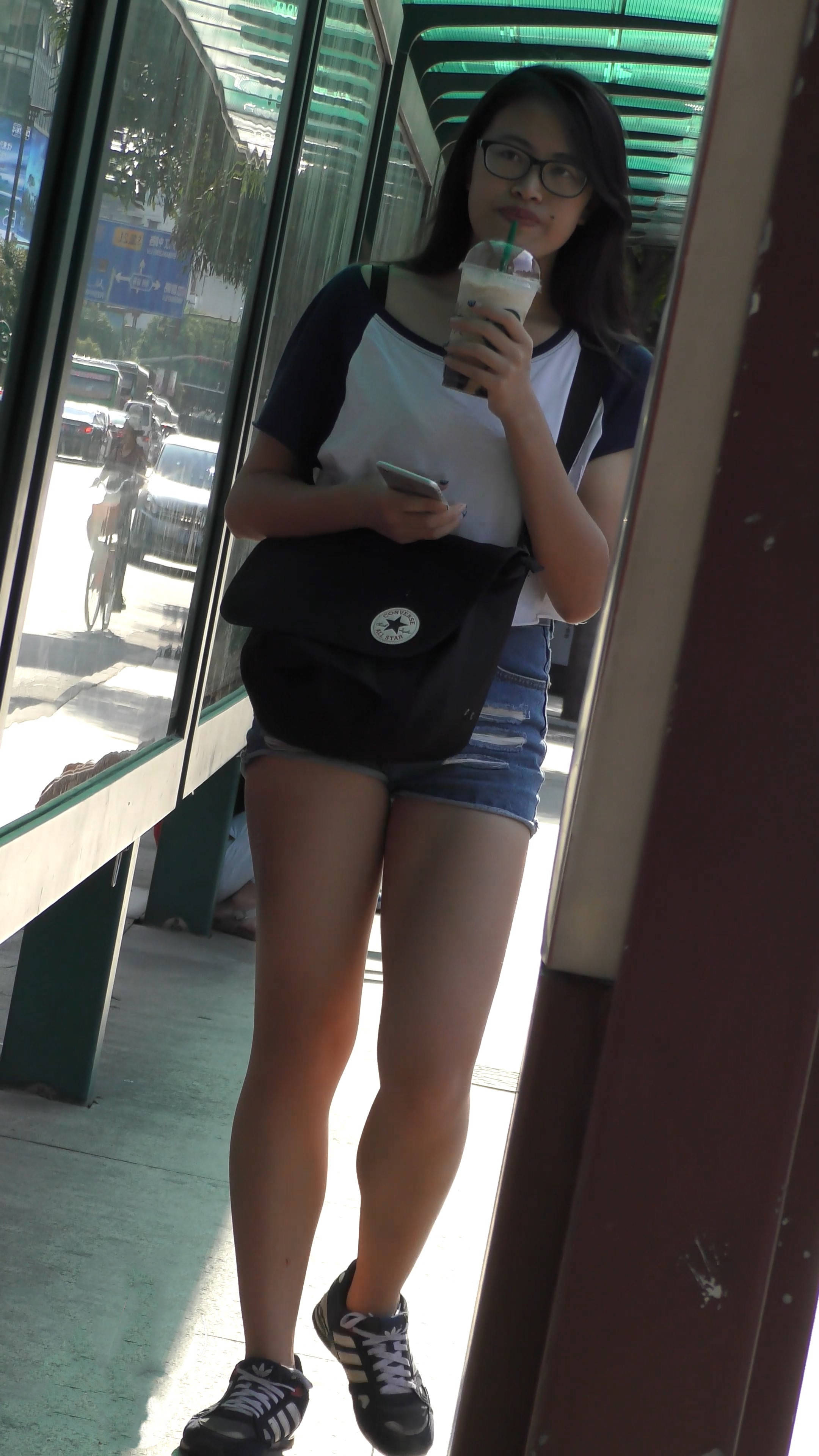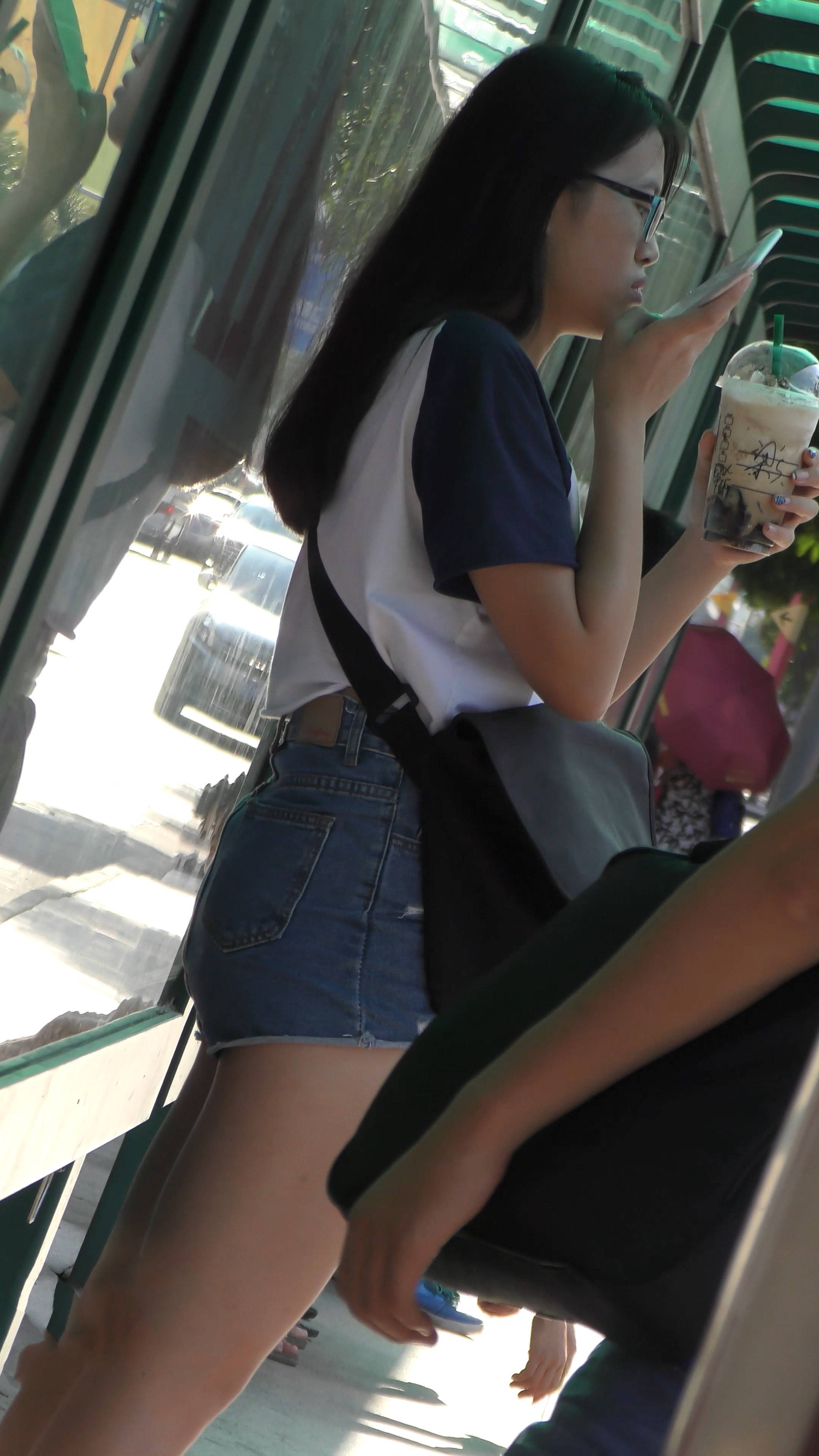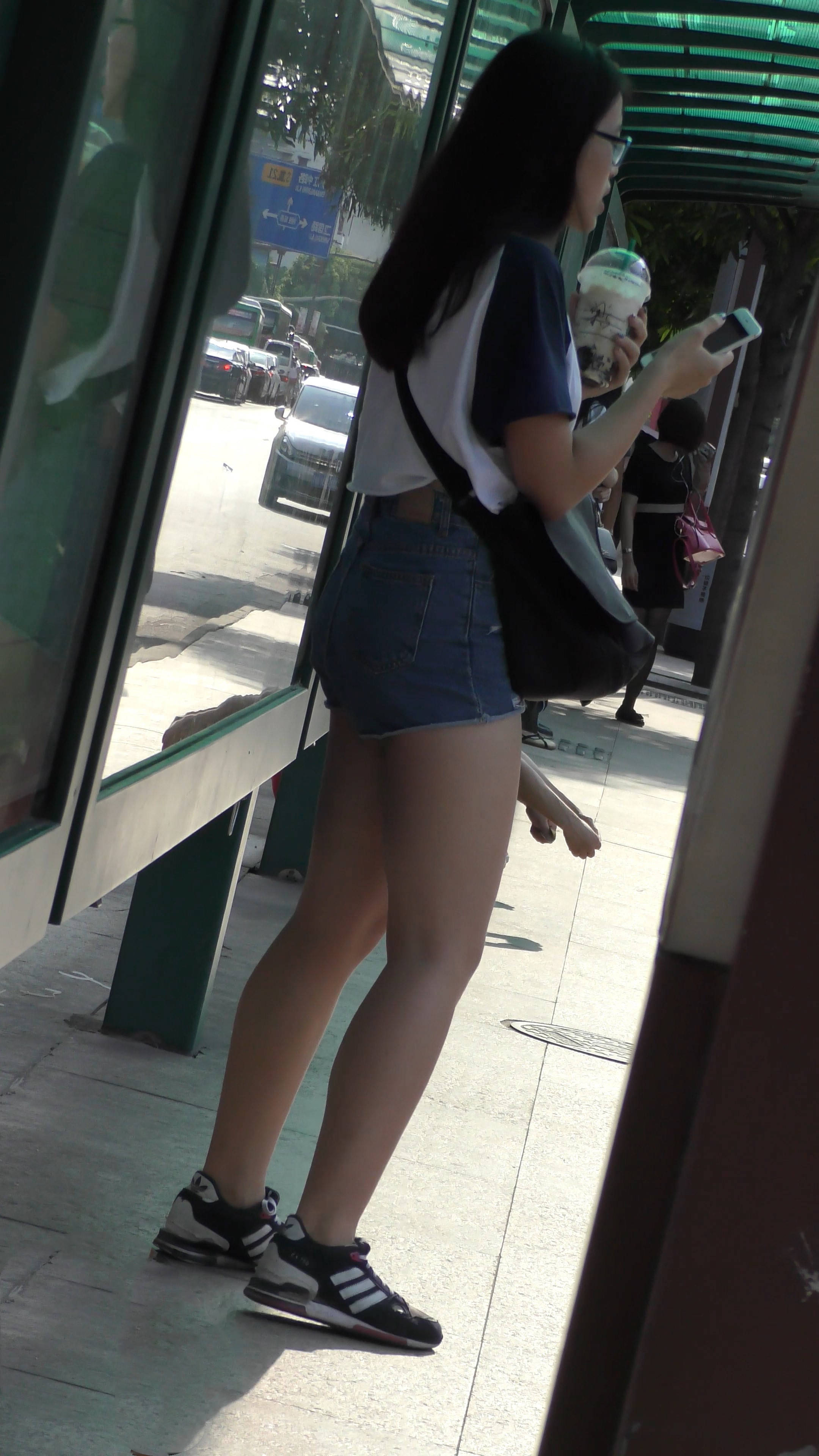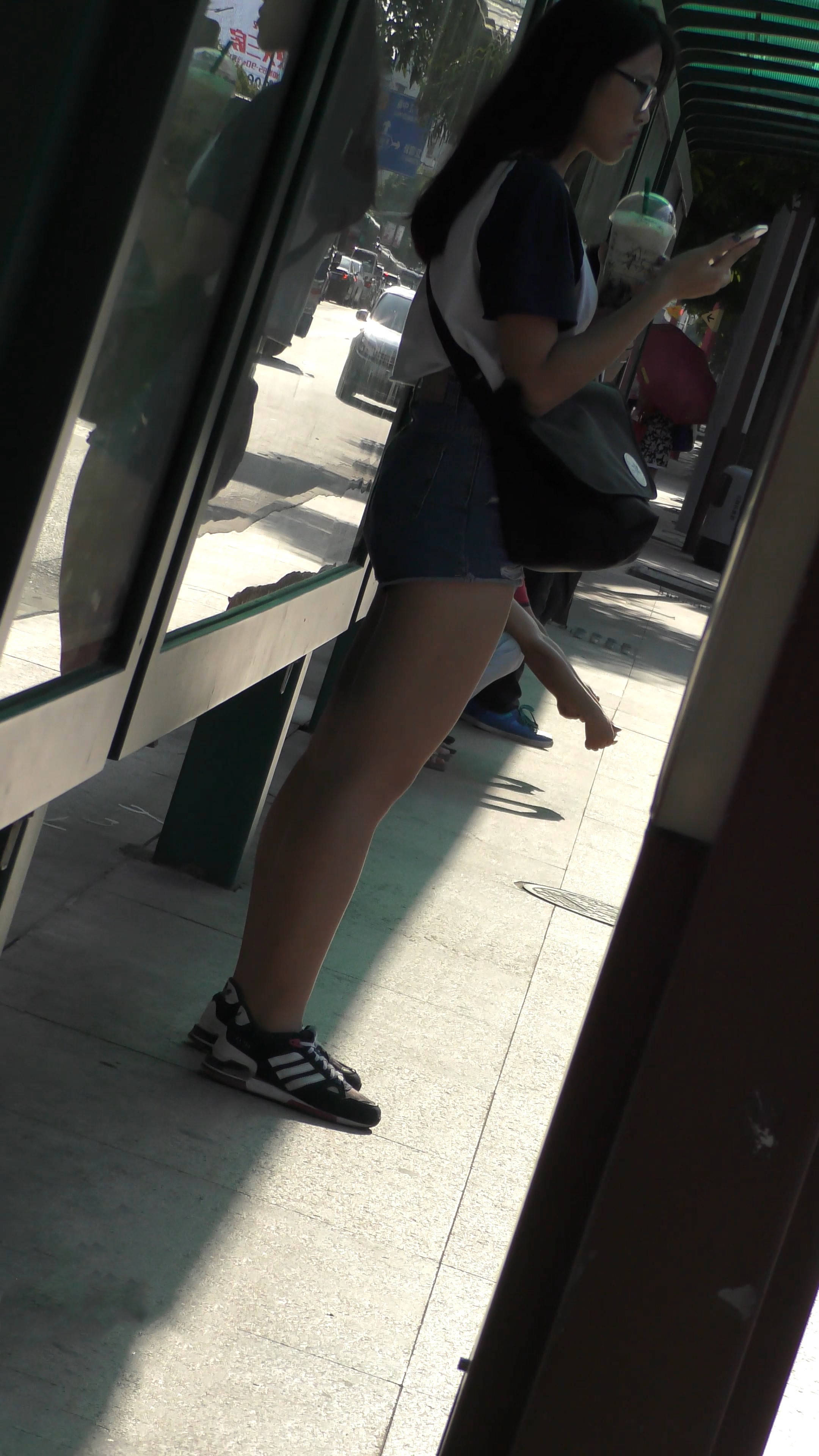 4k-公交站拍摄牛仔热裤长腿妹纸 编号7592