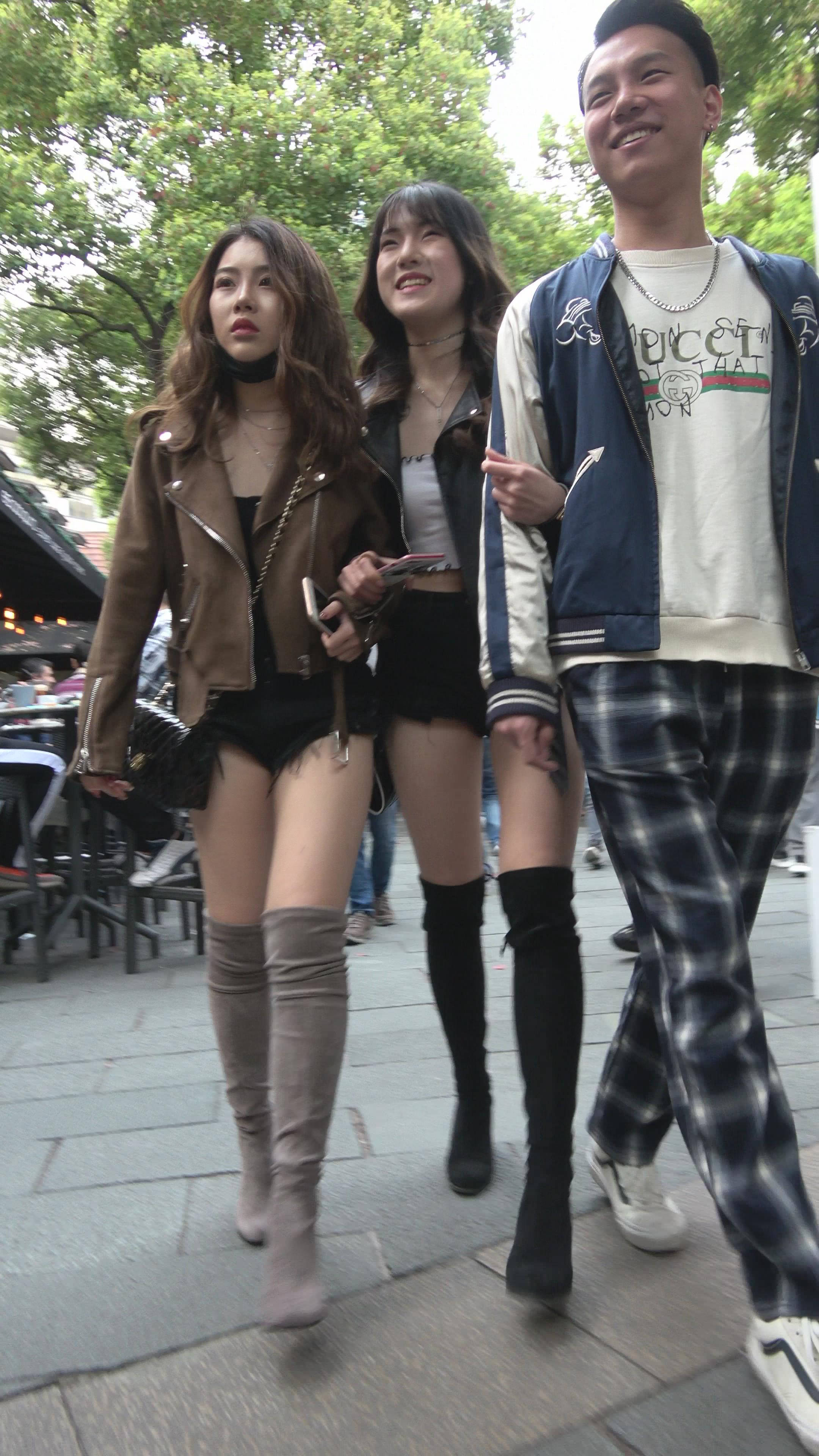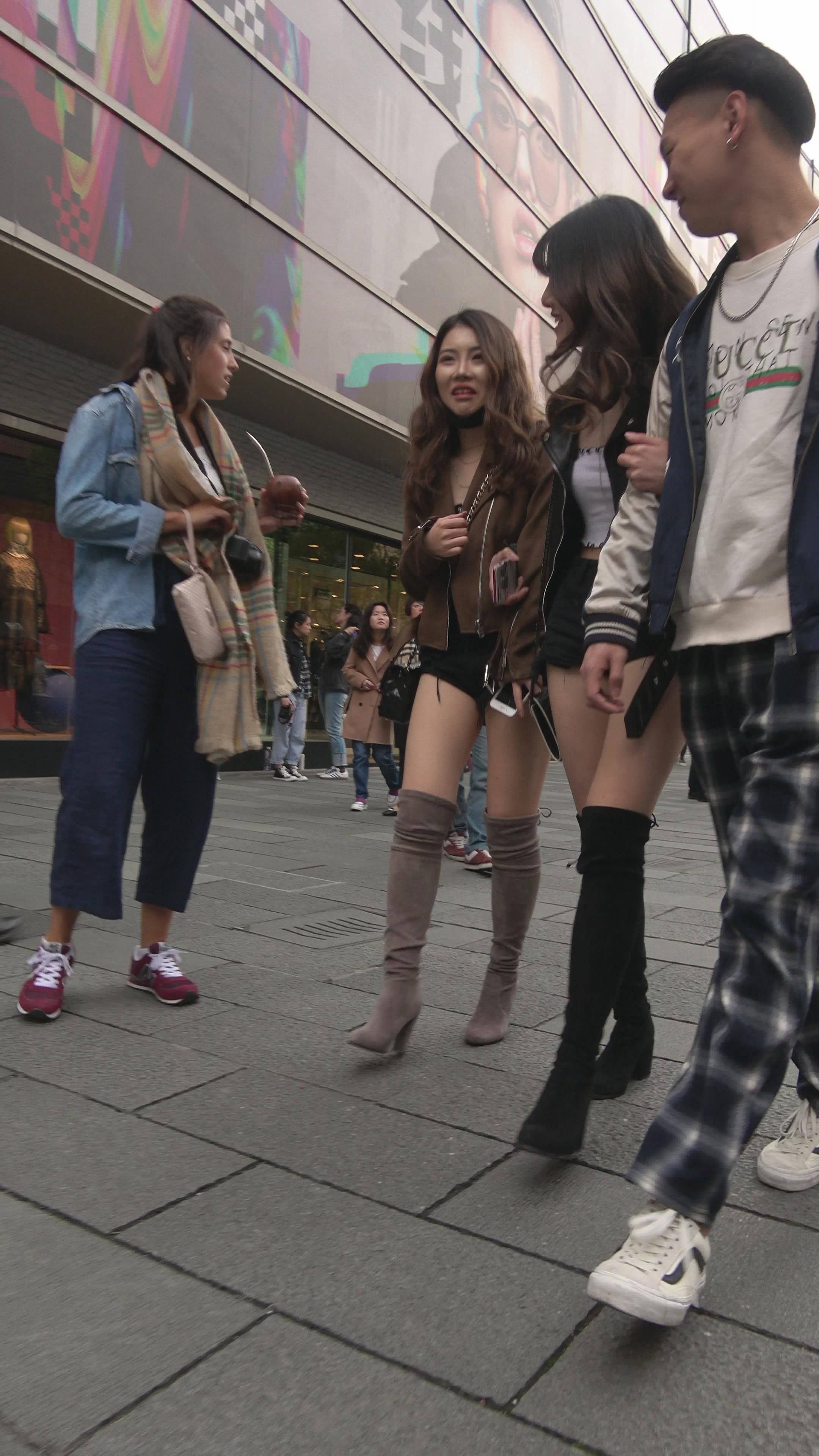 4K - 黑色口罩长筒靴超短热裤街拍美腿美女姐妹 编号7728