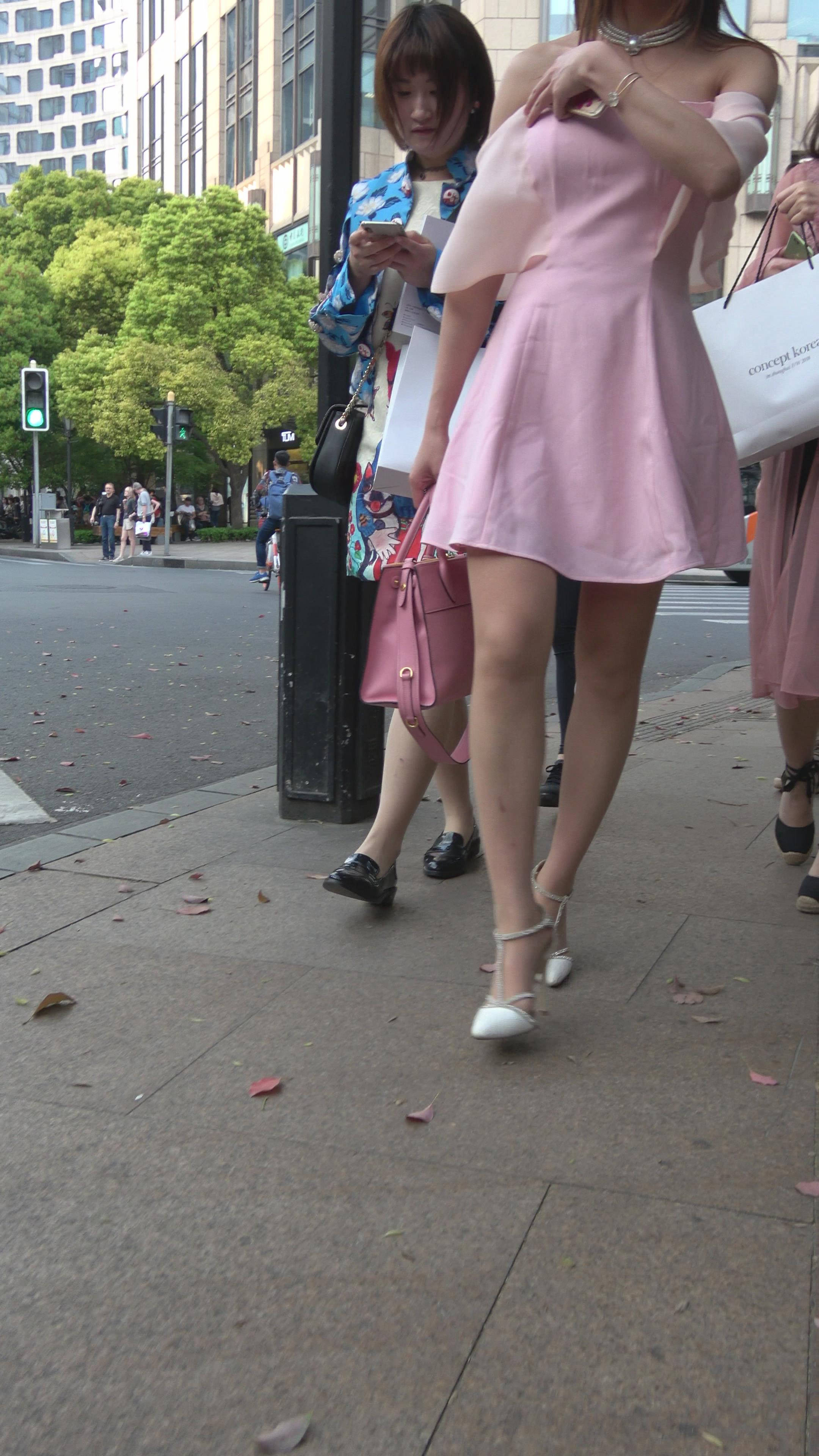 4K - 粉色抹胸连衣裙街拍气质美腿美女姐姐 编号7737