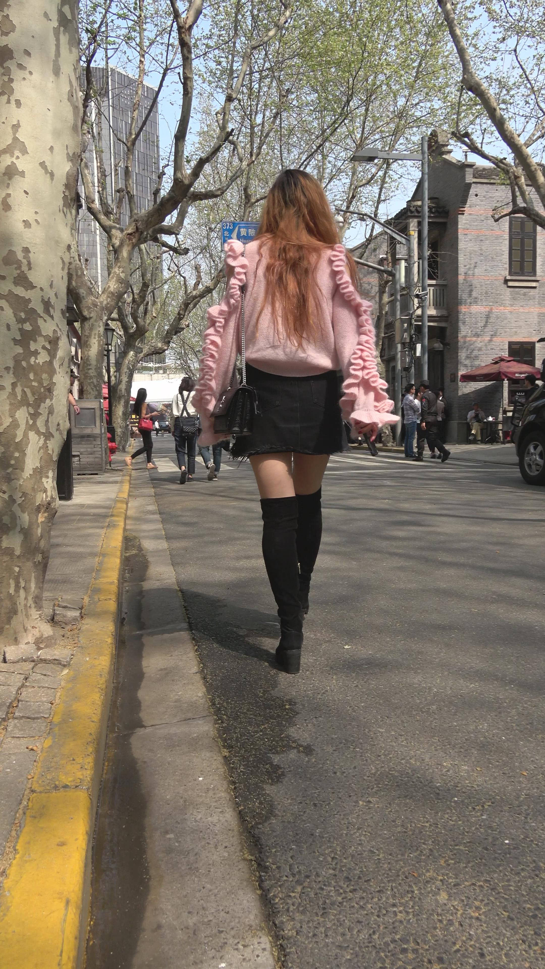 4K - 粉衣街拍美腿性感大美女 编号7758