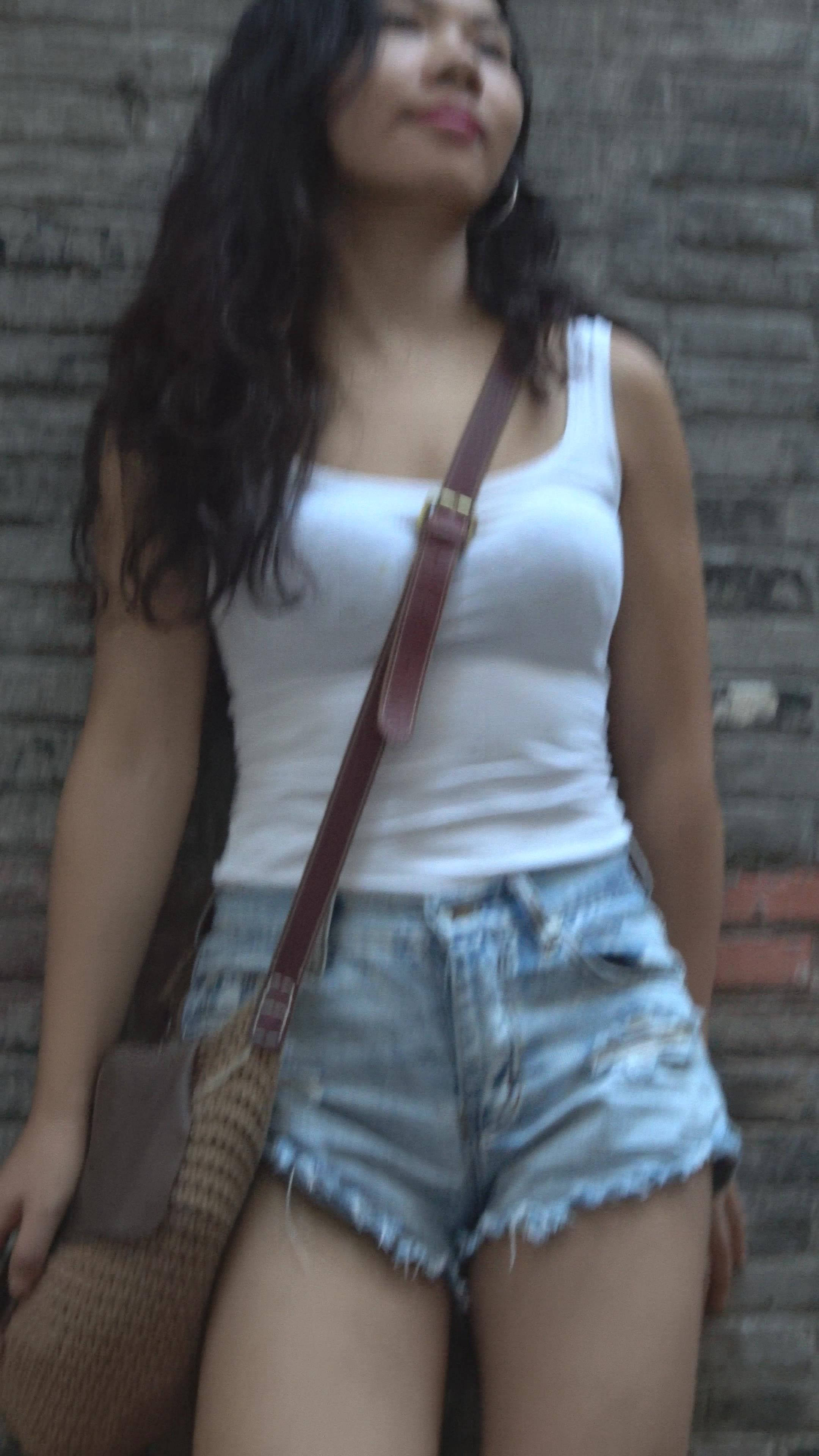 紧身背心高腰牛仔热裤街拍美女摆拍 编号7797