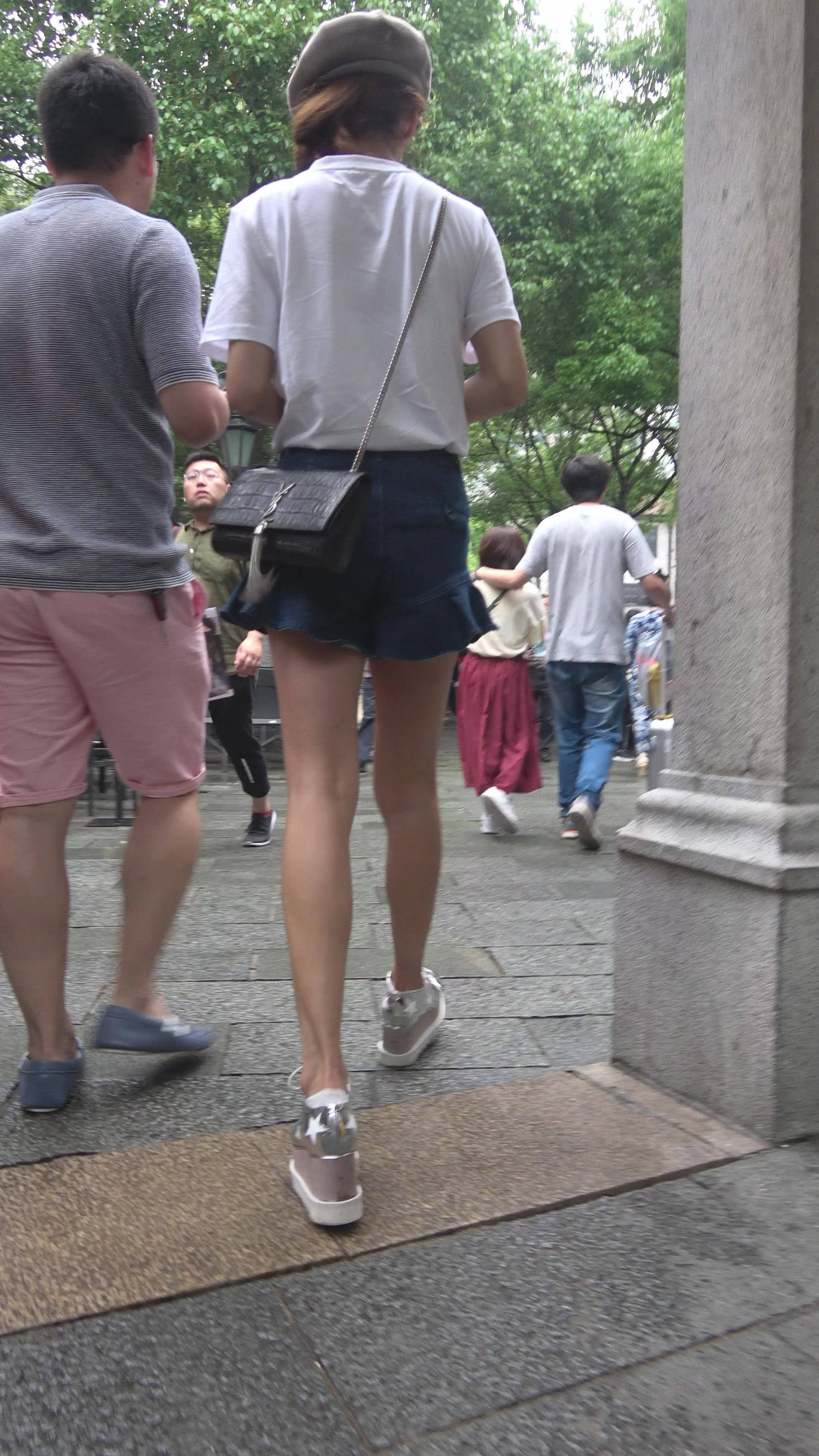 4K 街拍身材苗条的白T恤牛仔短裙美女 编号7875