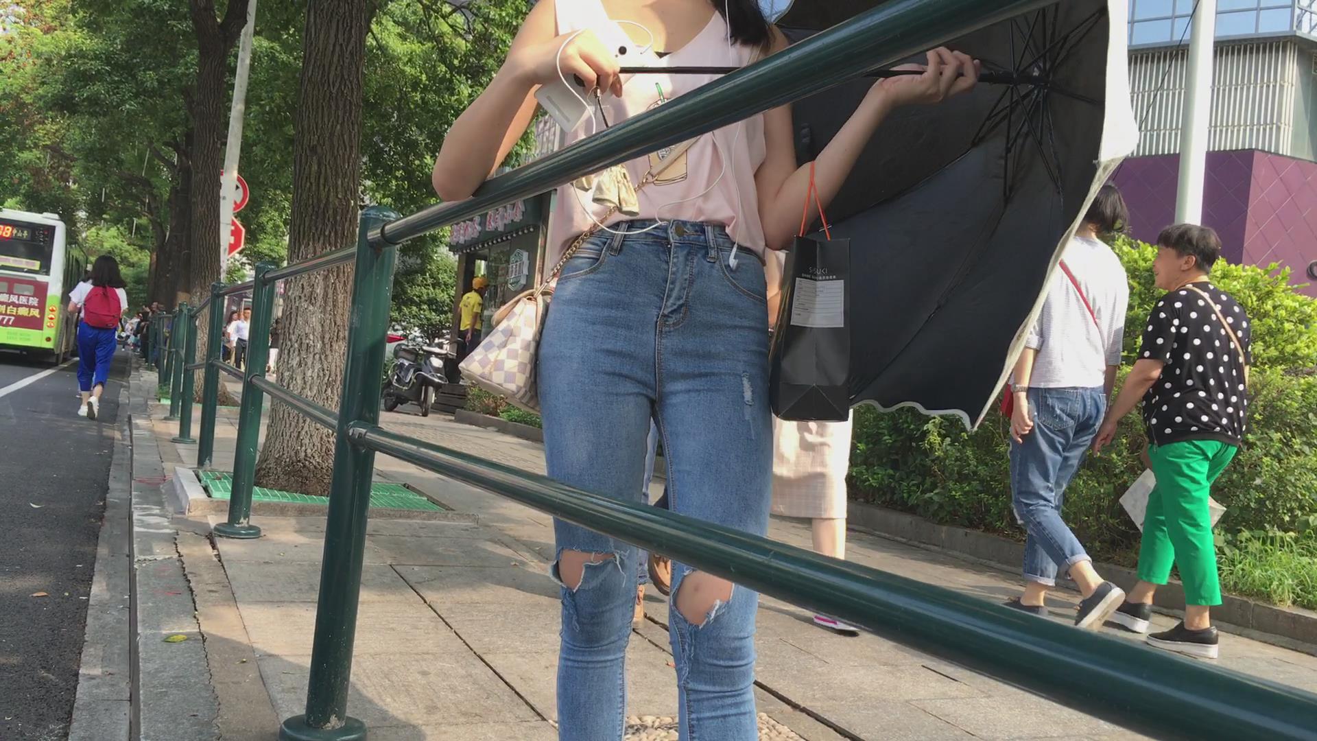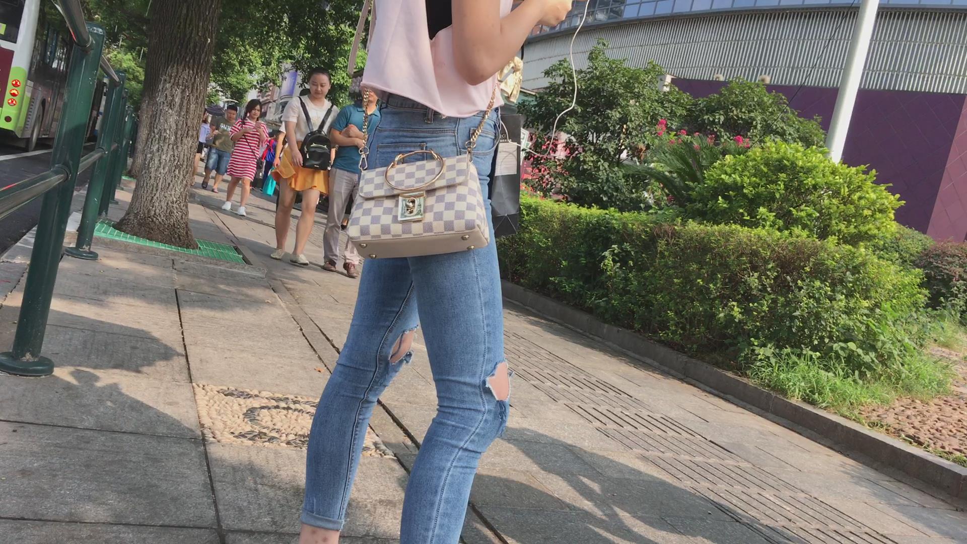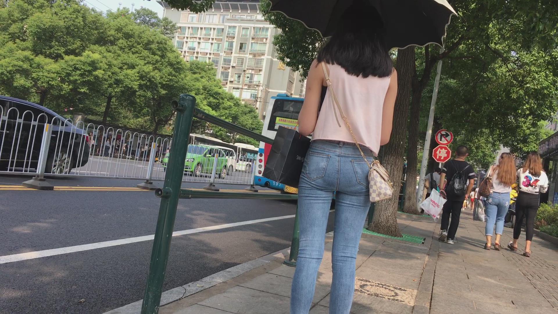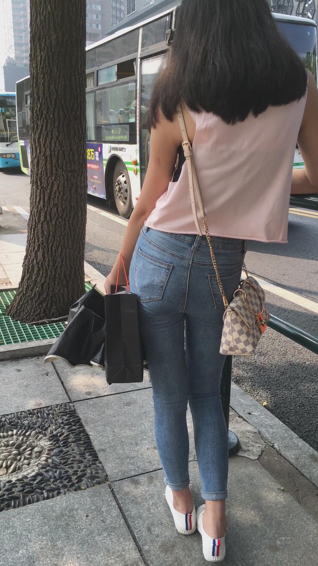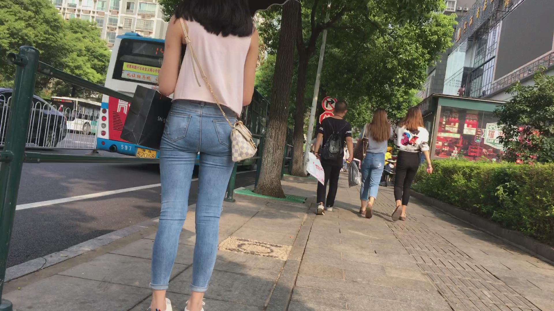 街拍极品紧绷蓝色牛仔裤小清新美女 编号6076