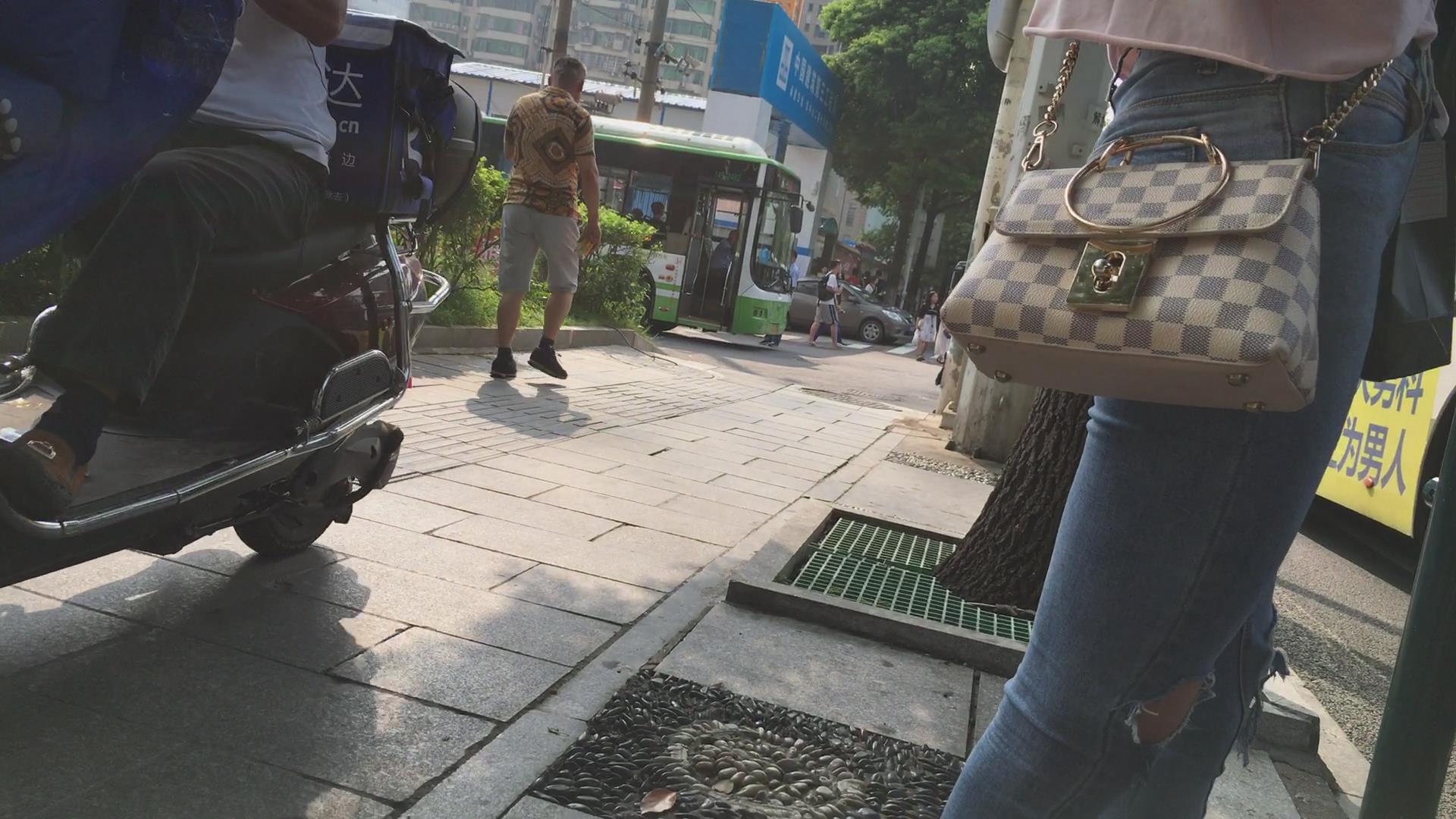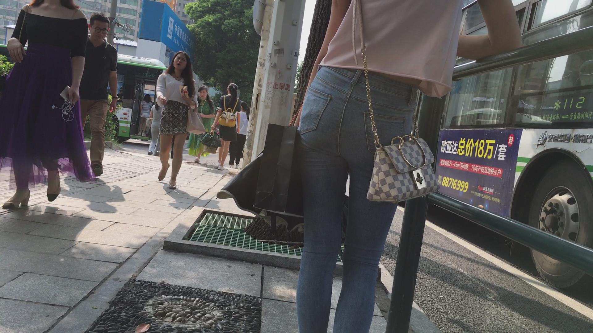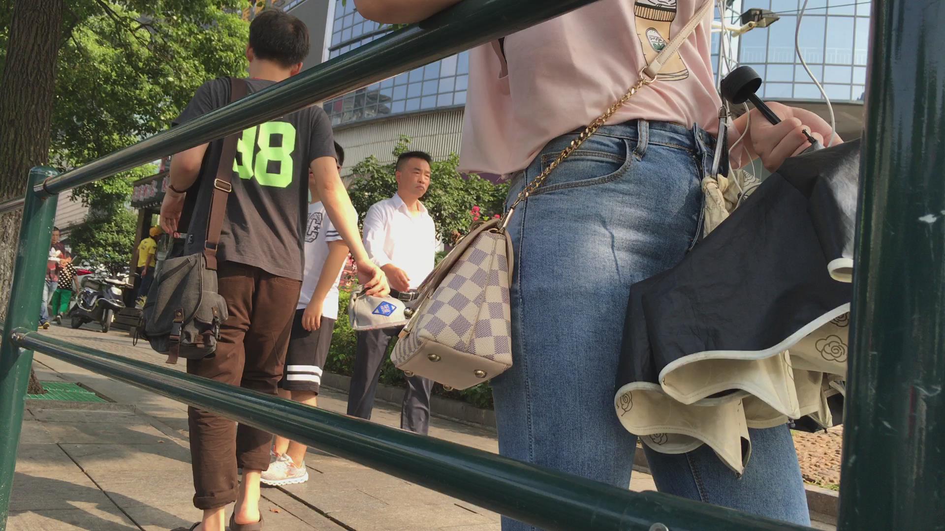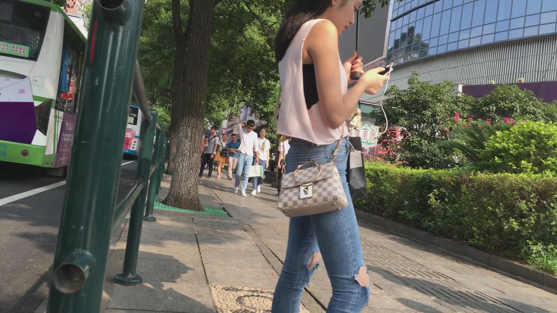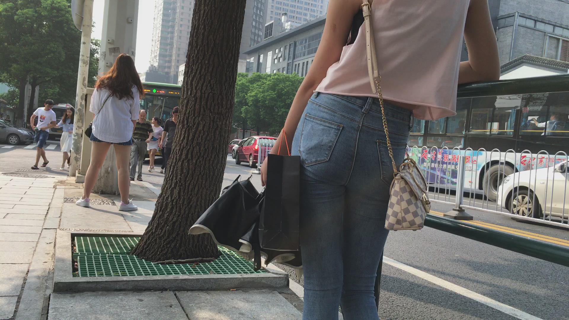 街拍极品紧绷蓝色牛仔裤小清新美女 编号6076