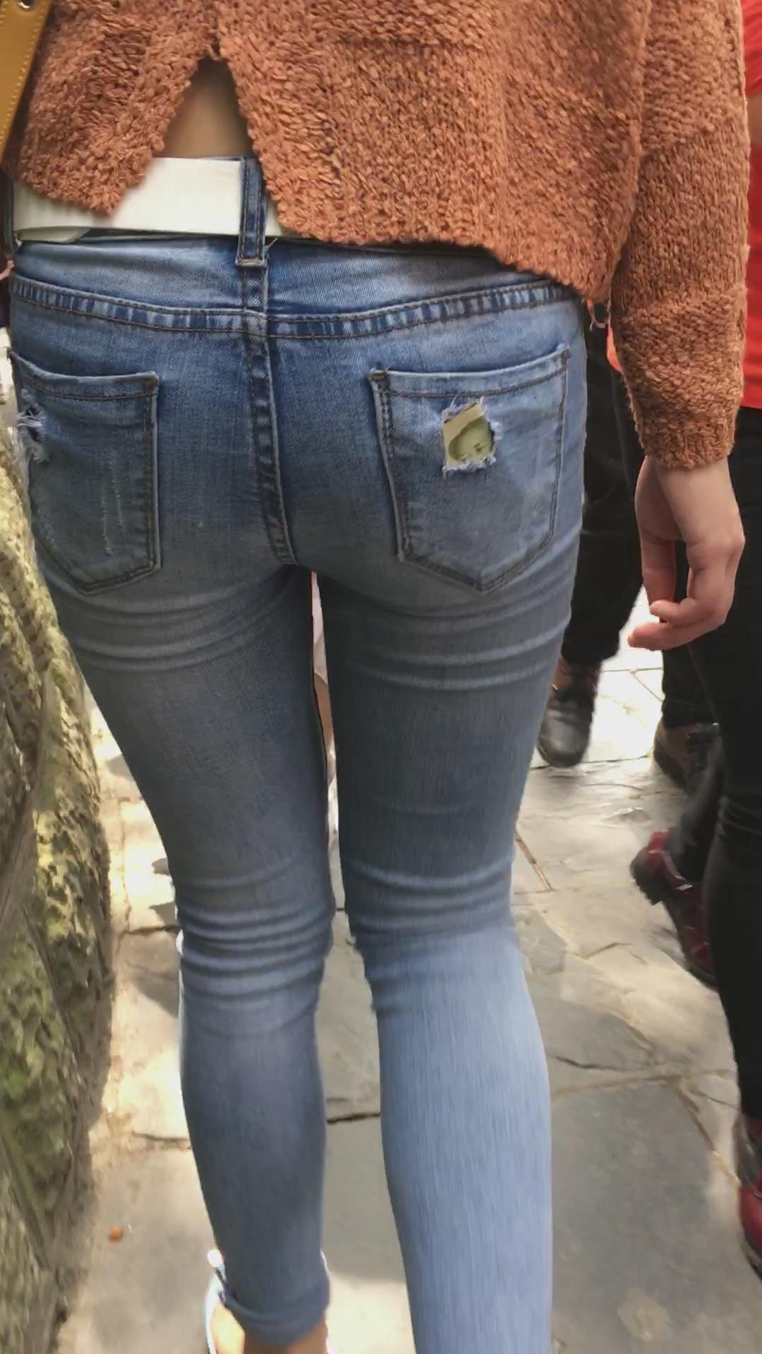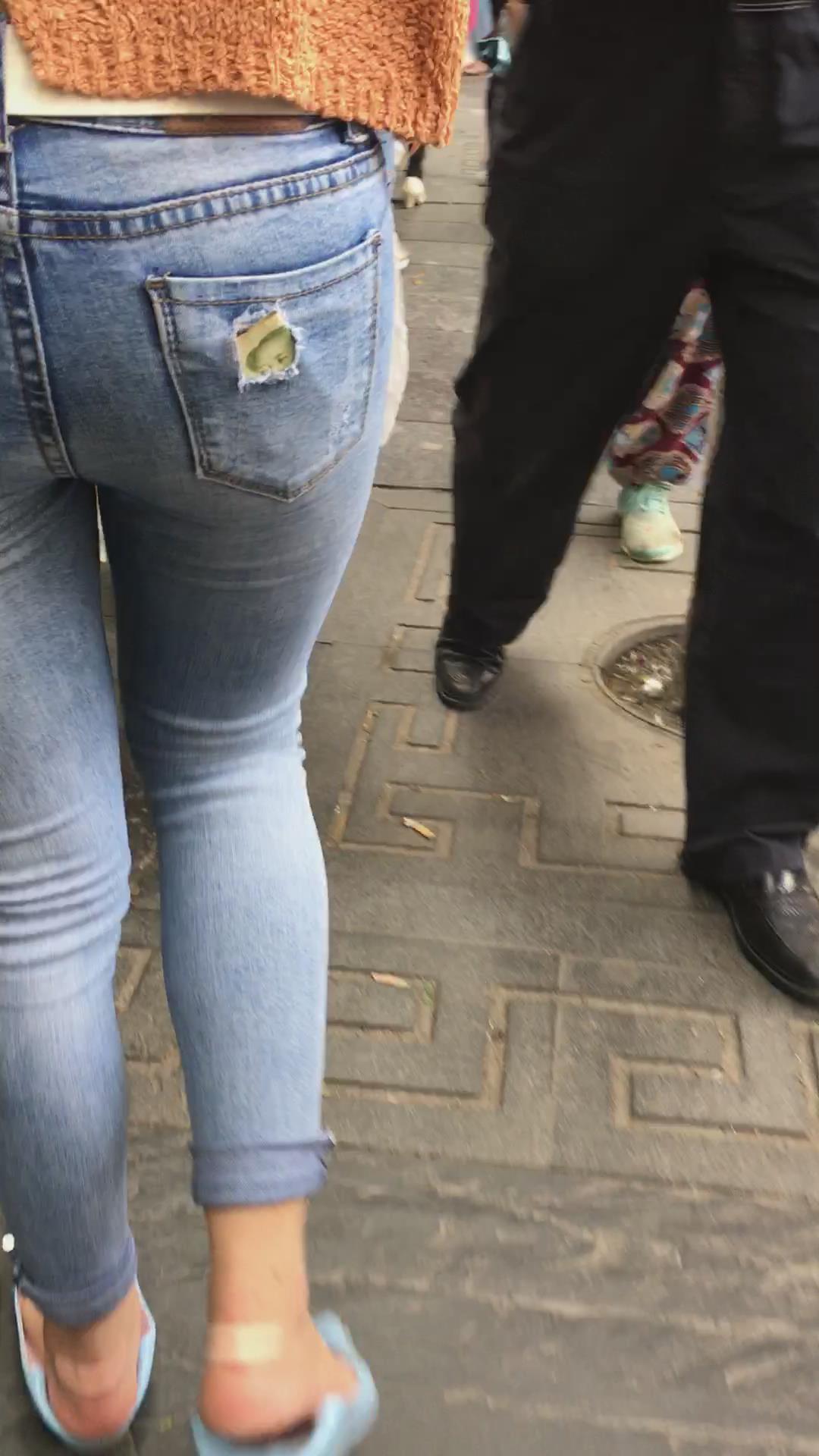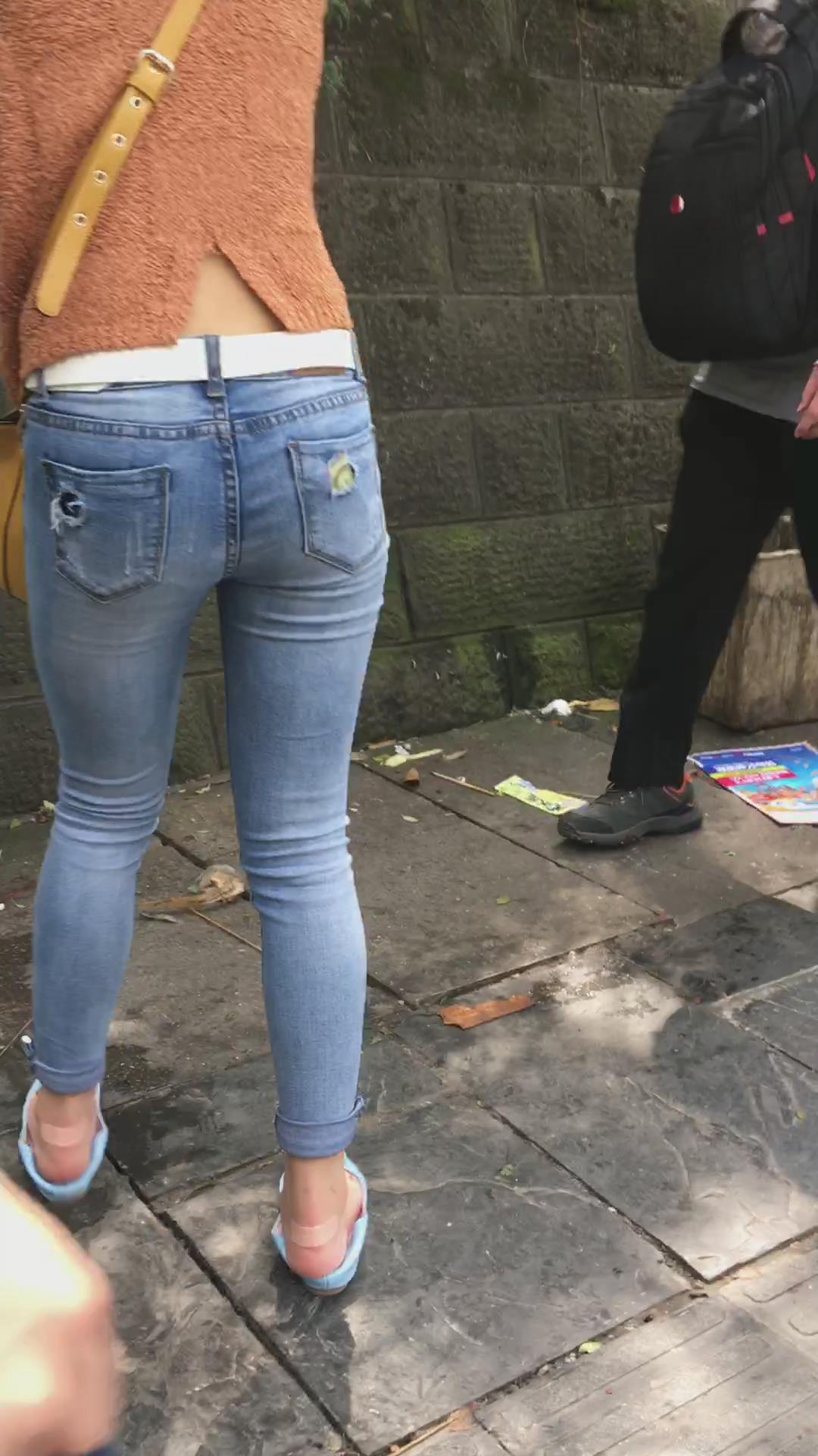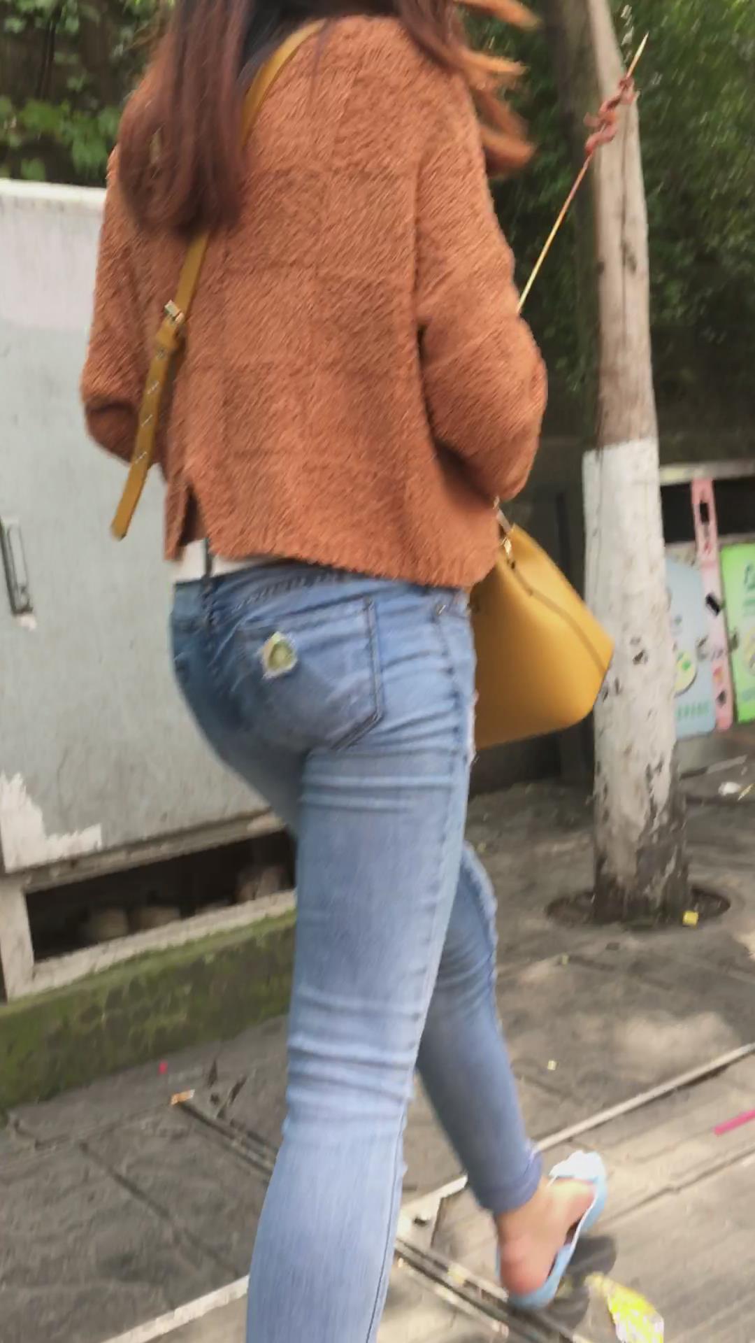 街拍蓝色紧身牛仔裤小美女 编号5233
