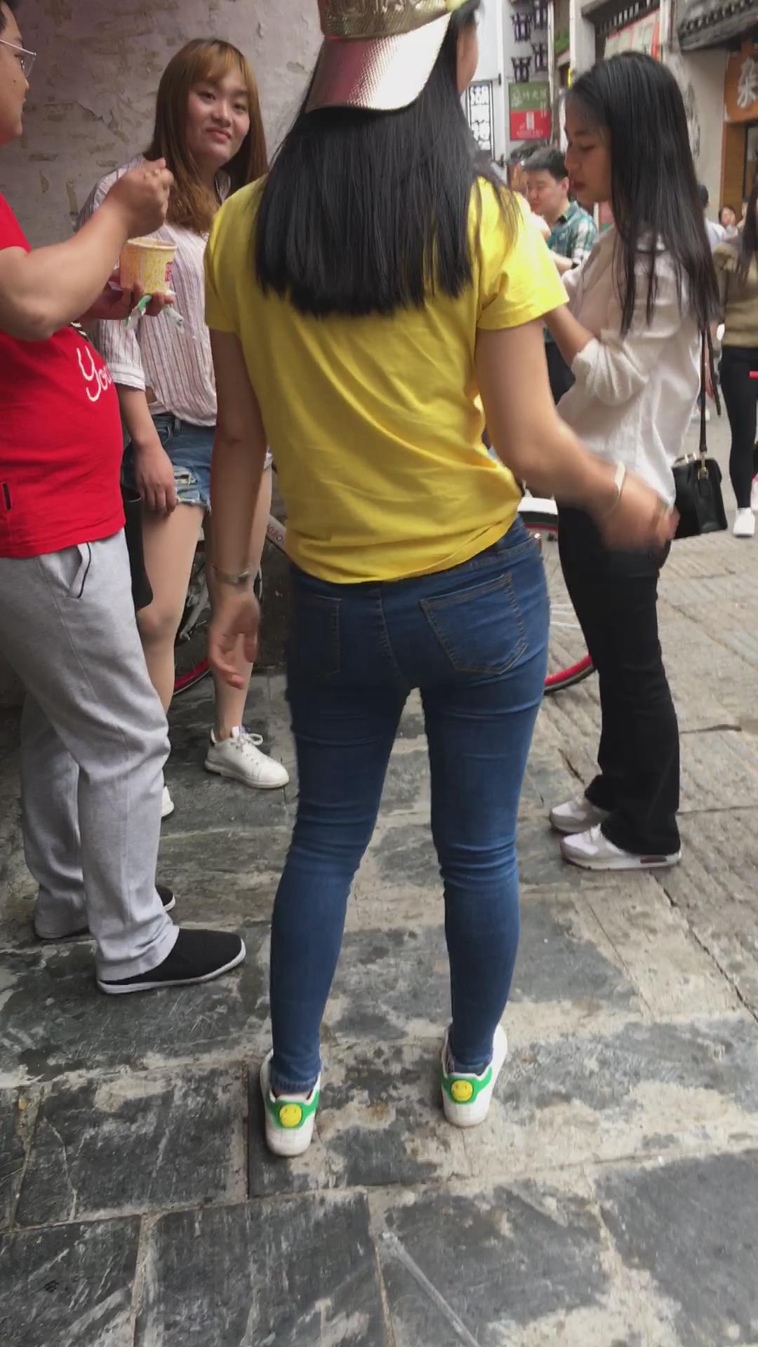 街拍黄T恤紧身牛仔裤美女 编号5272
