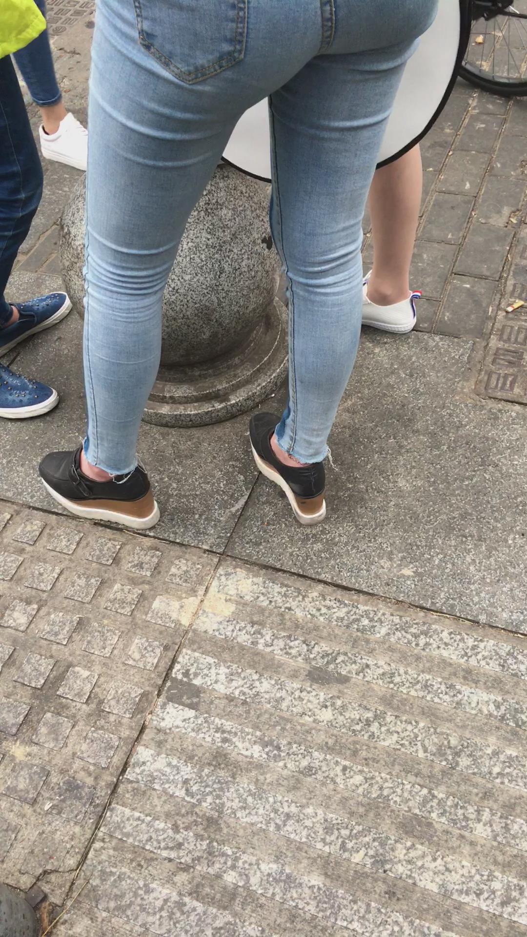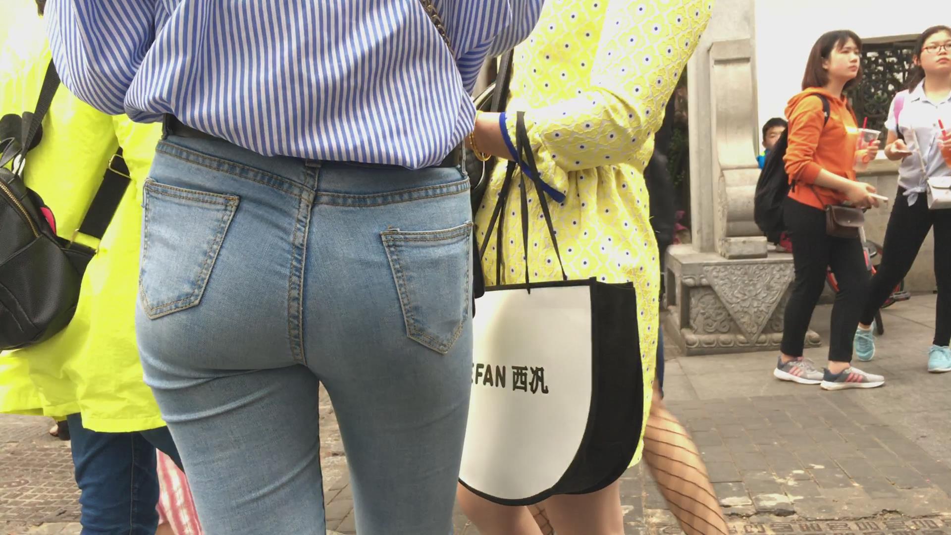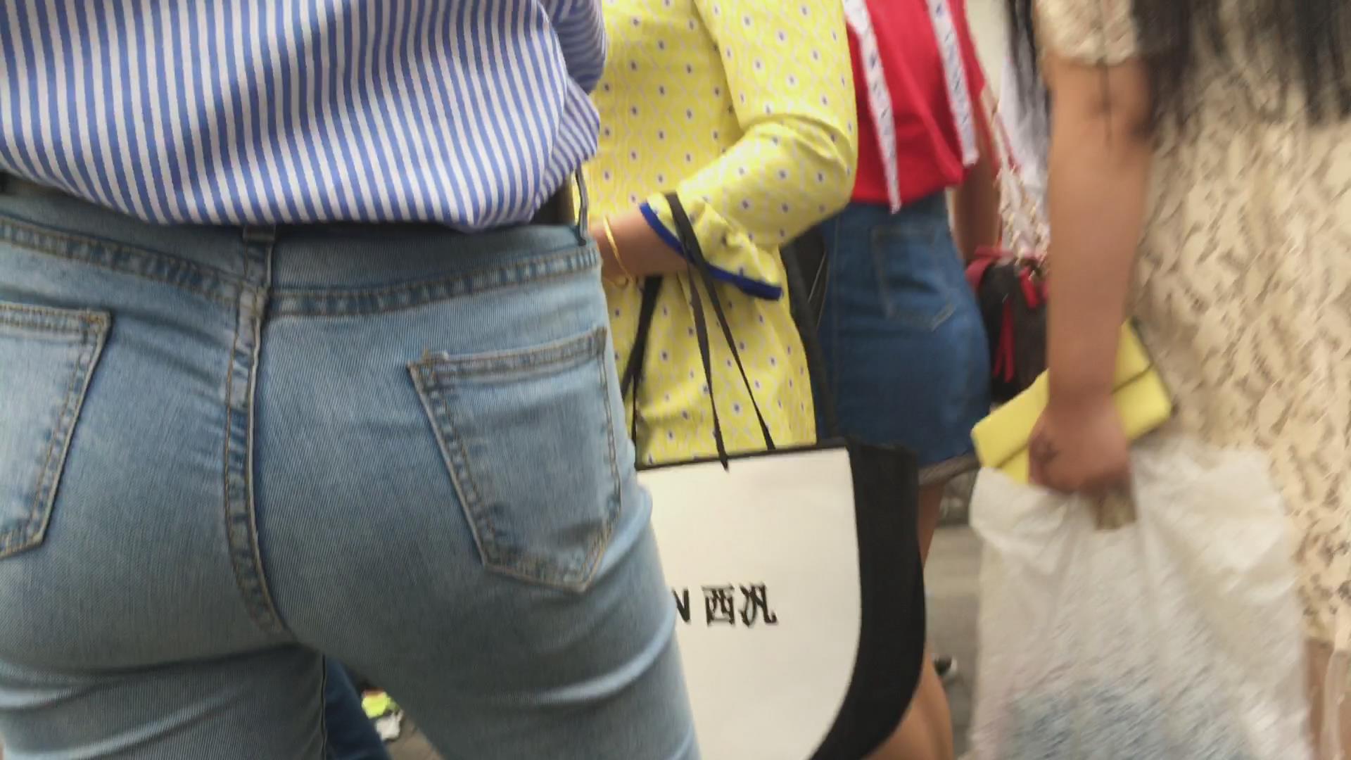 街拍宽臀紧身蓝色牛仔裤妹子 编号5273