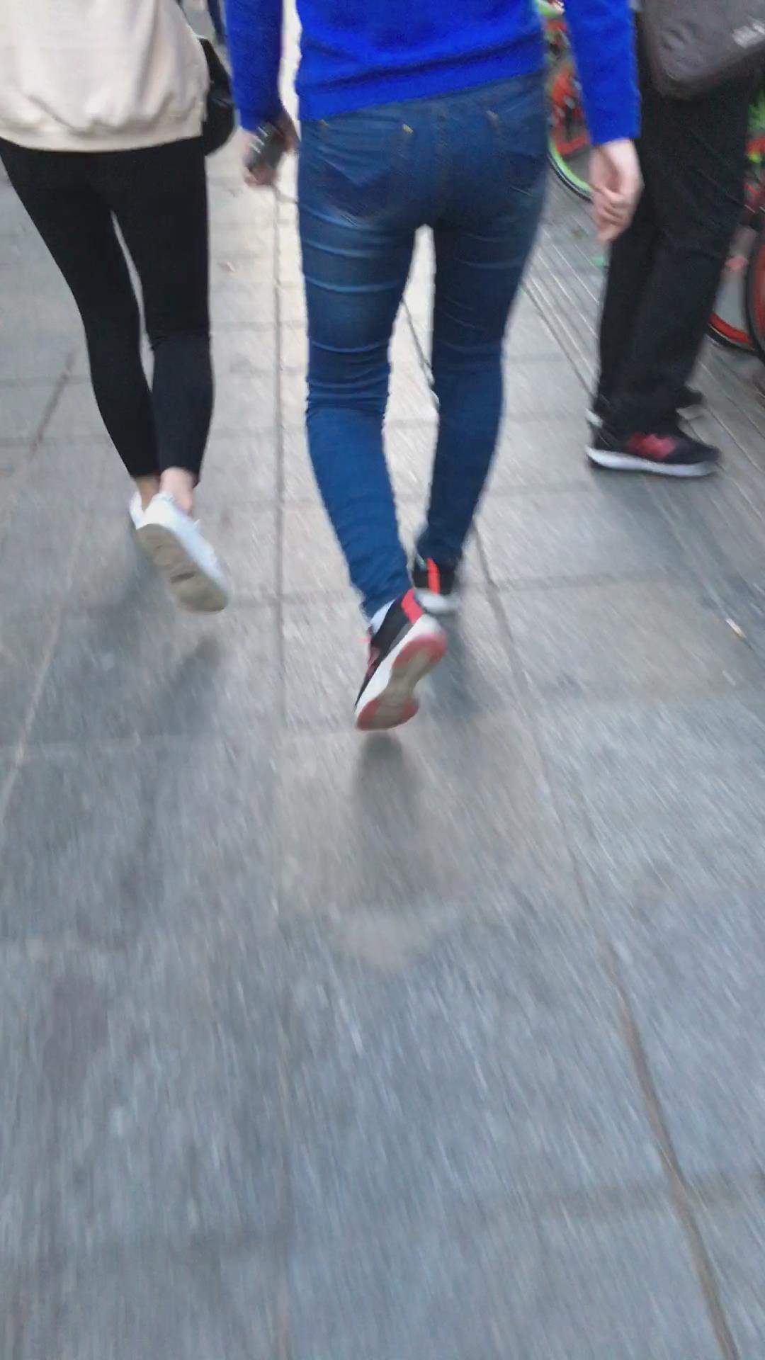 蓝色毛衣街拍紧身牛仔裤圆臀少妇 编号5293