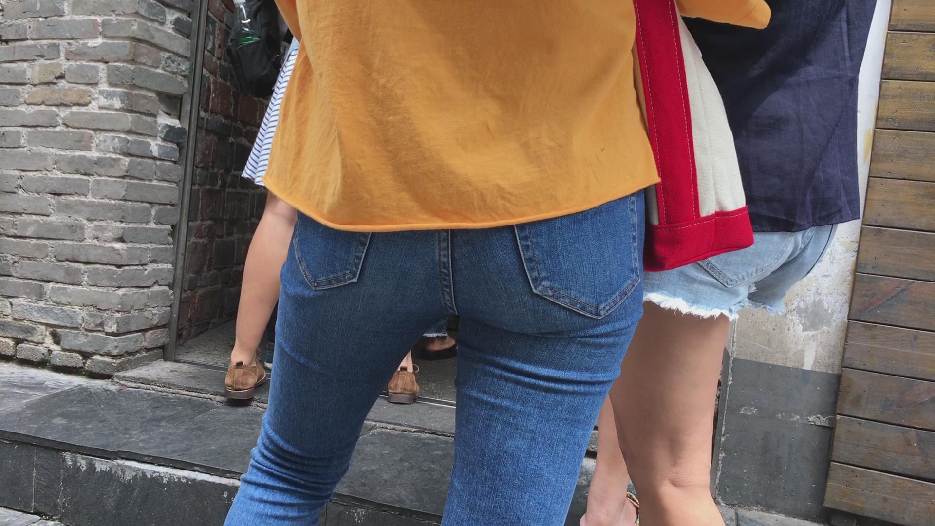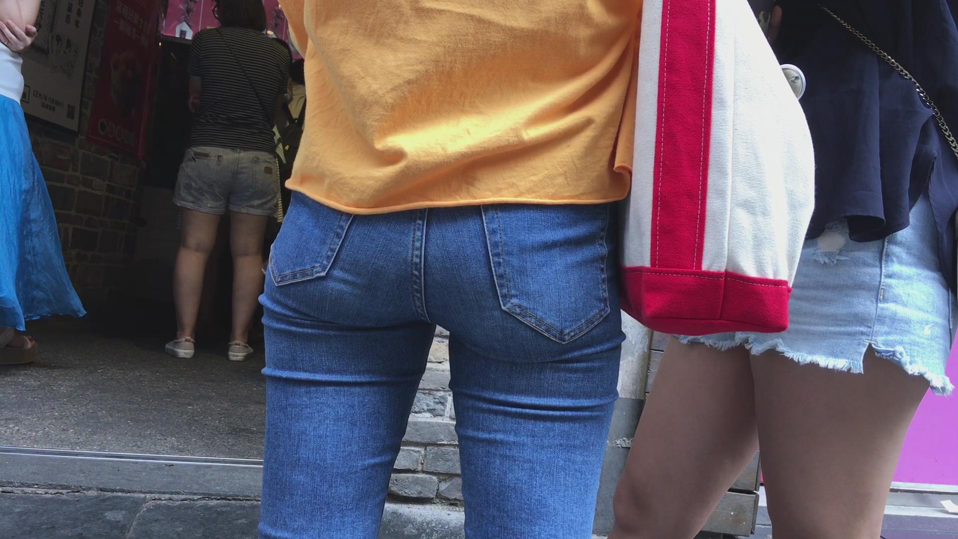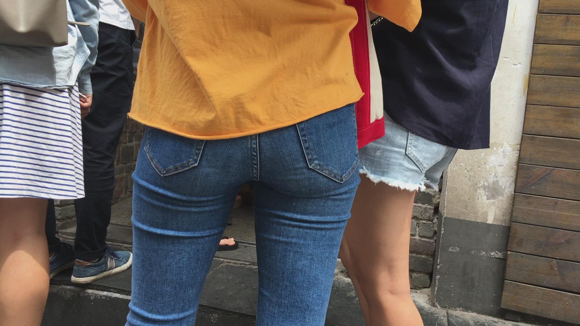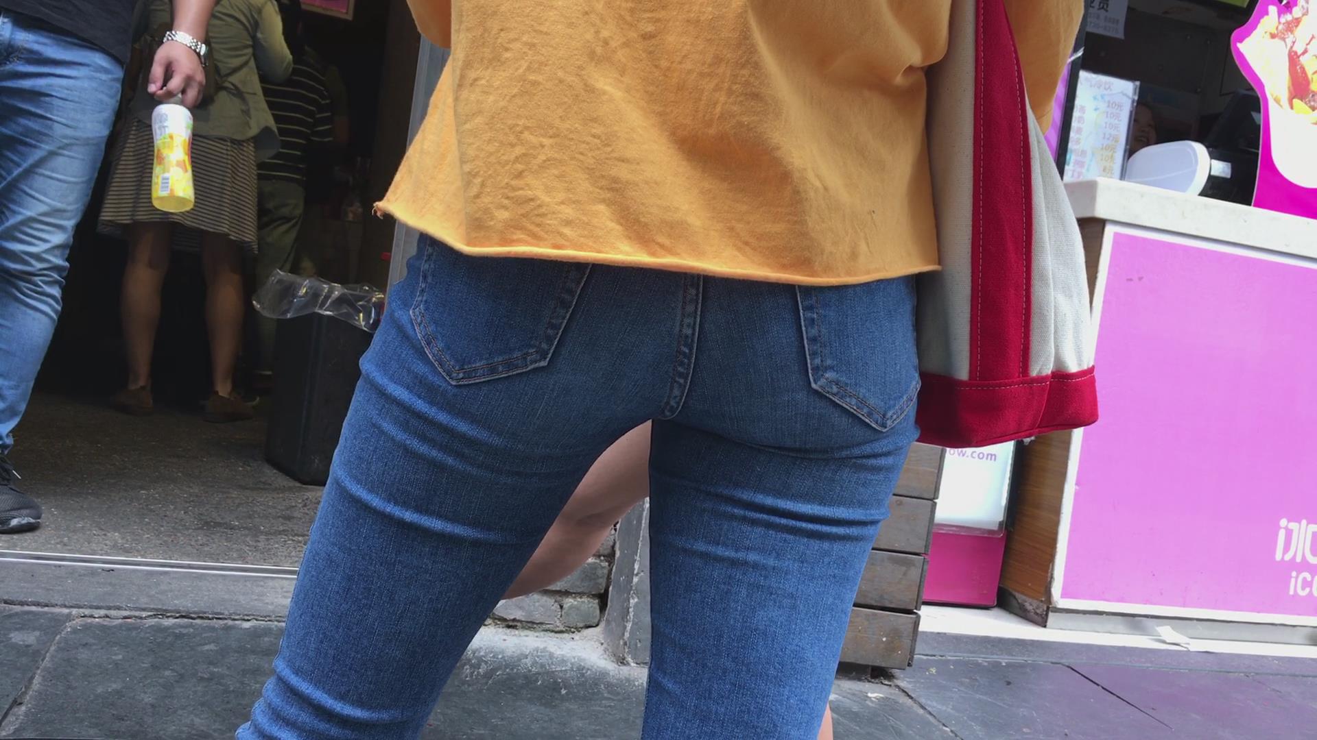 街拍黄衣紧身蓝色牛仔裤美女 编号5425