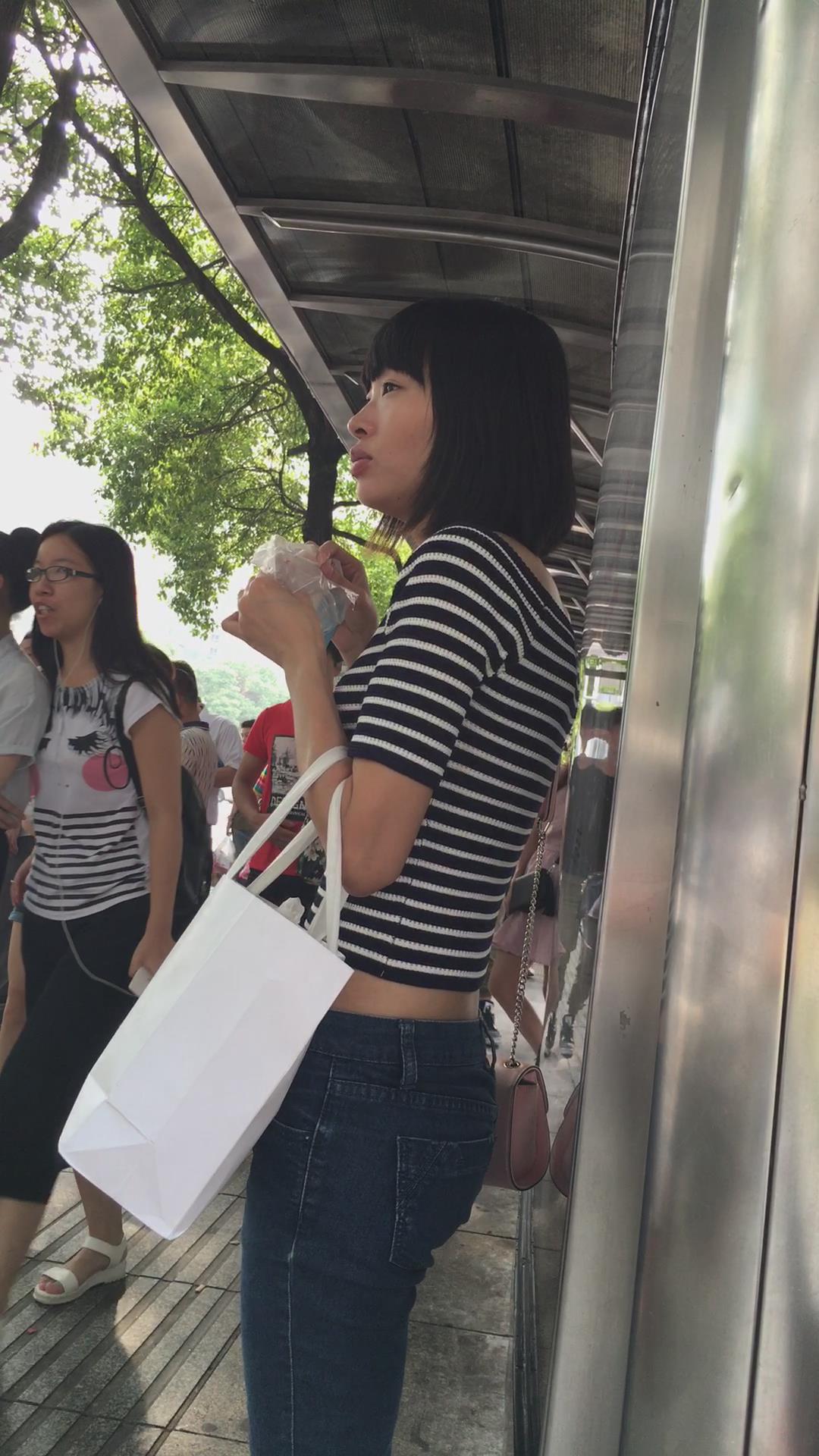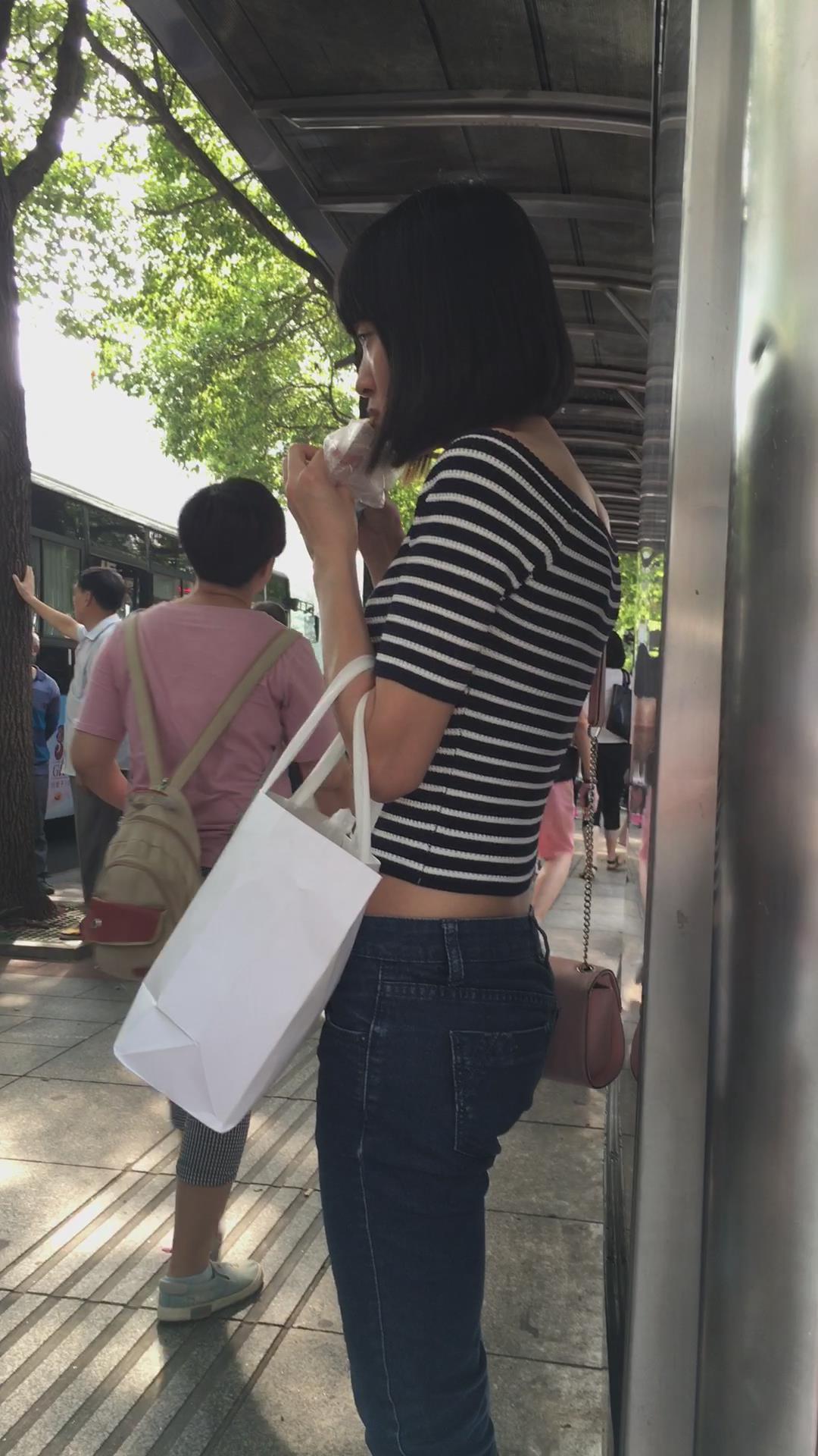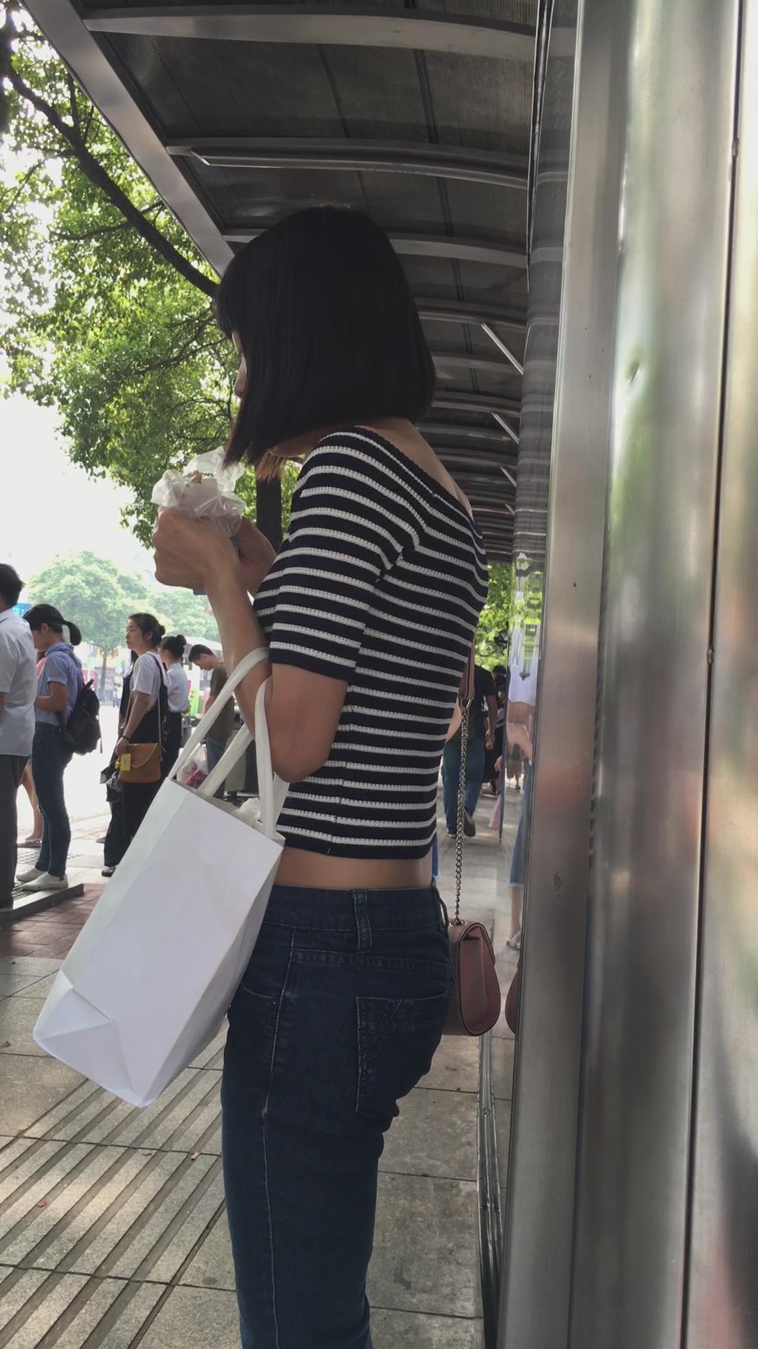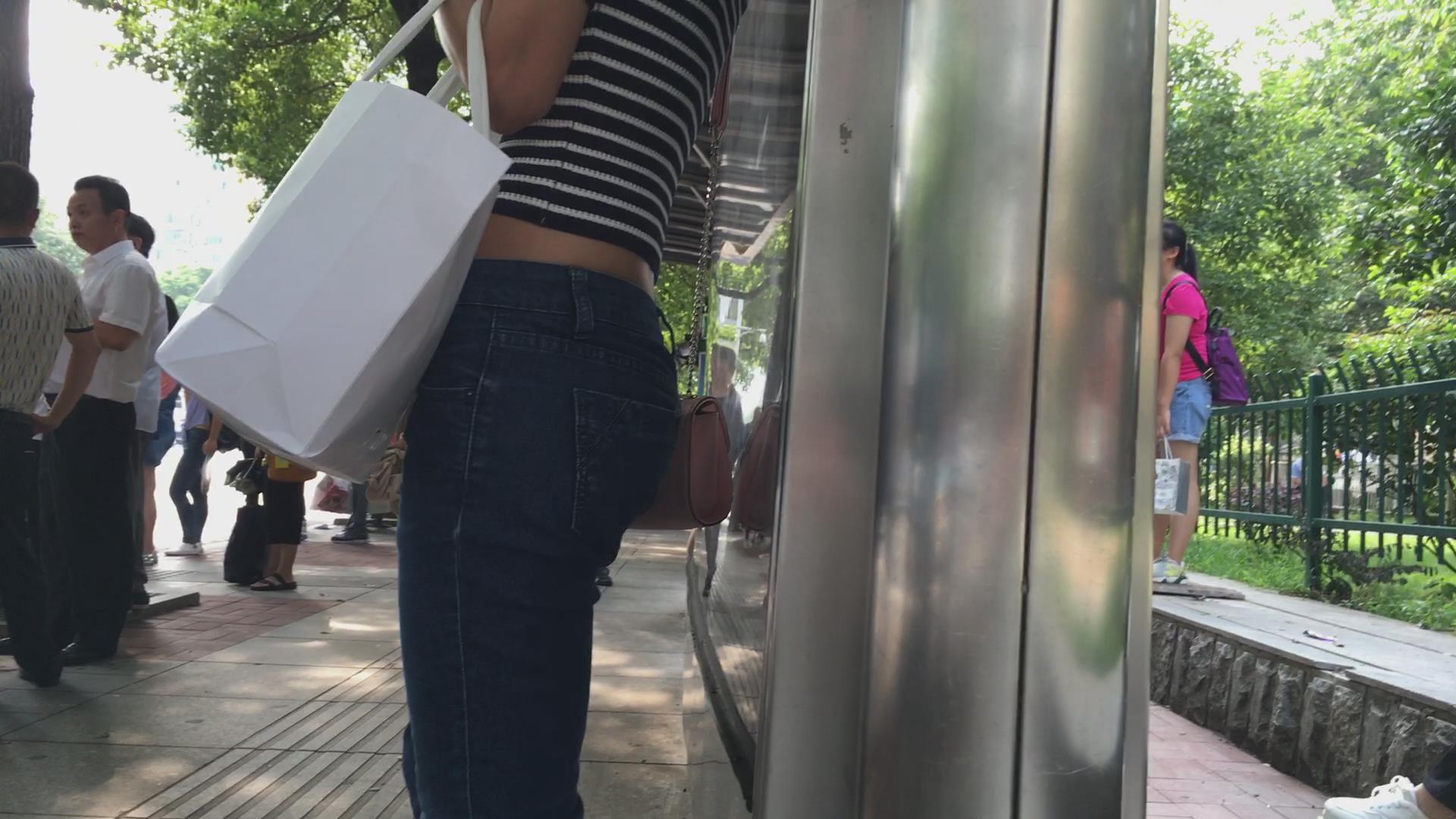 公交站等车的紧身蓝牛性感大嘴唇妹子 编号5516