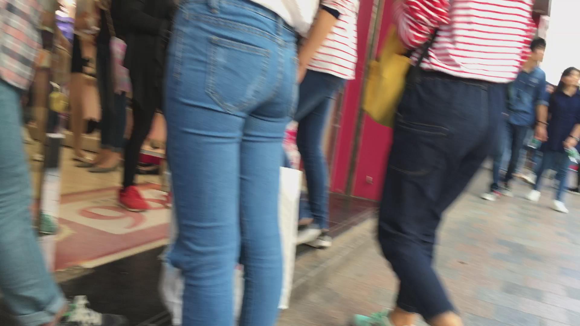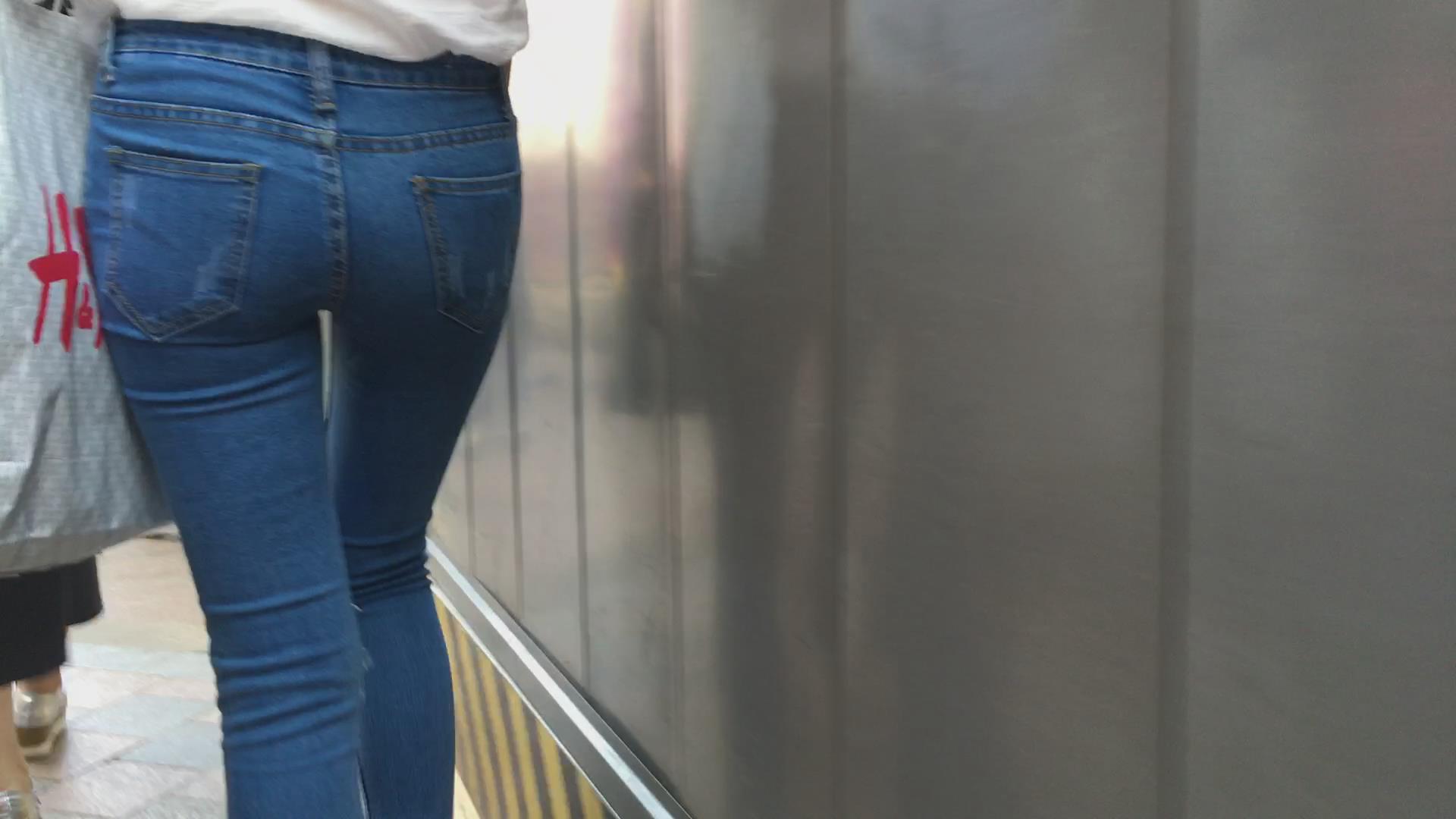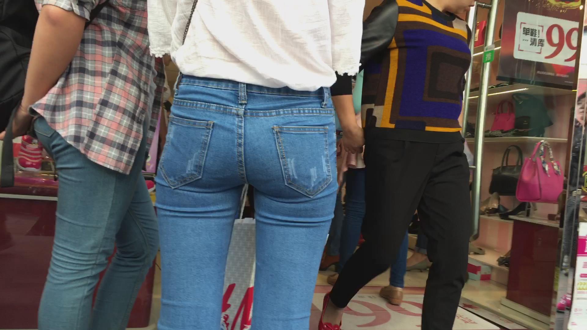 苗条的紧身宽臀牛仔小美女,微透视白衬衫 编号5776