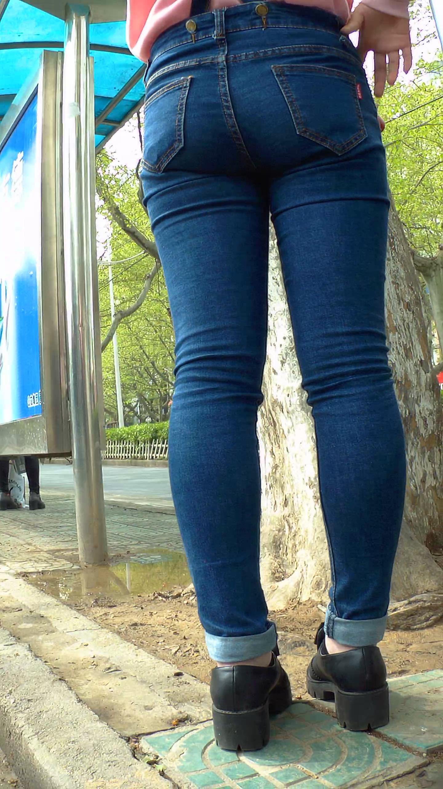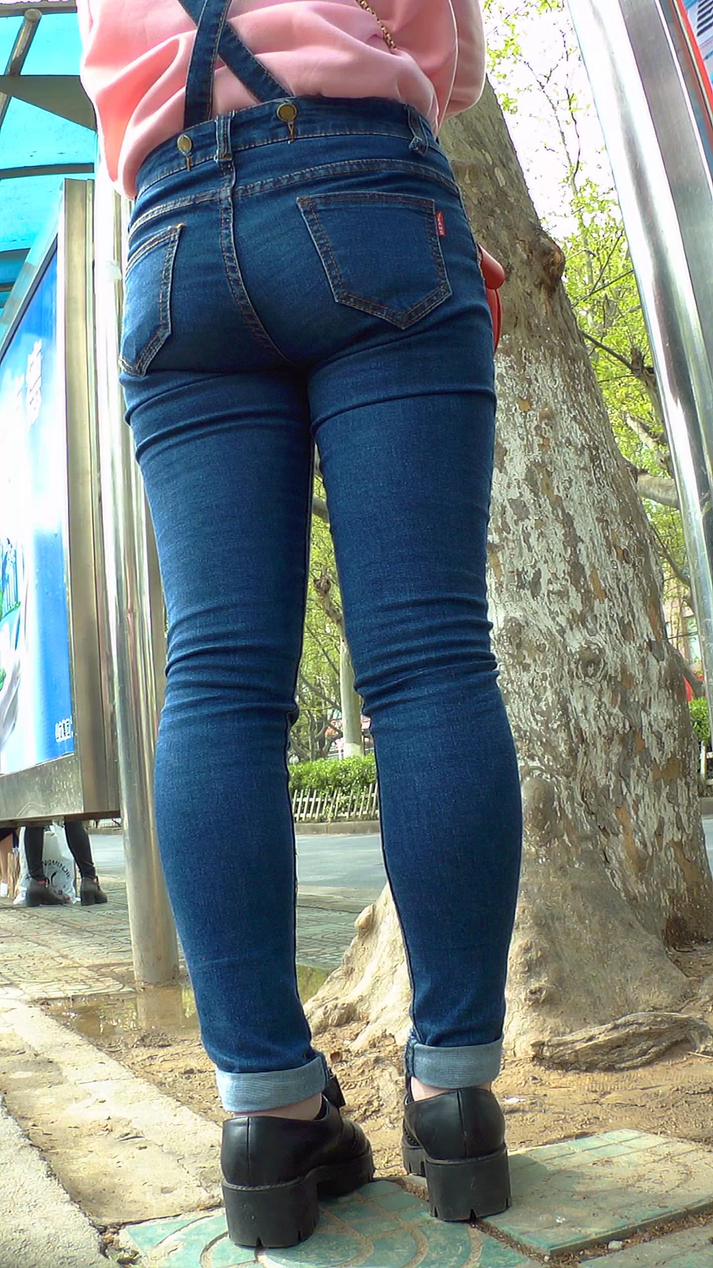 街拍等车的粉衣紧身背带蓝牛翘臀小妹 编号5828