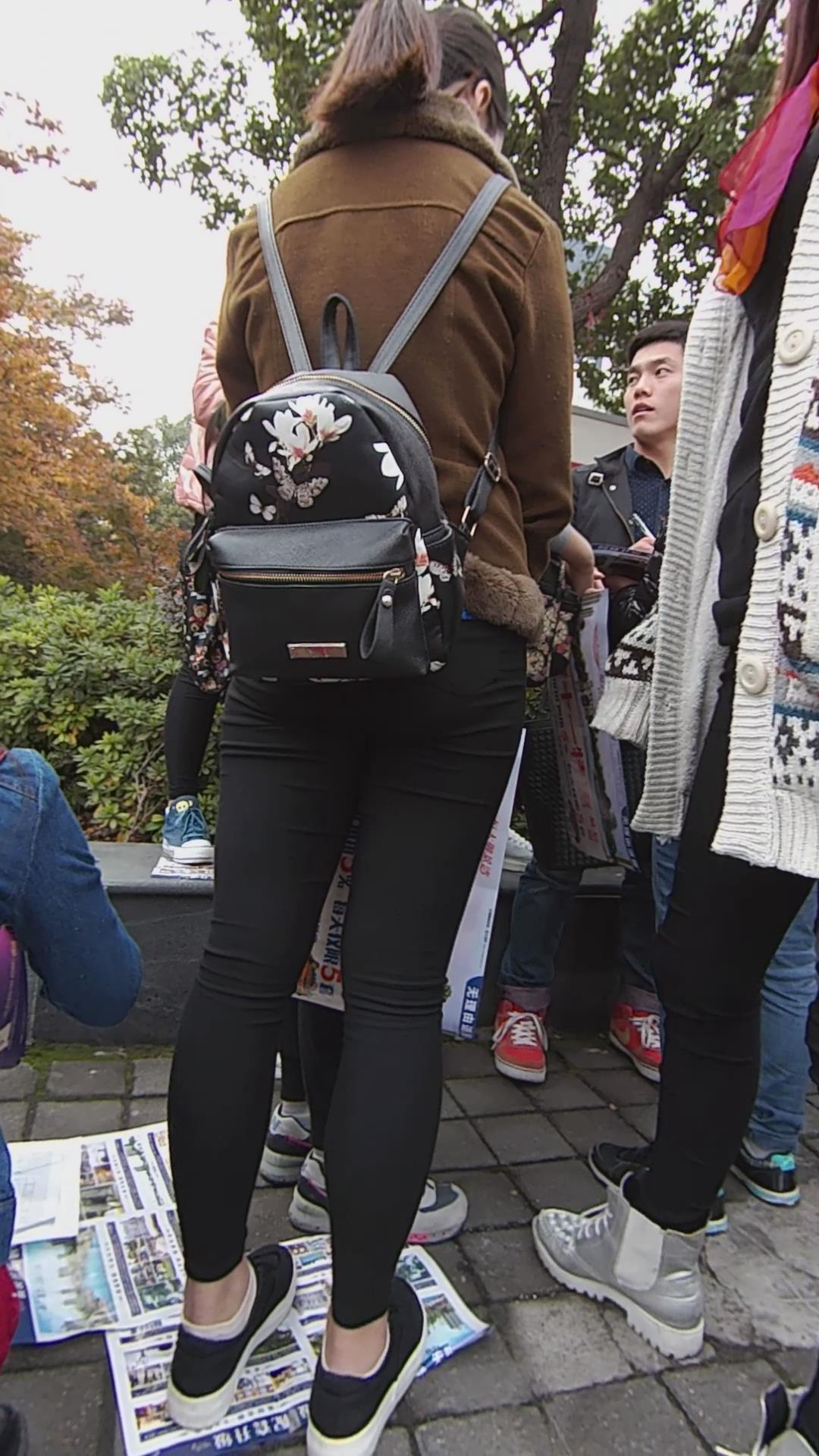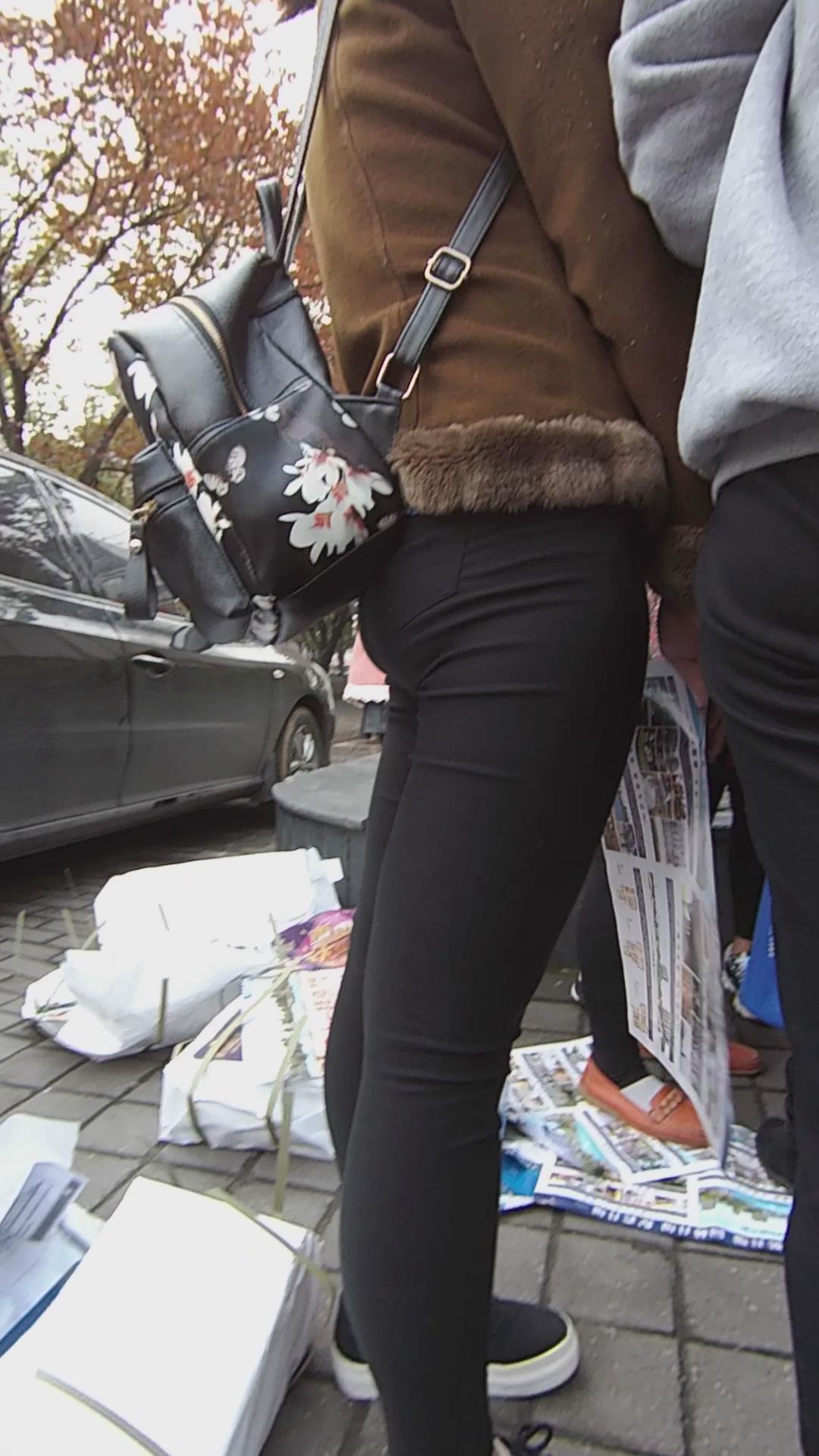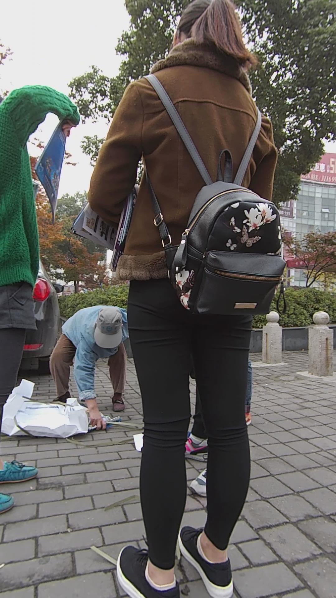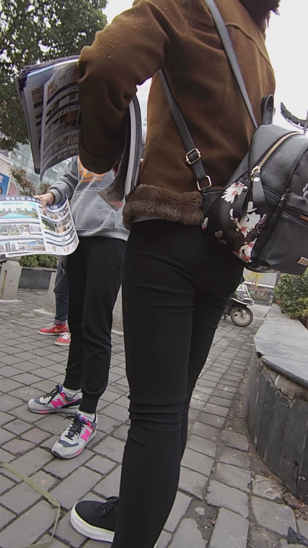 黑色紧身裤宽臀棕色外套学生妹路口发传单 编号5829
