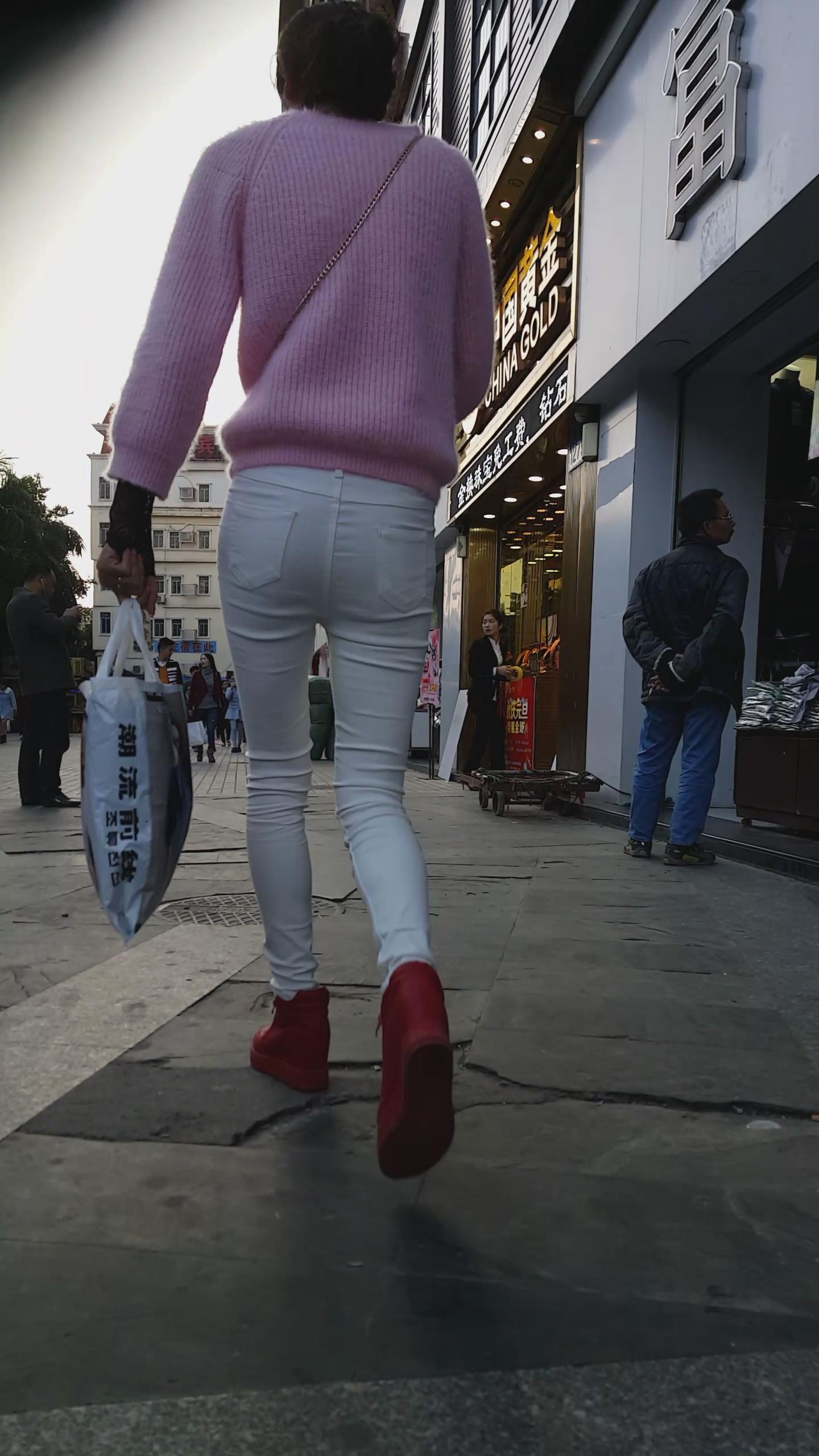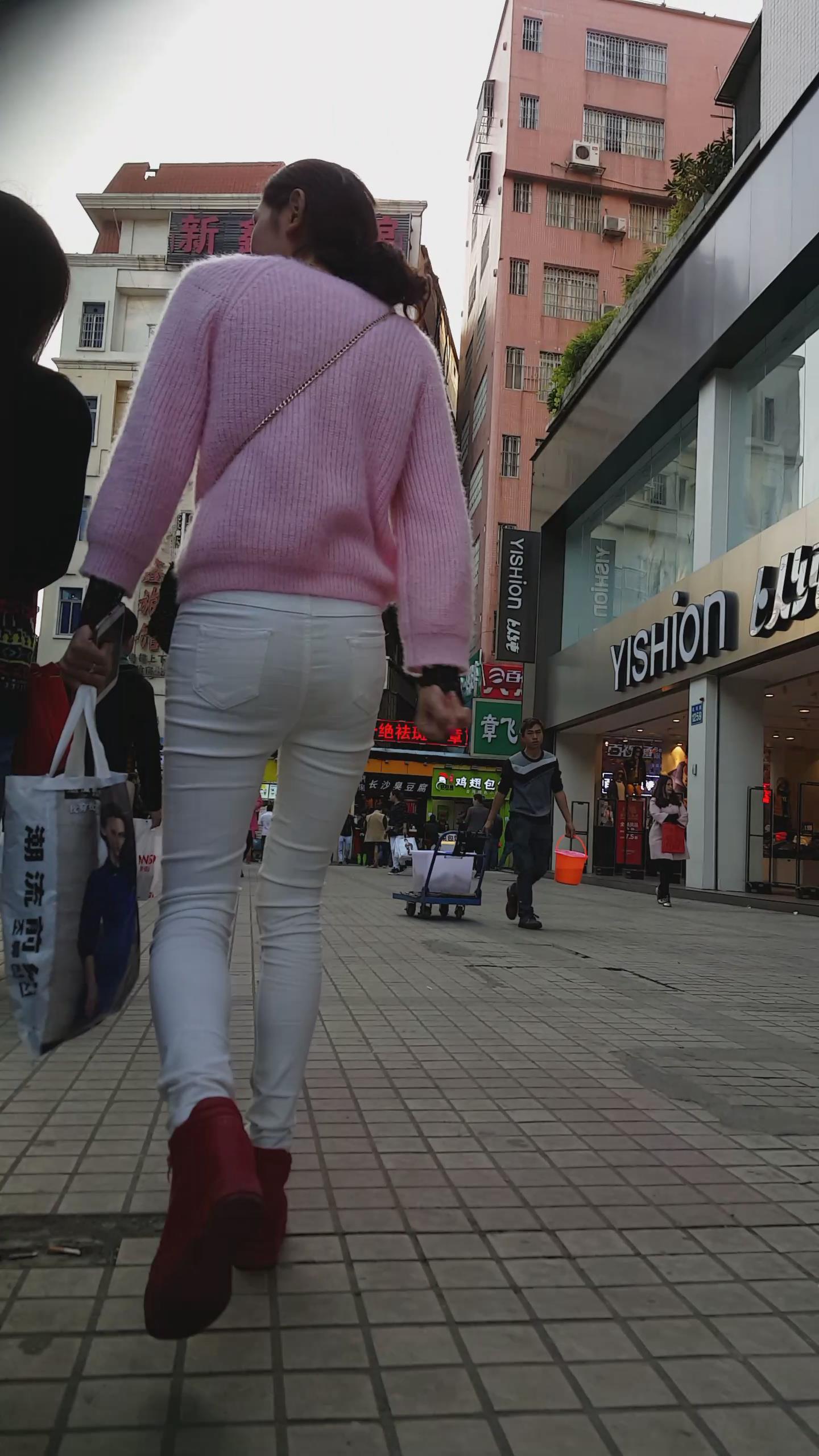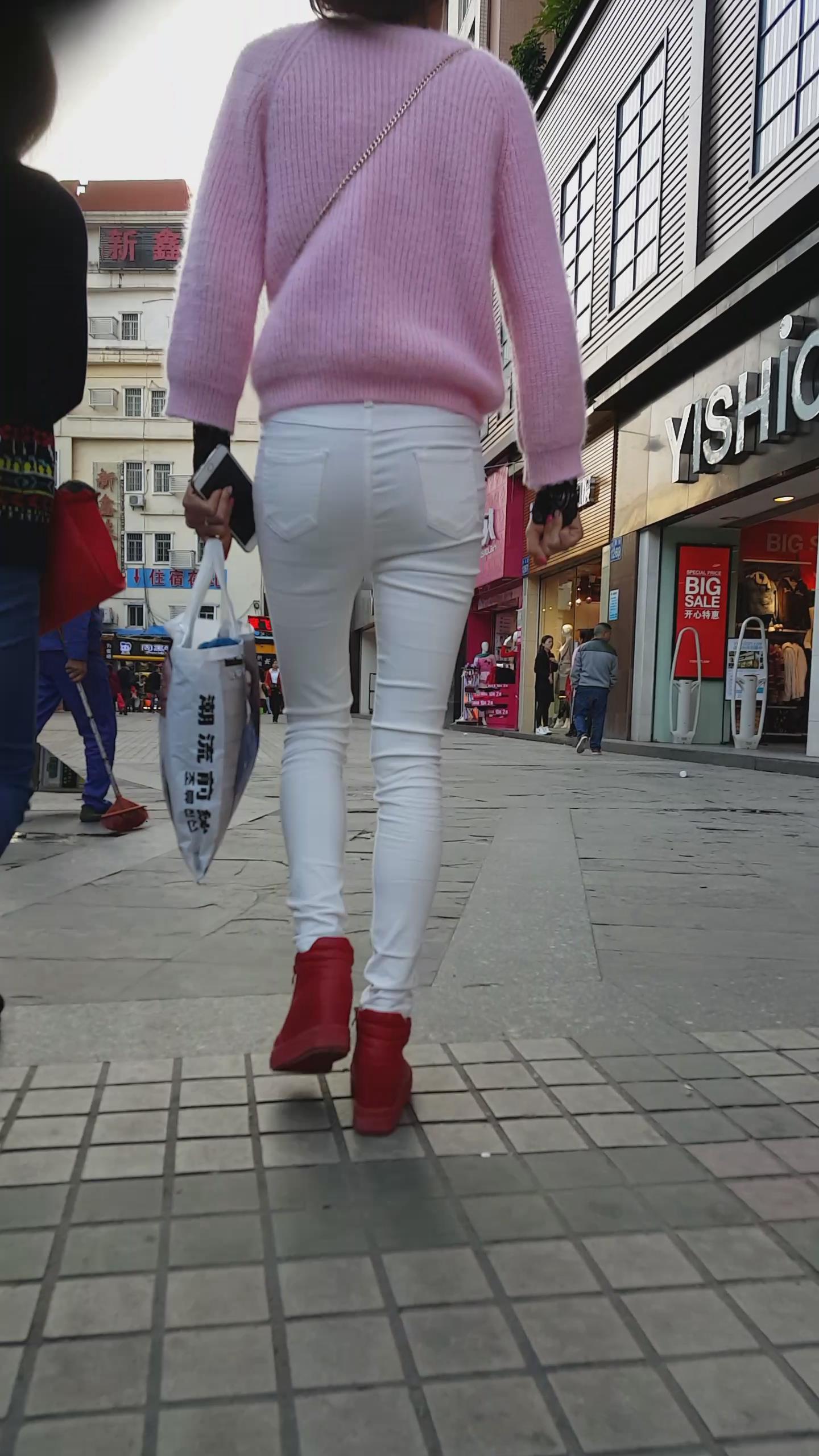 街拍粉衣白色紧身裤苗条美女 编号5943