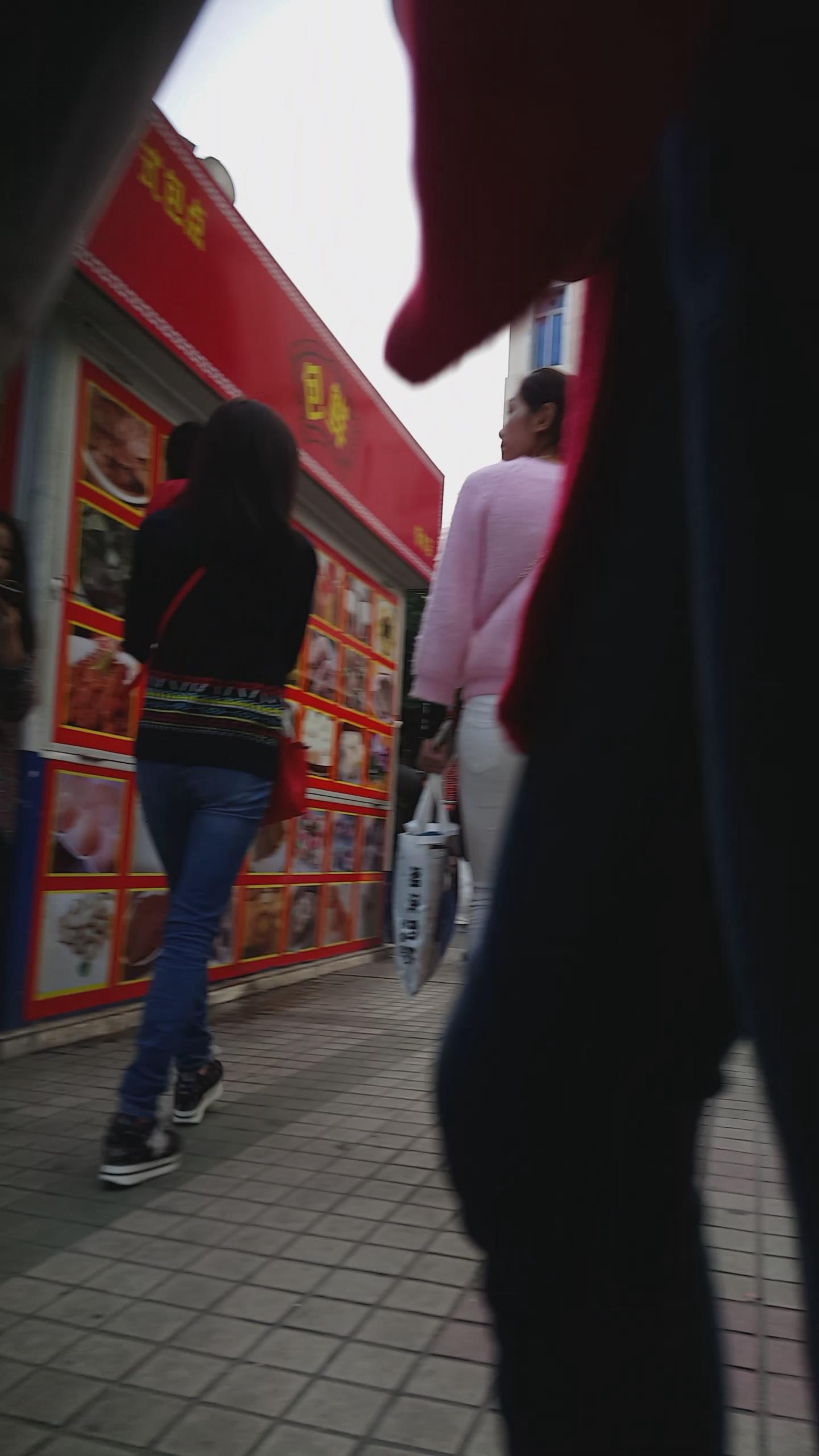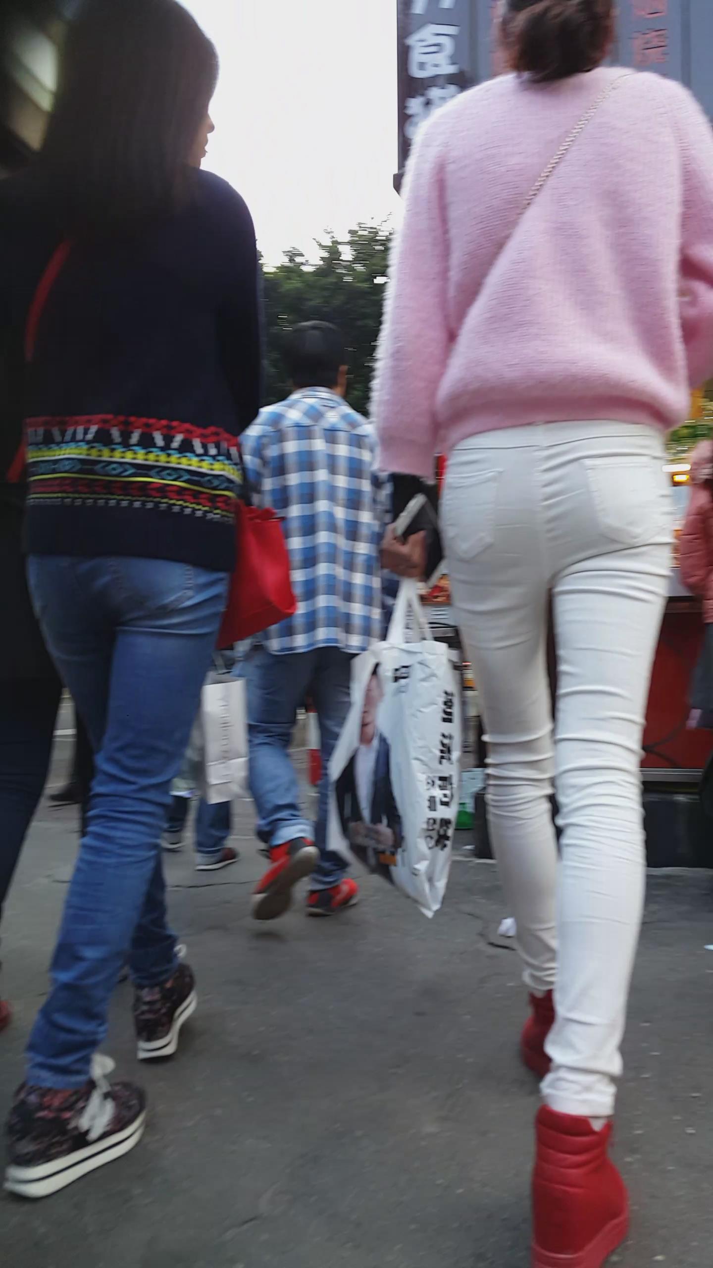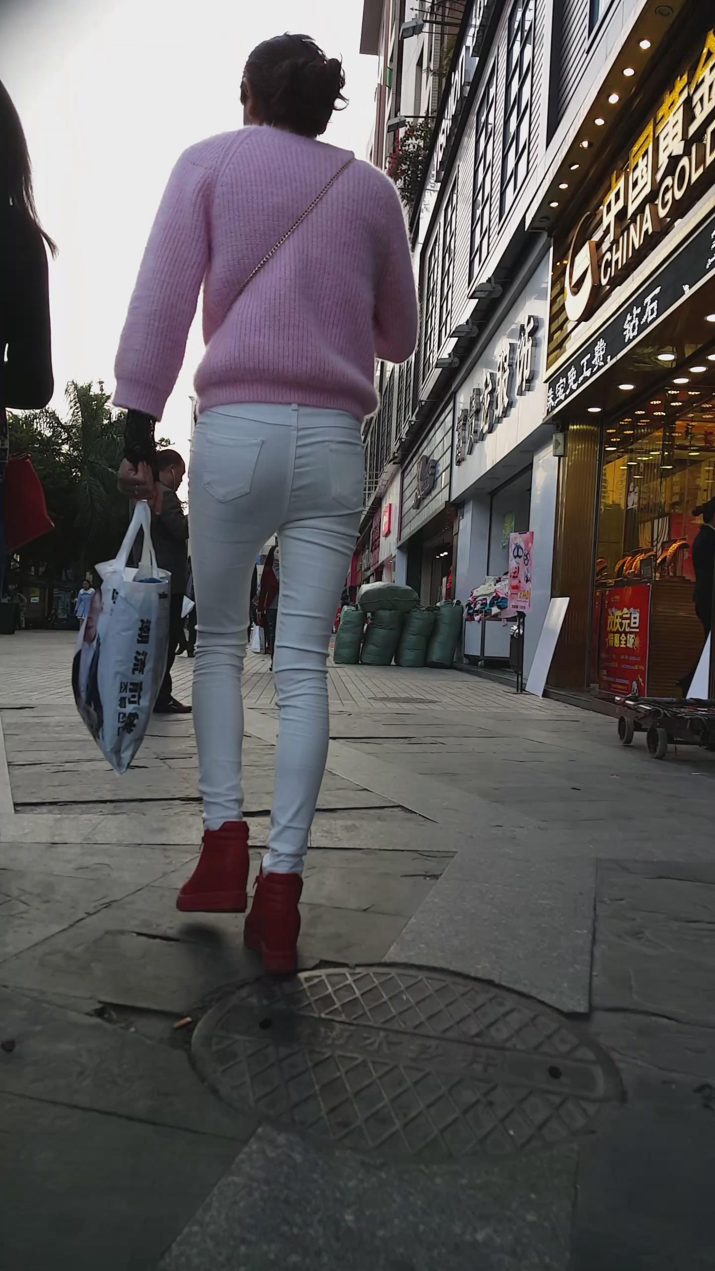 街拍粉衣白色紧身裤苗条美女 编号5943