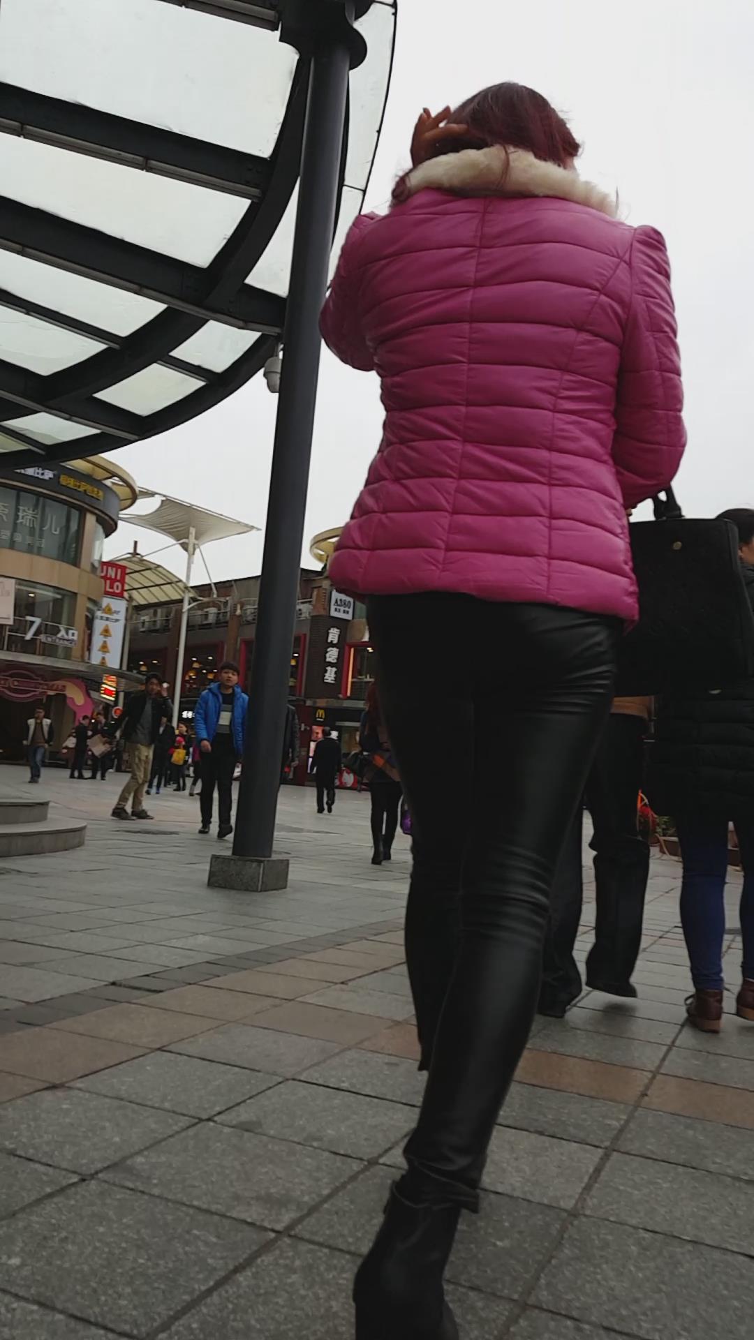 街拍紧身皮裤羽绒服美女 编号5946