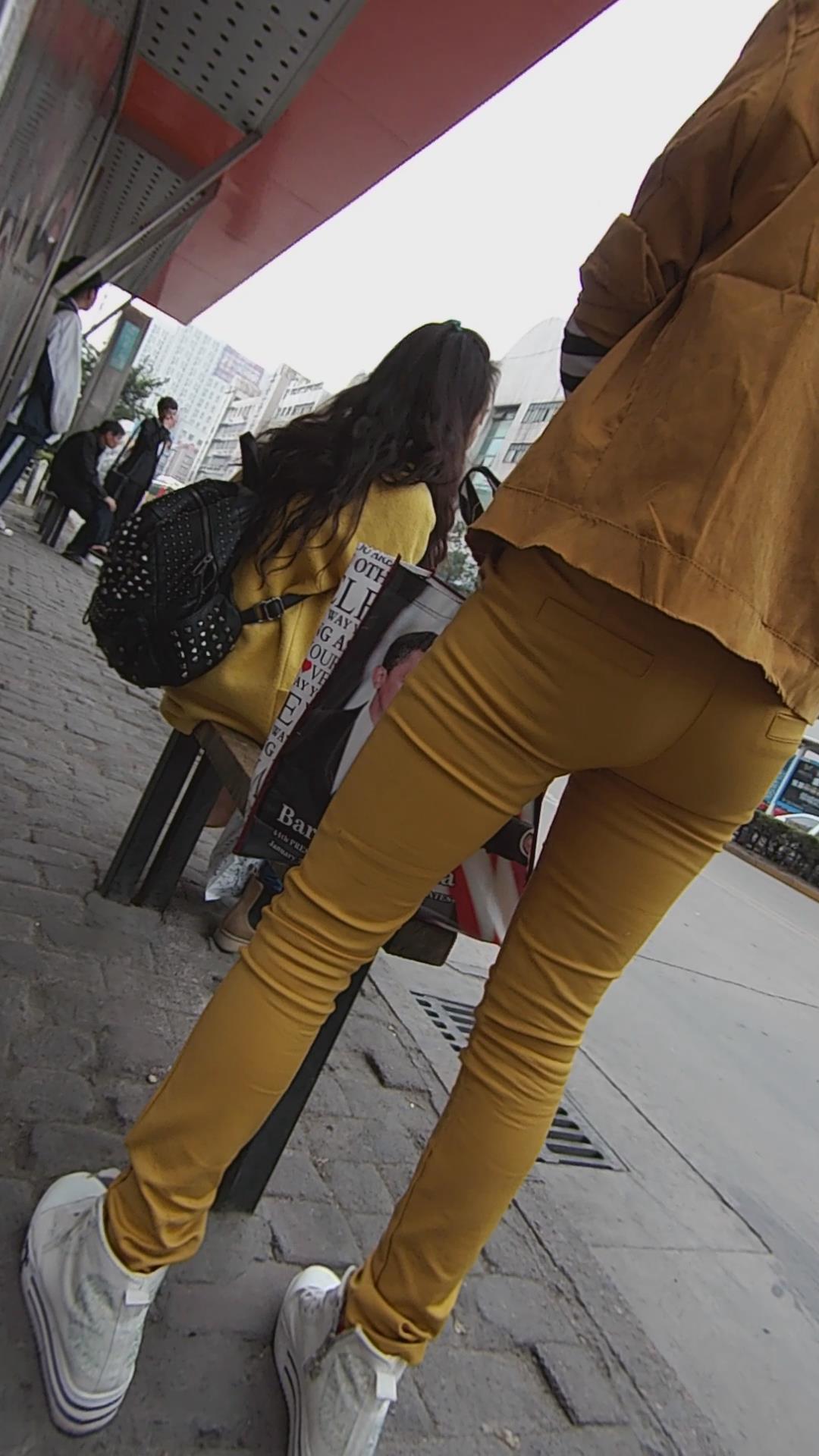 公车站娇小身材黄色紧身裤清新小美女。 编号5951