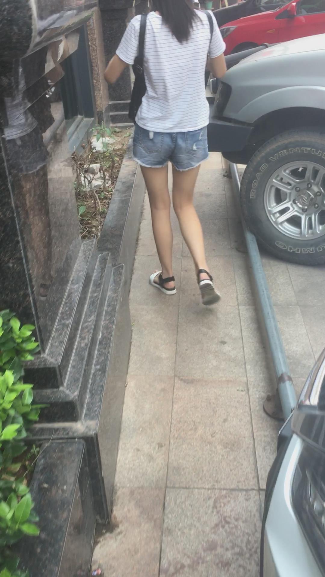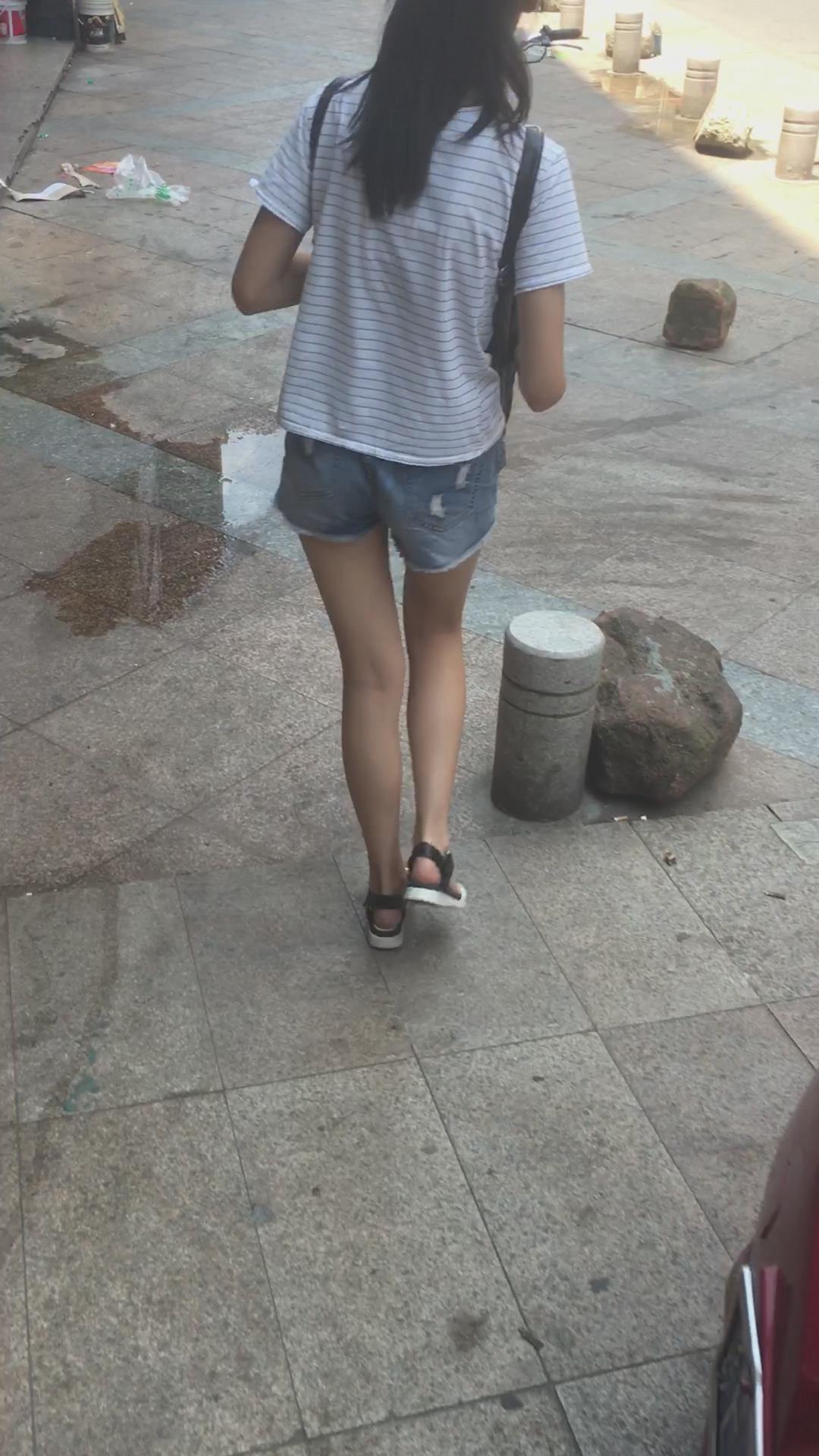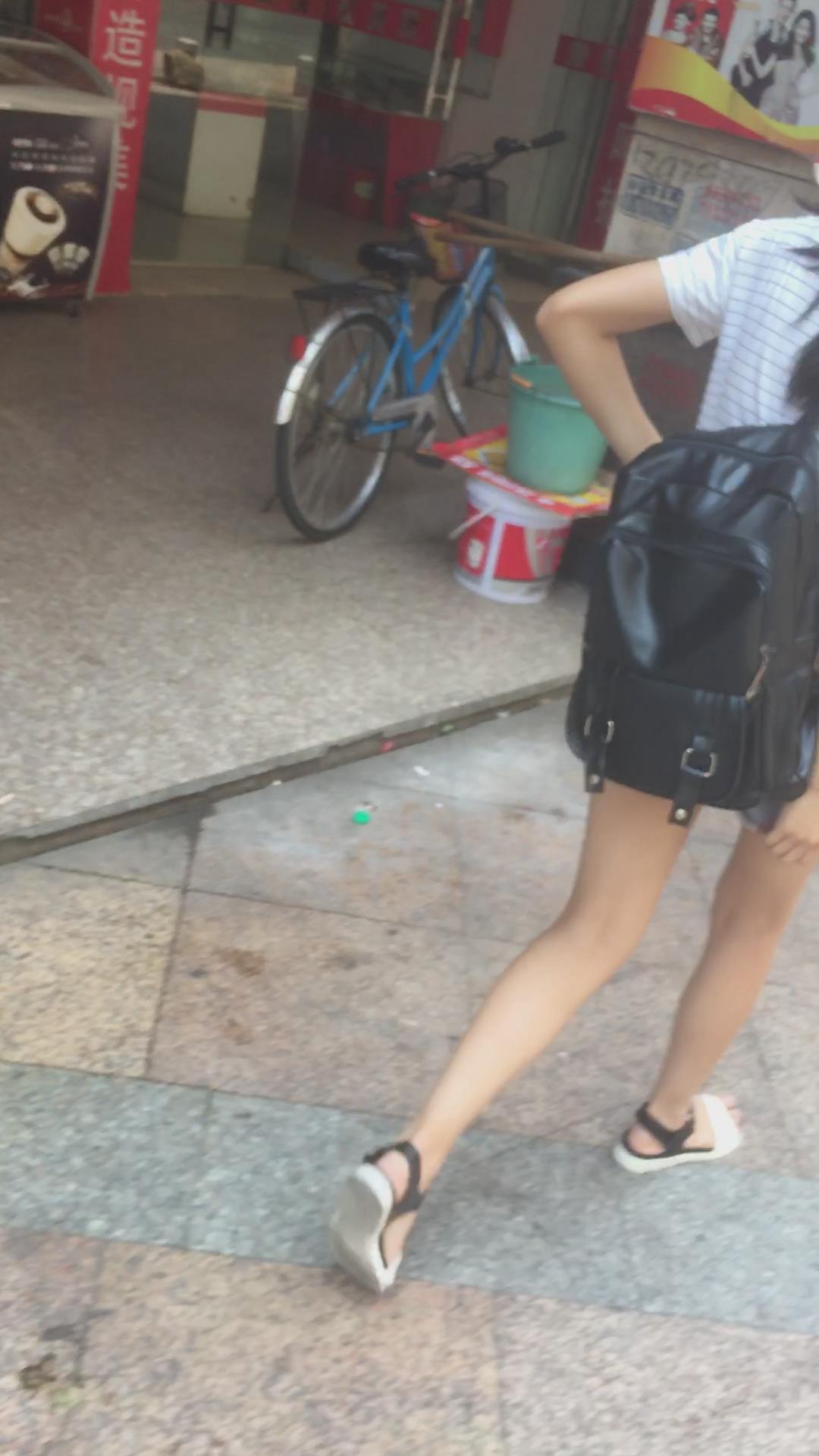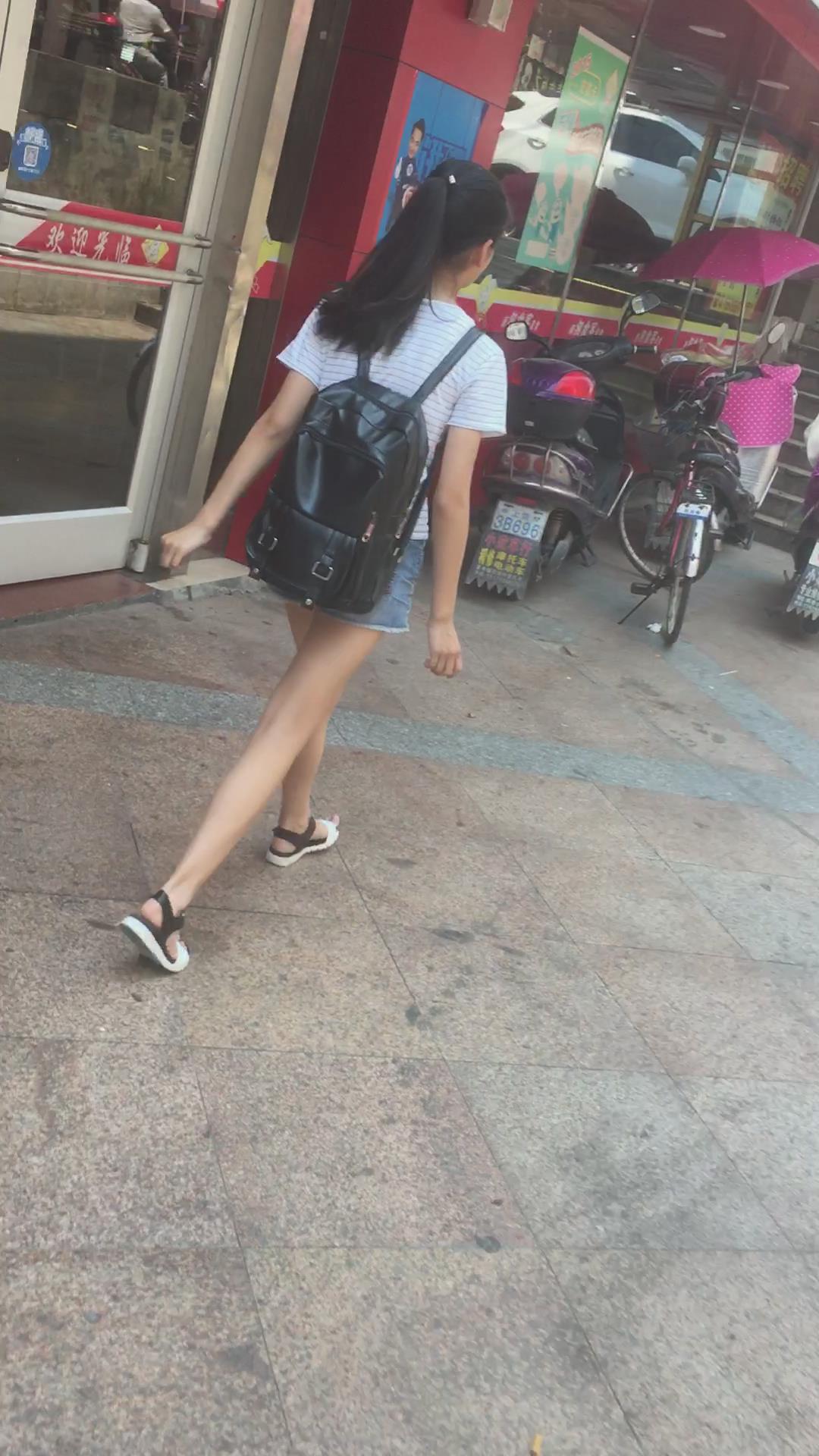 黑色背包T恤衫牛仔热裤马尾辫学生妹 编号4492
