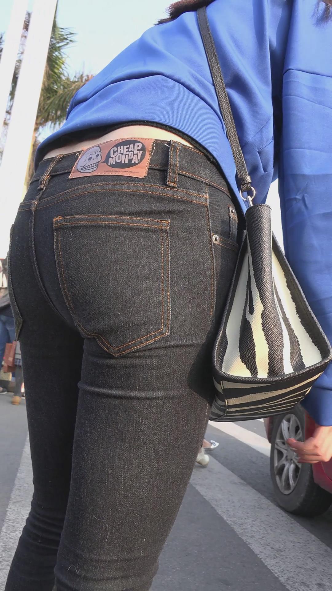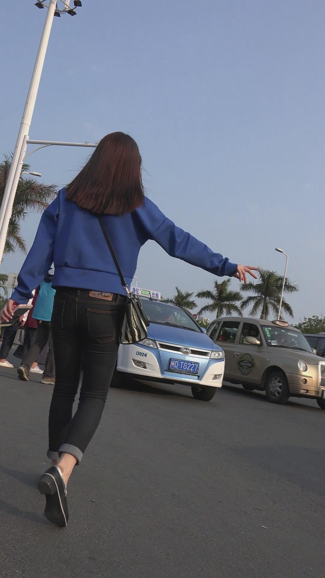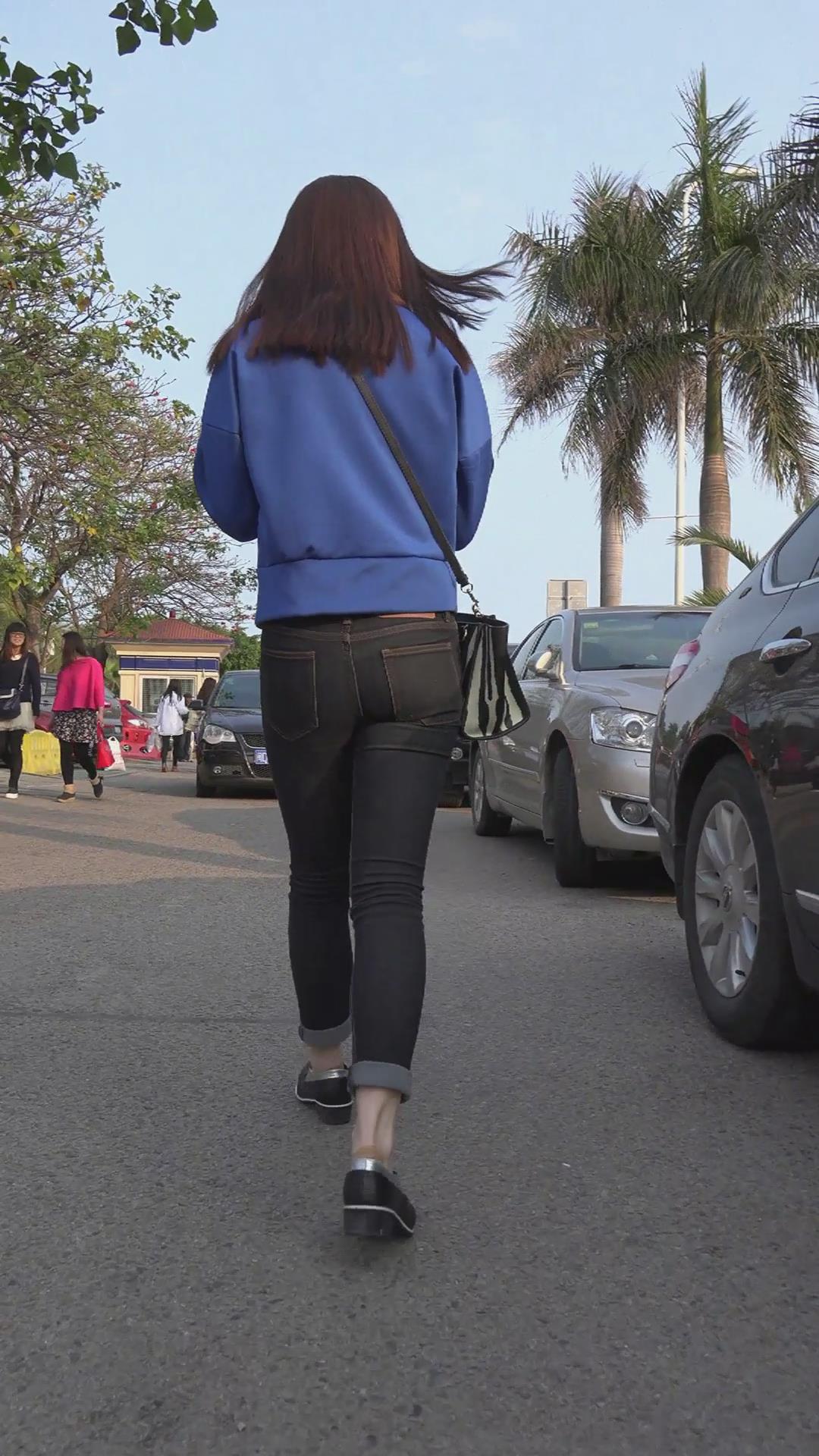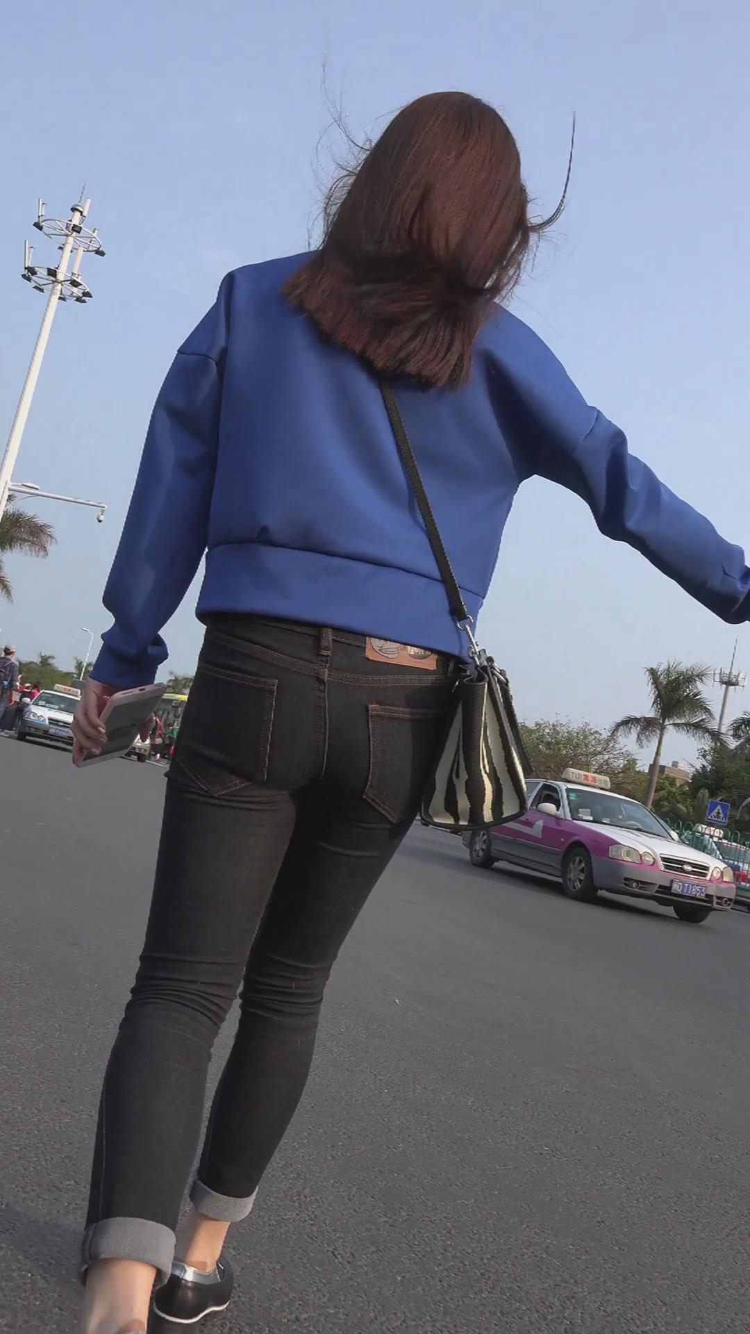 街拍蓝衣黑色紧身牛仔裤美眉 编号5972
