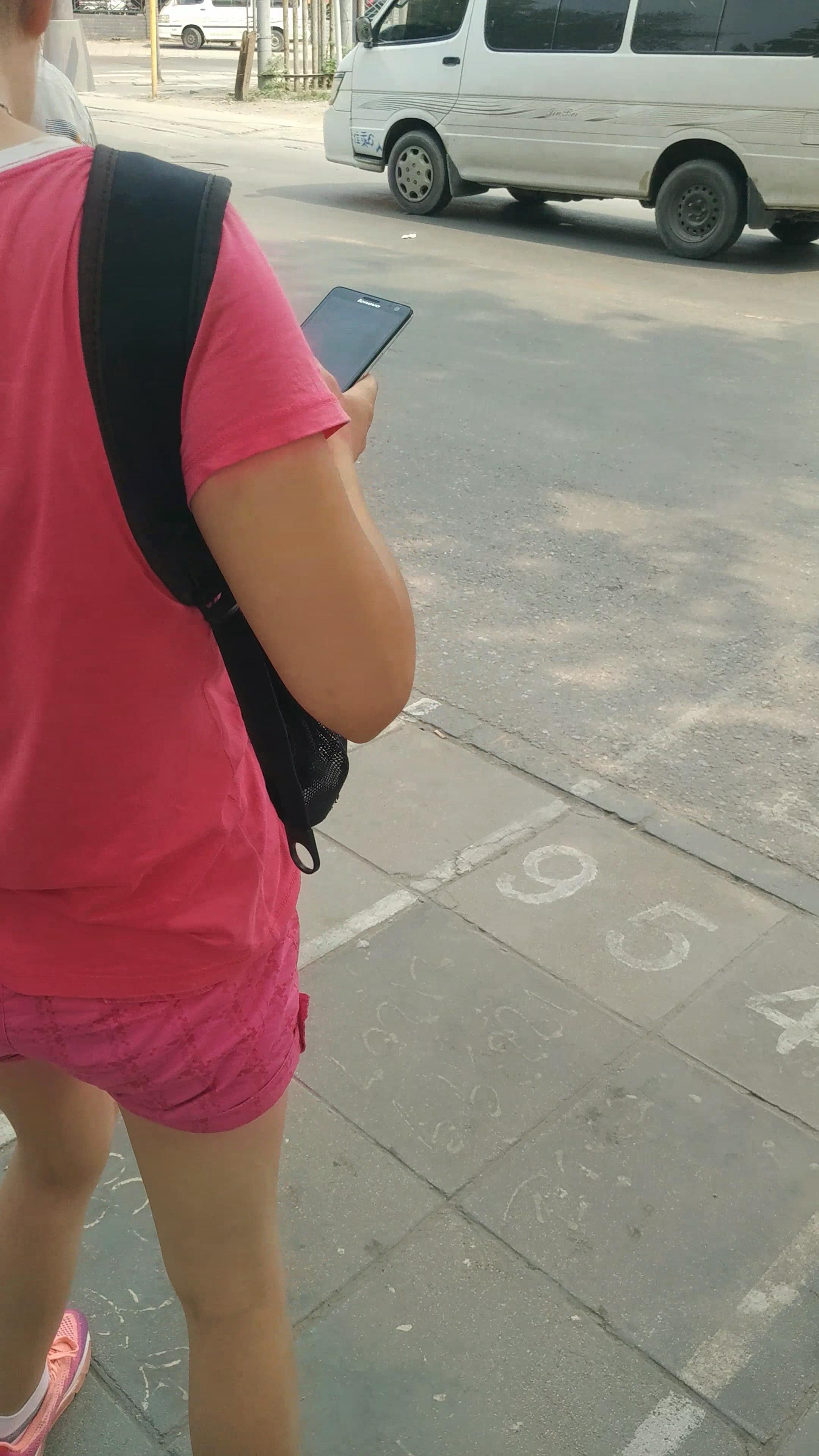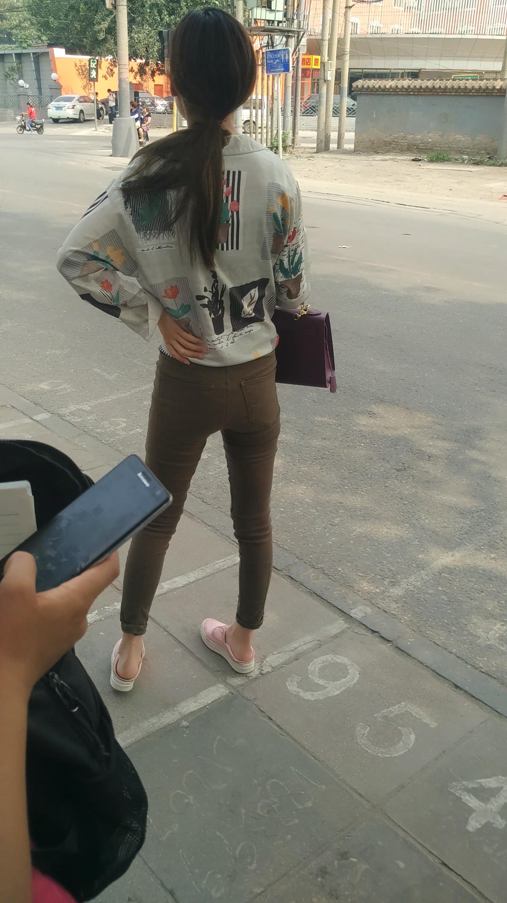 4k-街拍苗条细腿紧身裤女孩等公交车。 编号5996