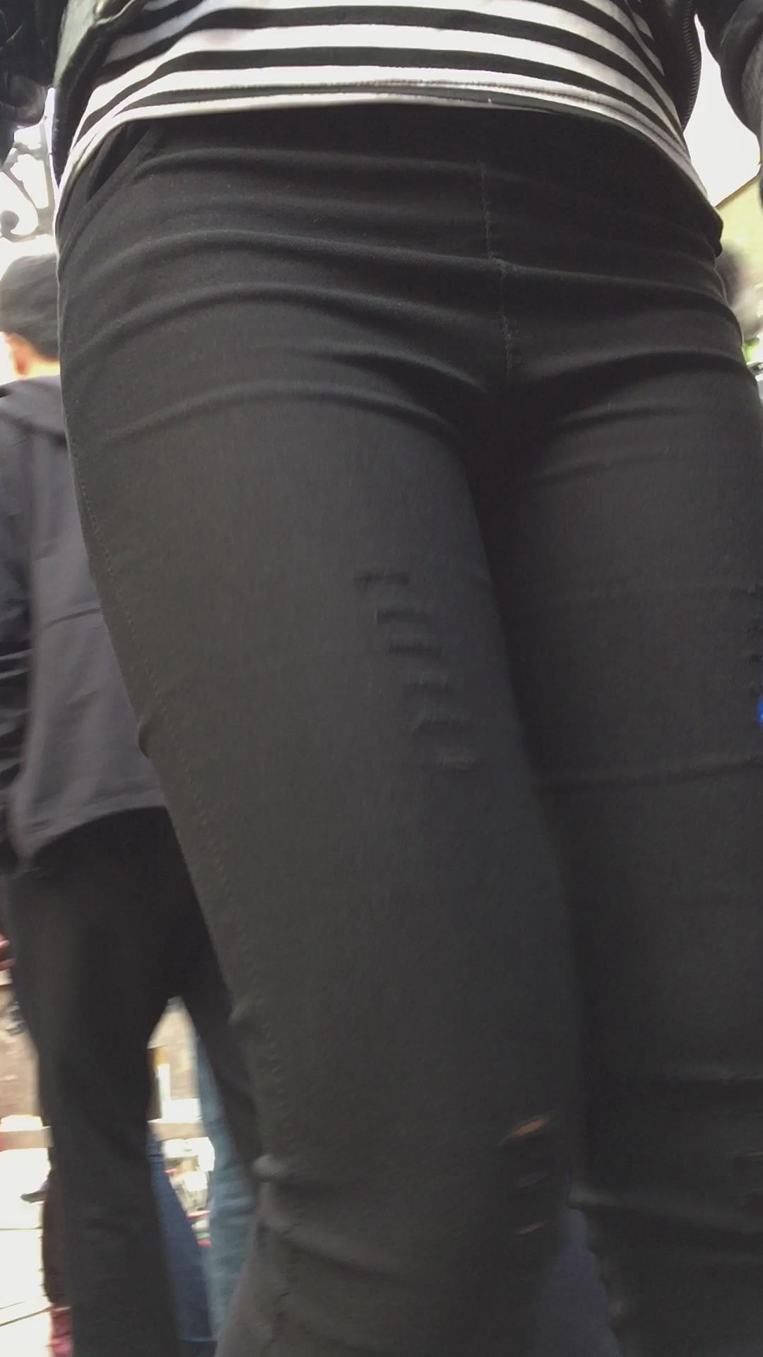 街拍黑色紧身裤美女跟小男友手拉手逛街。 编号6005