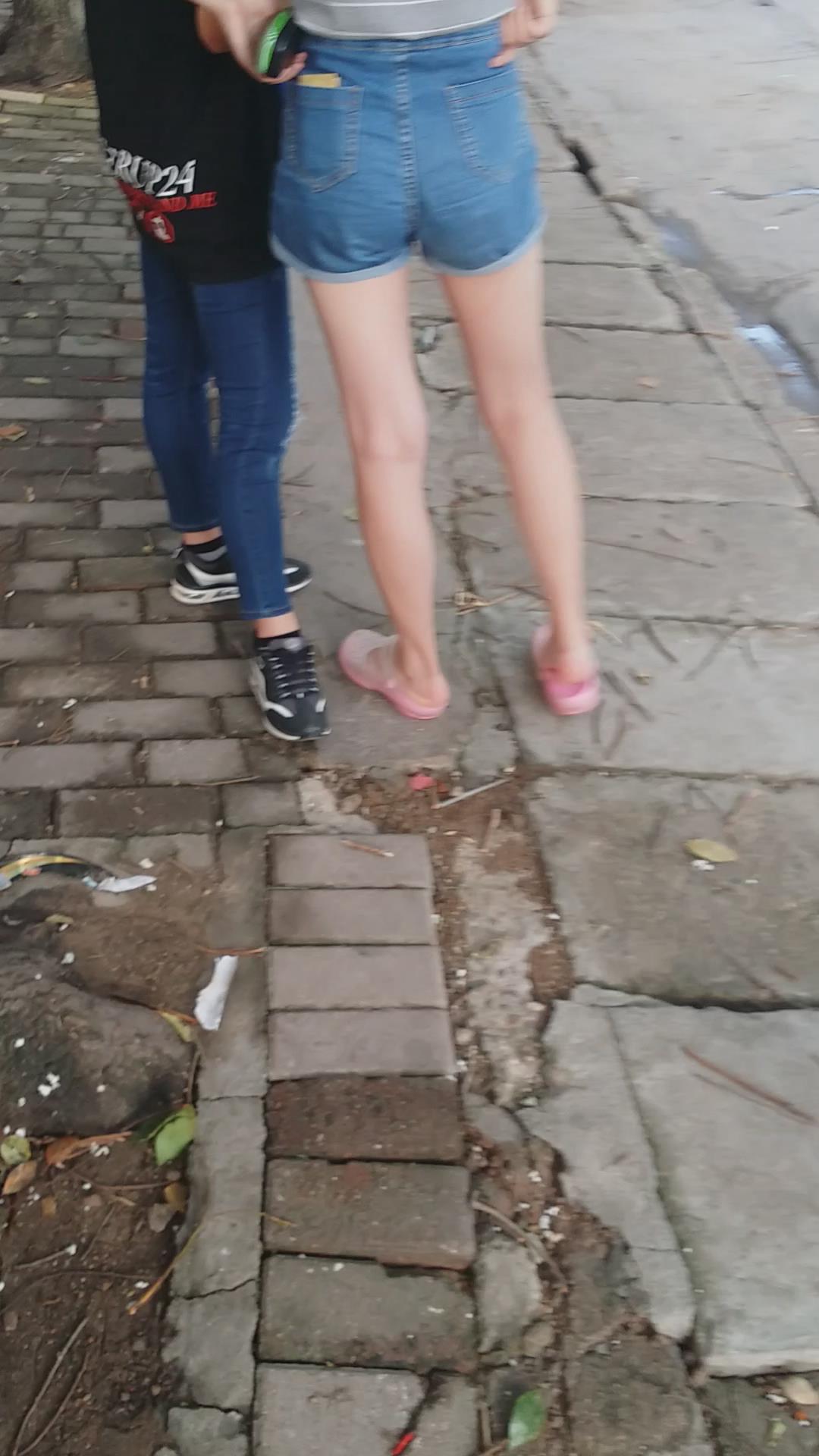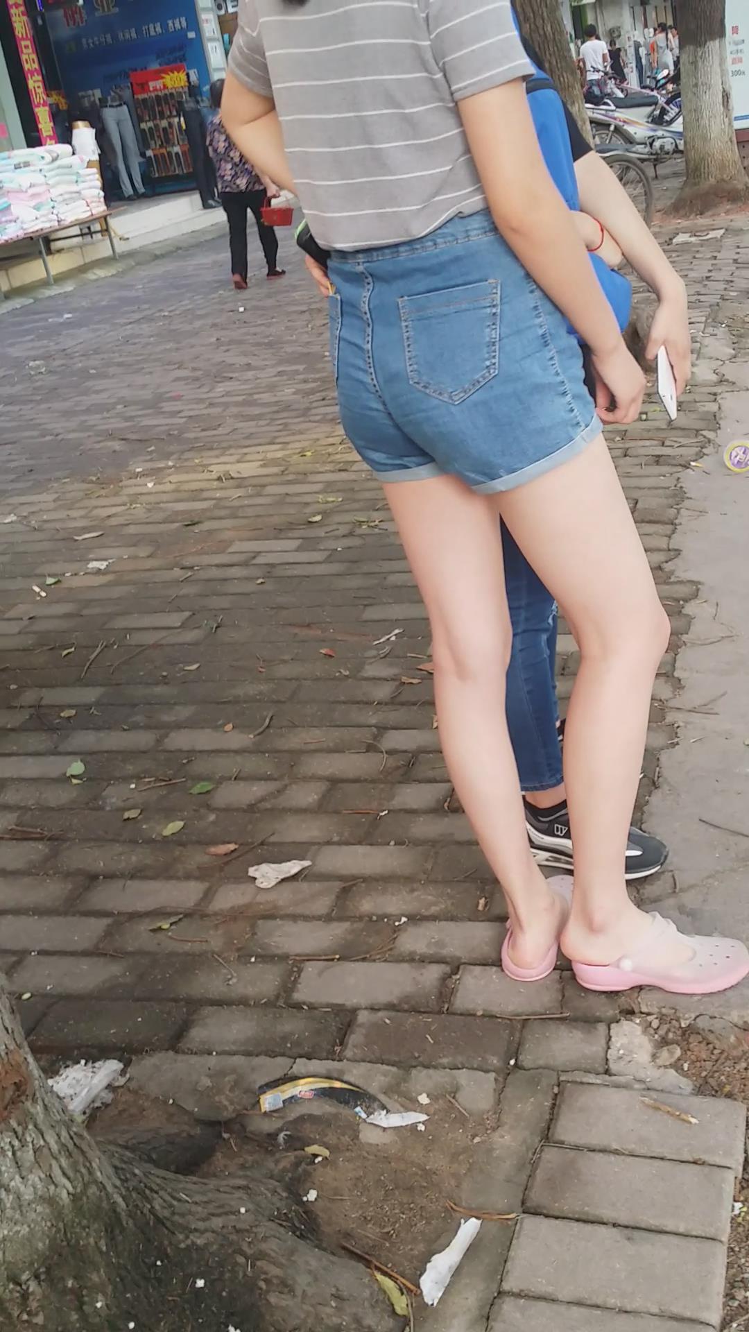 路边等车的条纹T恤衫牛仔热裤纤细街拍美腿 编号4500