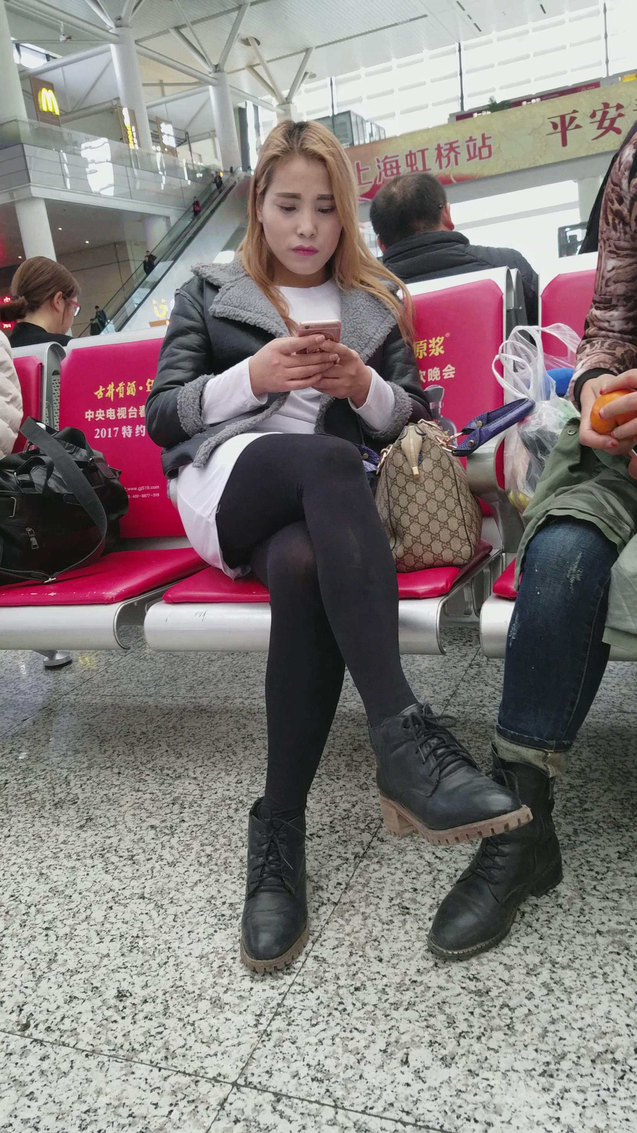 黑色外套黑丝皮鞋美女很白净 编号2743