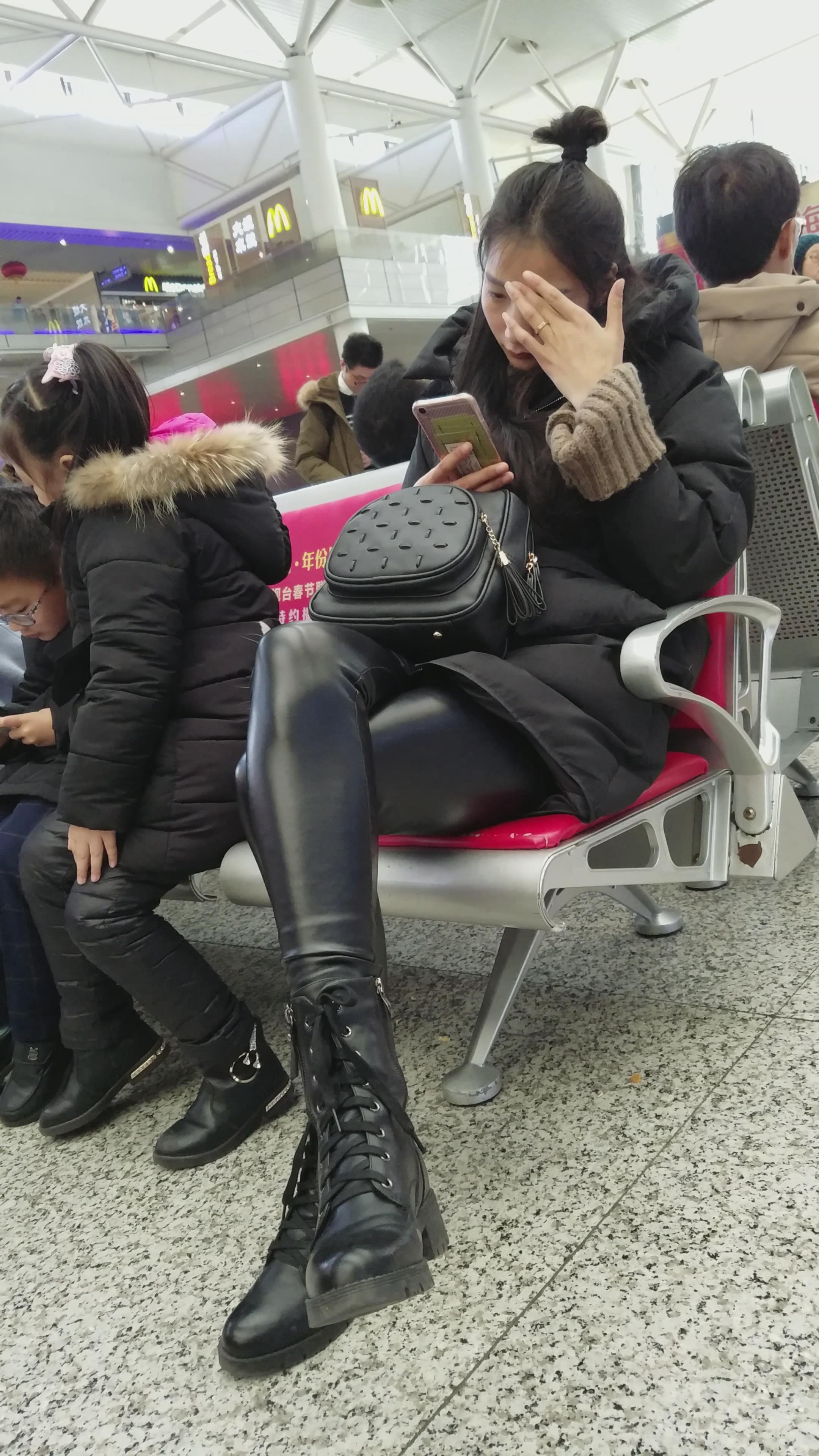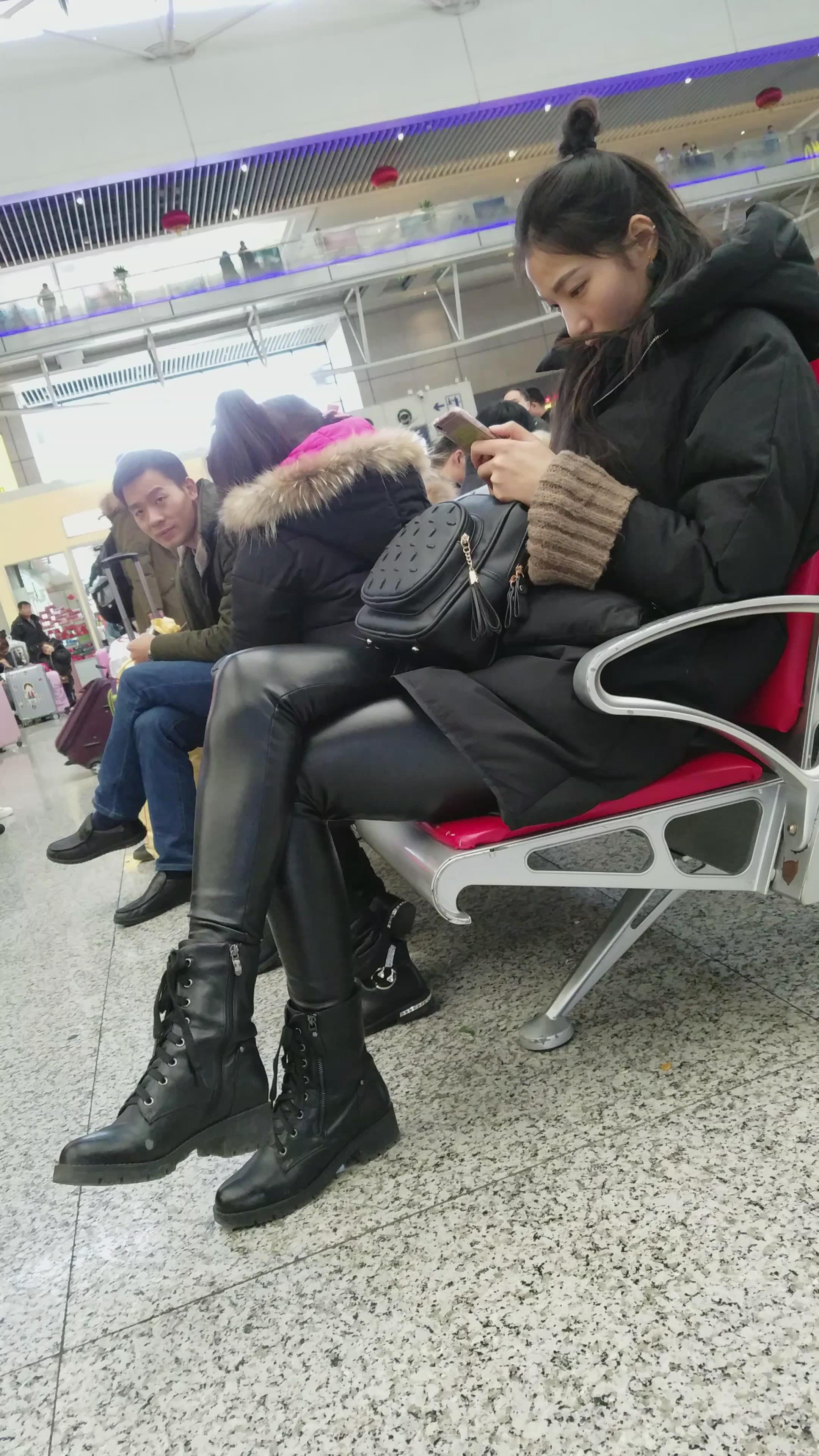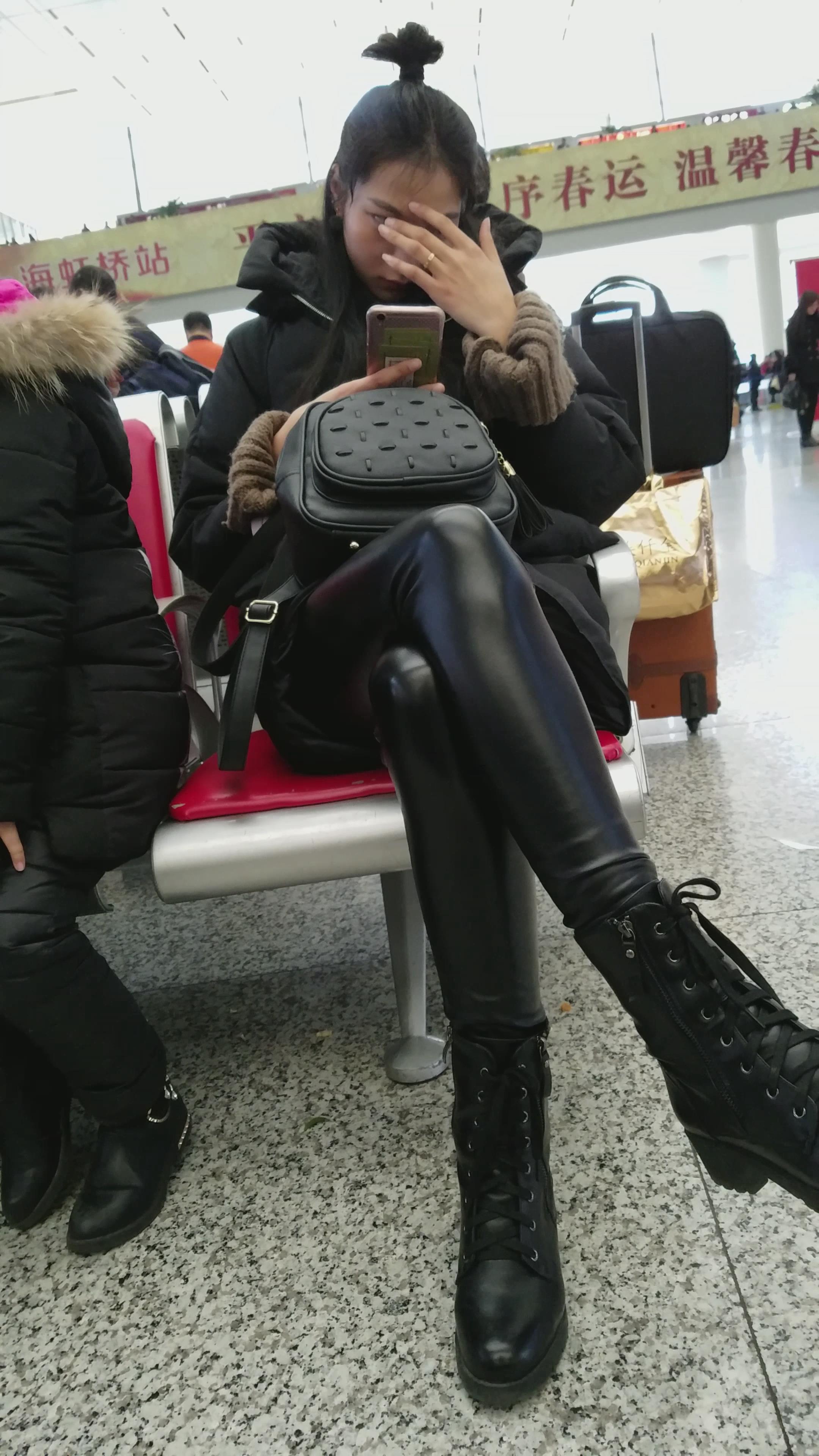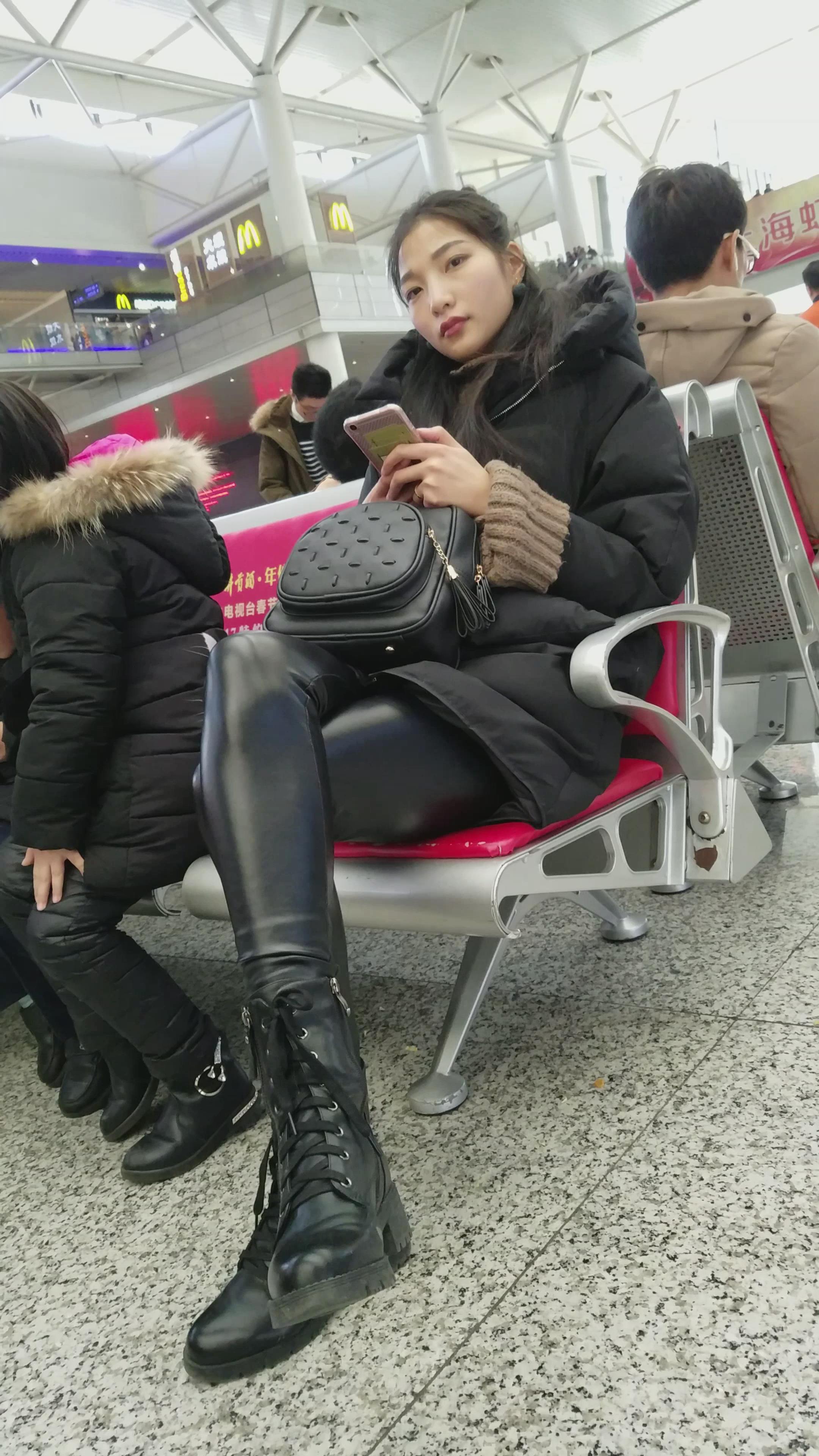 4k-高铁站候车室拍摄皮裤长腿美女 编号2962