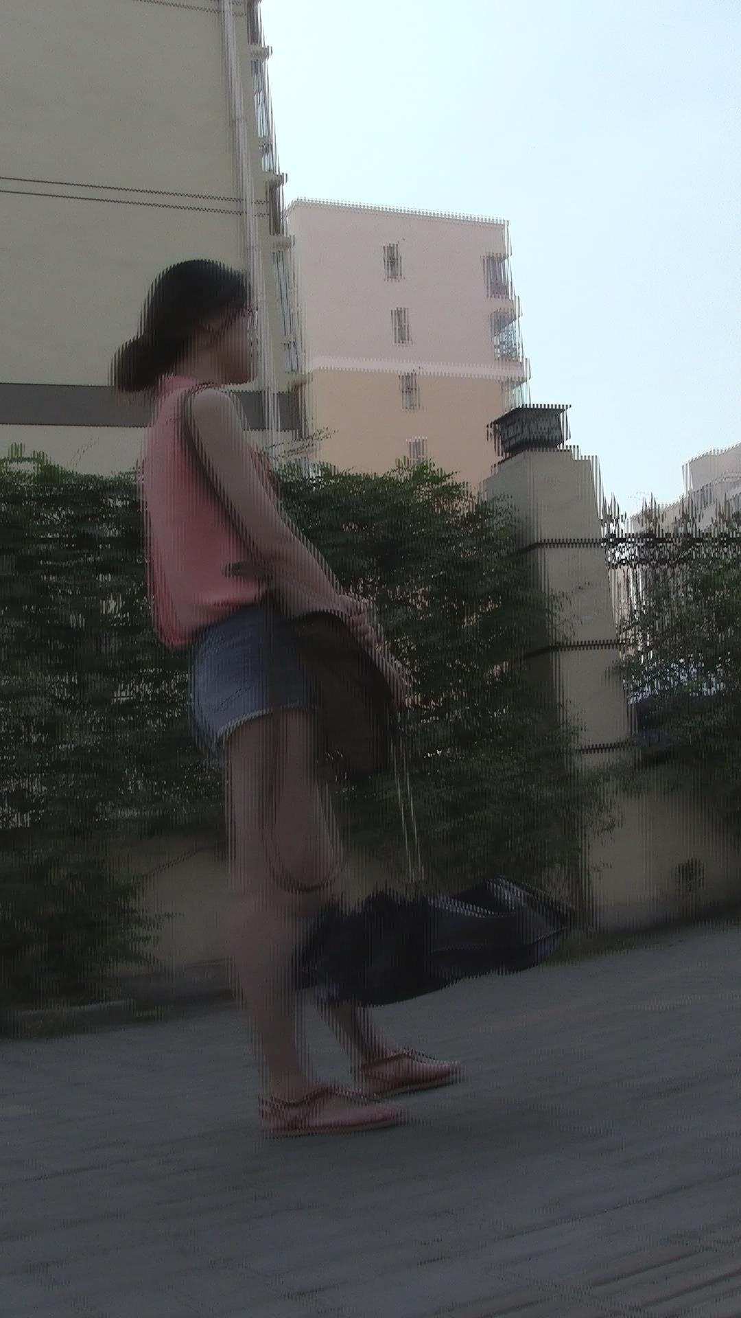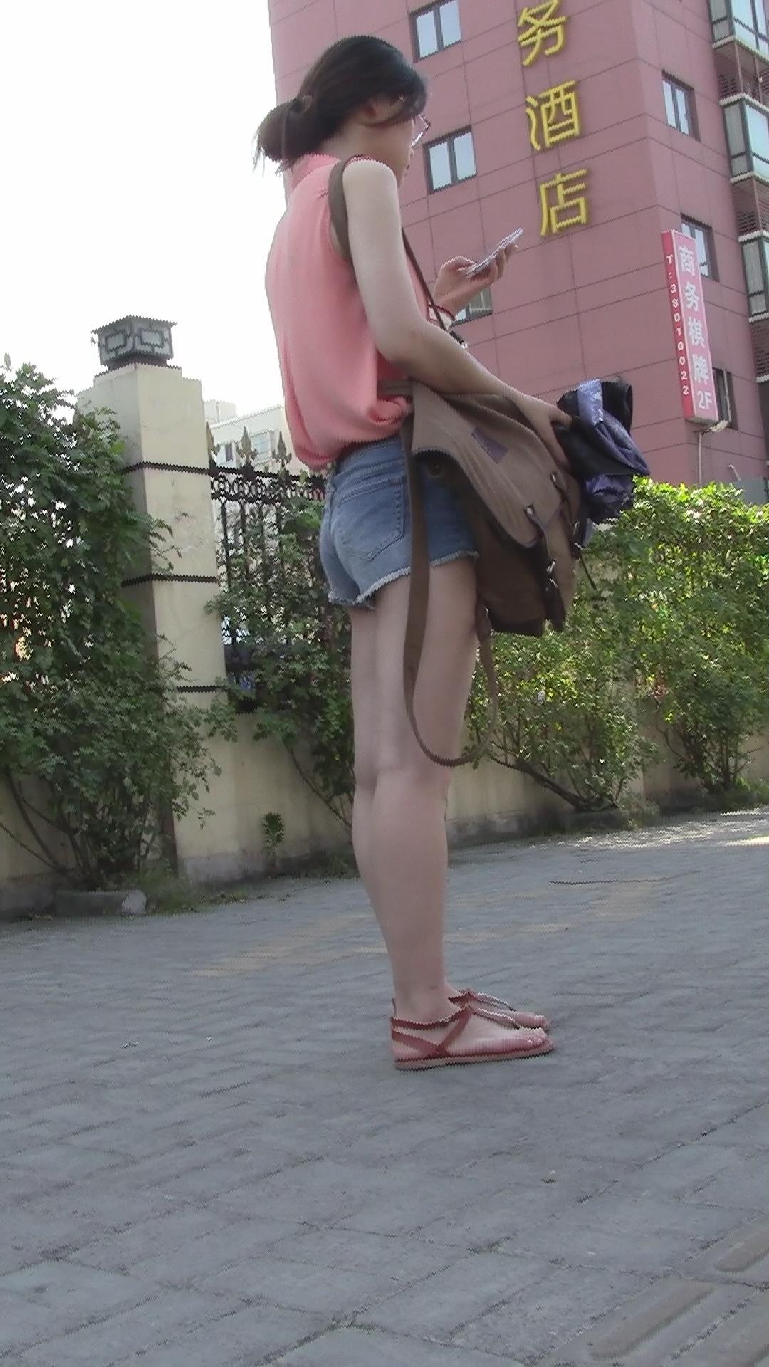 街边打电话的牛仔热裤粉衬衫小美女 编号4311