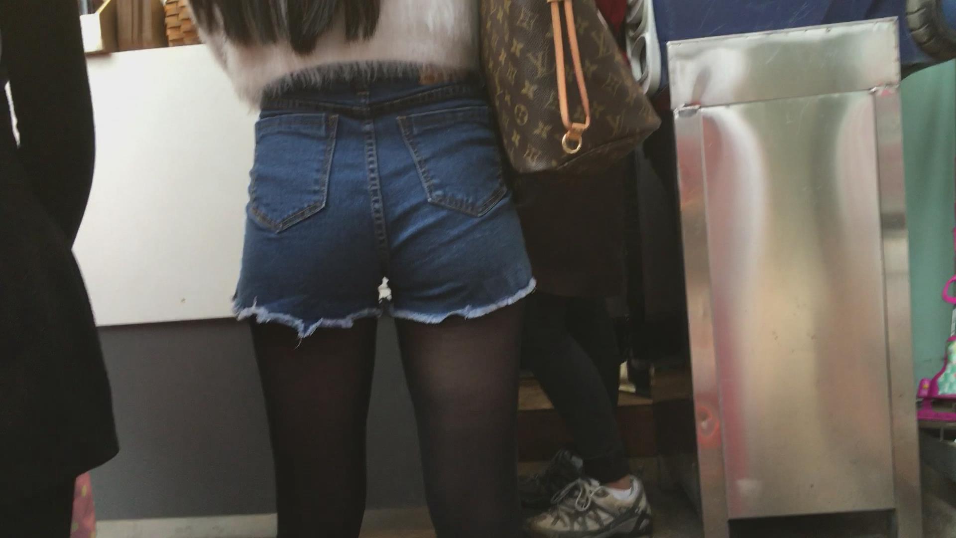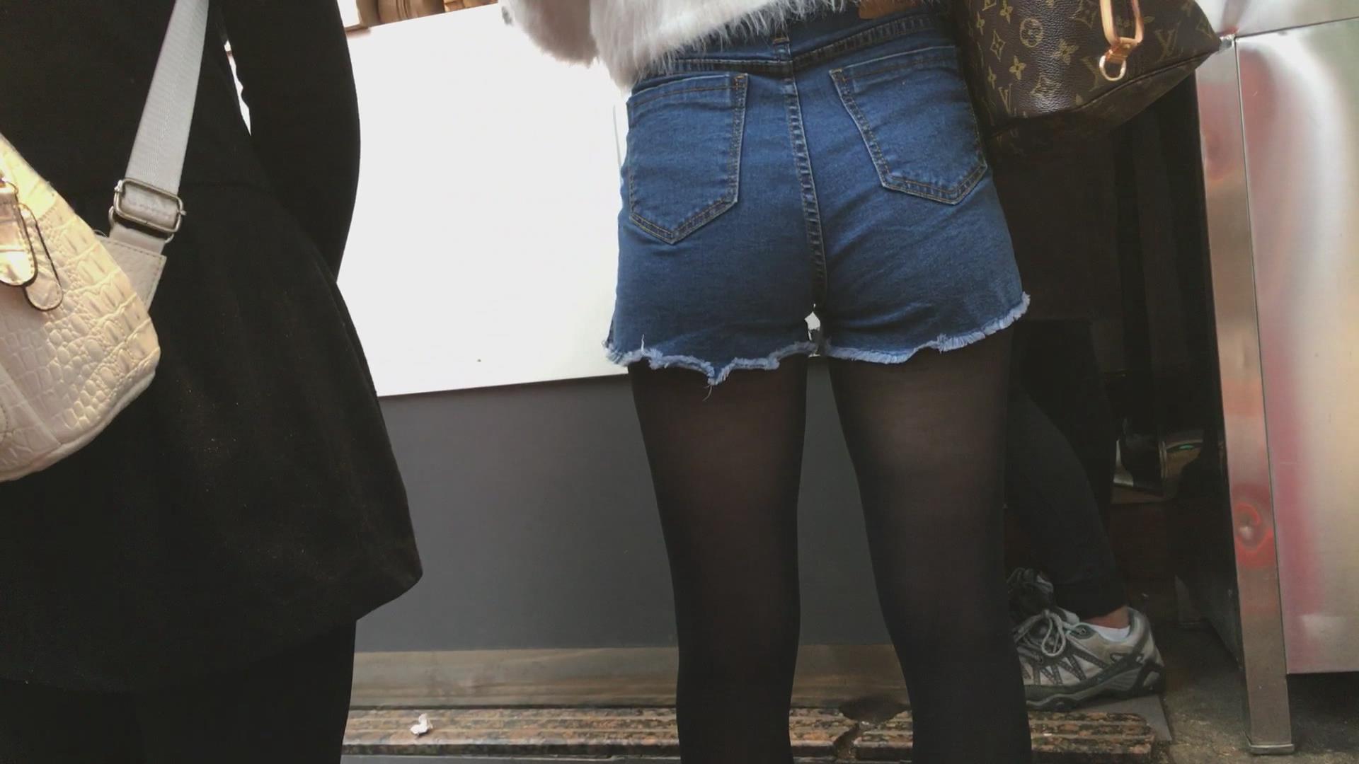 高腰紧身牛仔热裤苹果臀黑丝美眉 编号4348