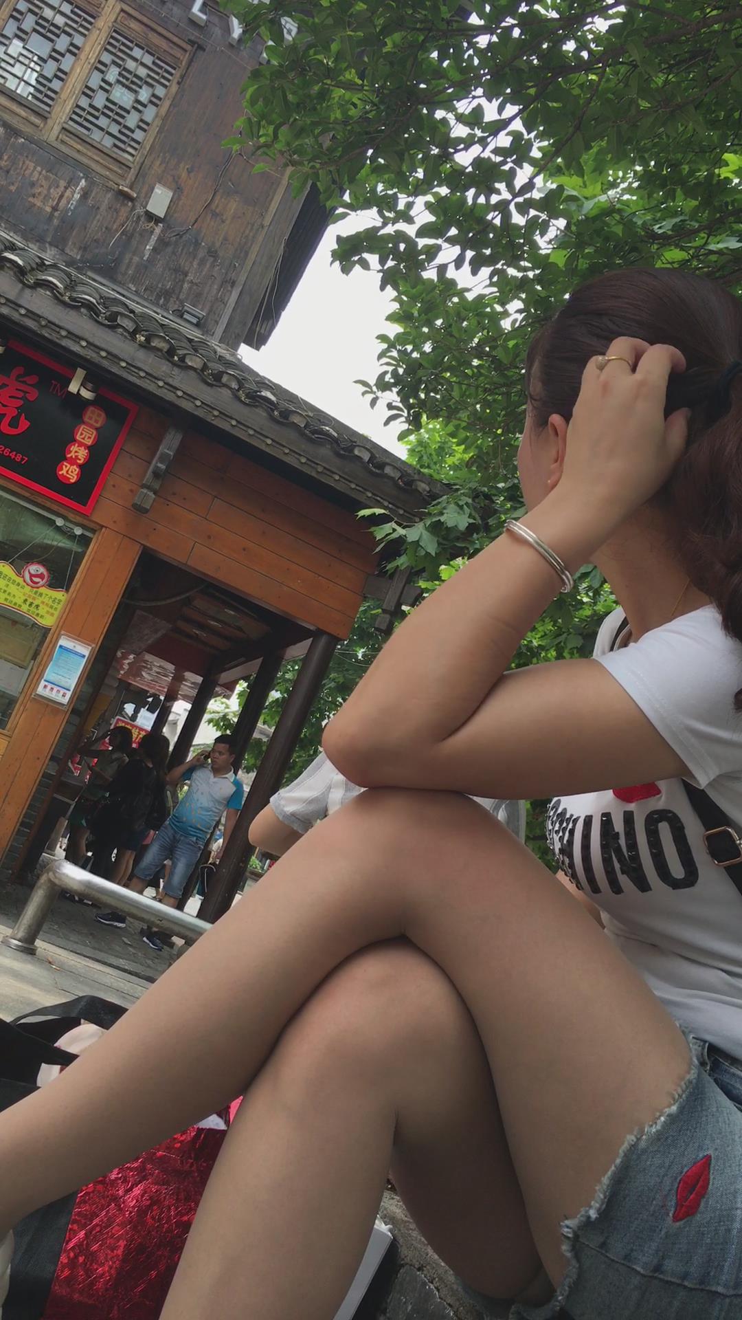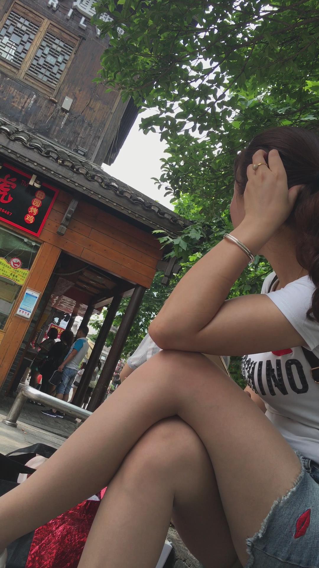 花坛边休息的短热裤白皙美腿女孩 编号4365