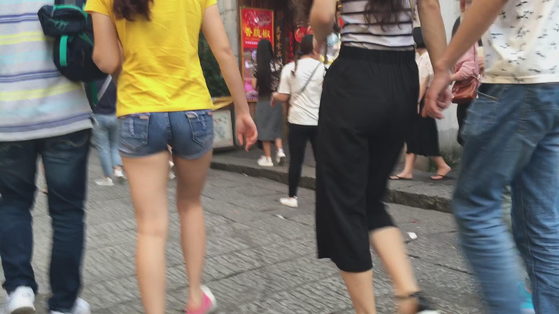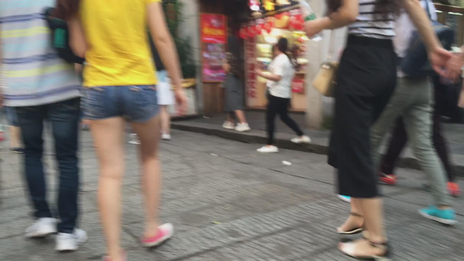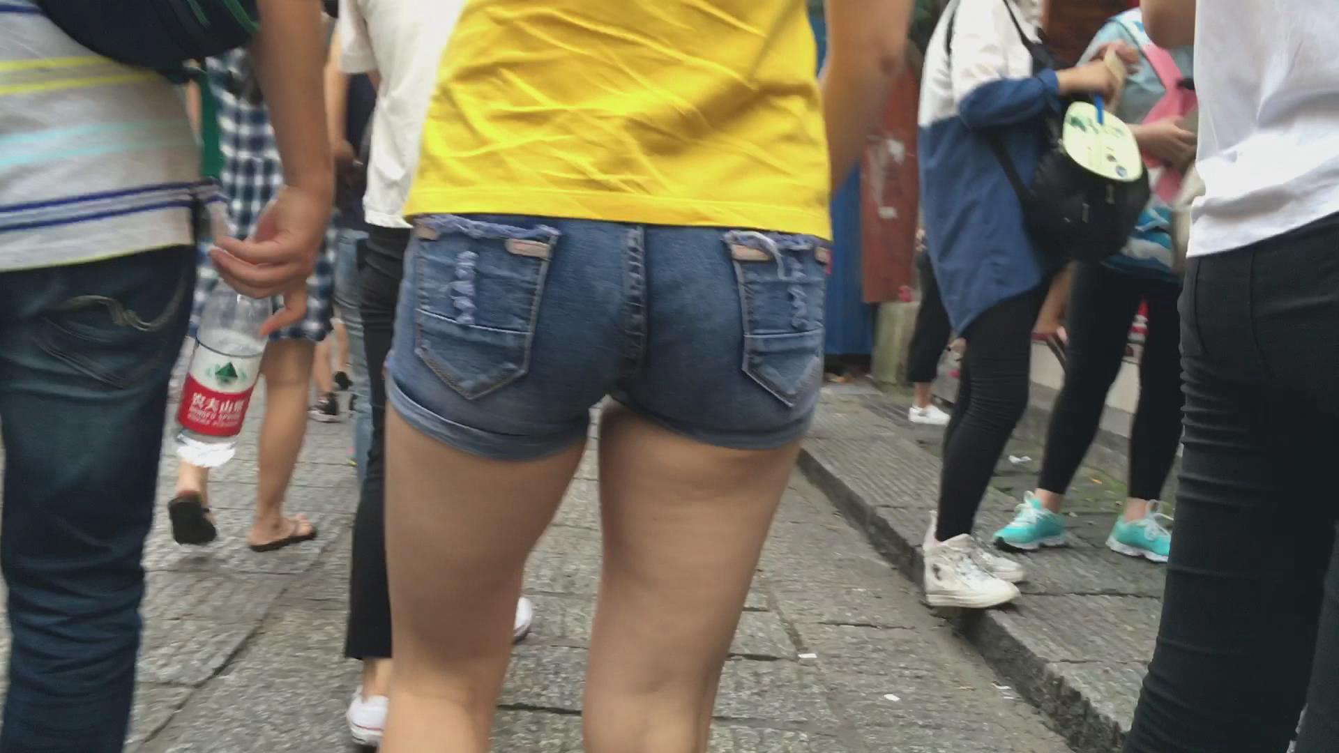 街拍黄T恤紧牛热裤光腿美女逛街 编号4384