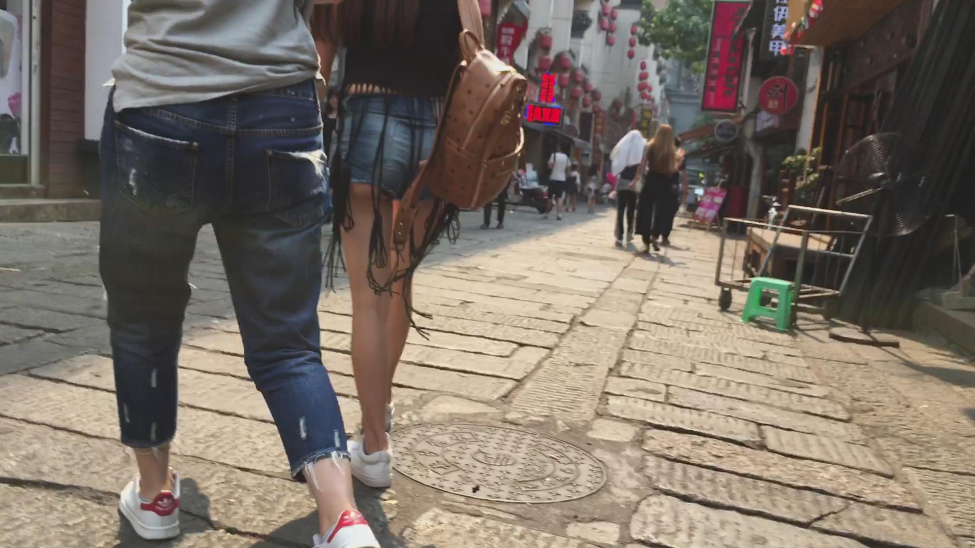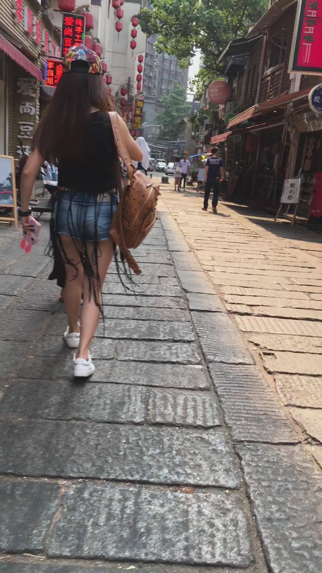 街拍高腰牛仔热裤裸腿圆臀鸭舌帽美女 编号4404