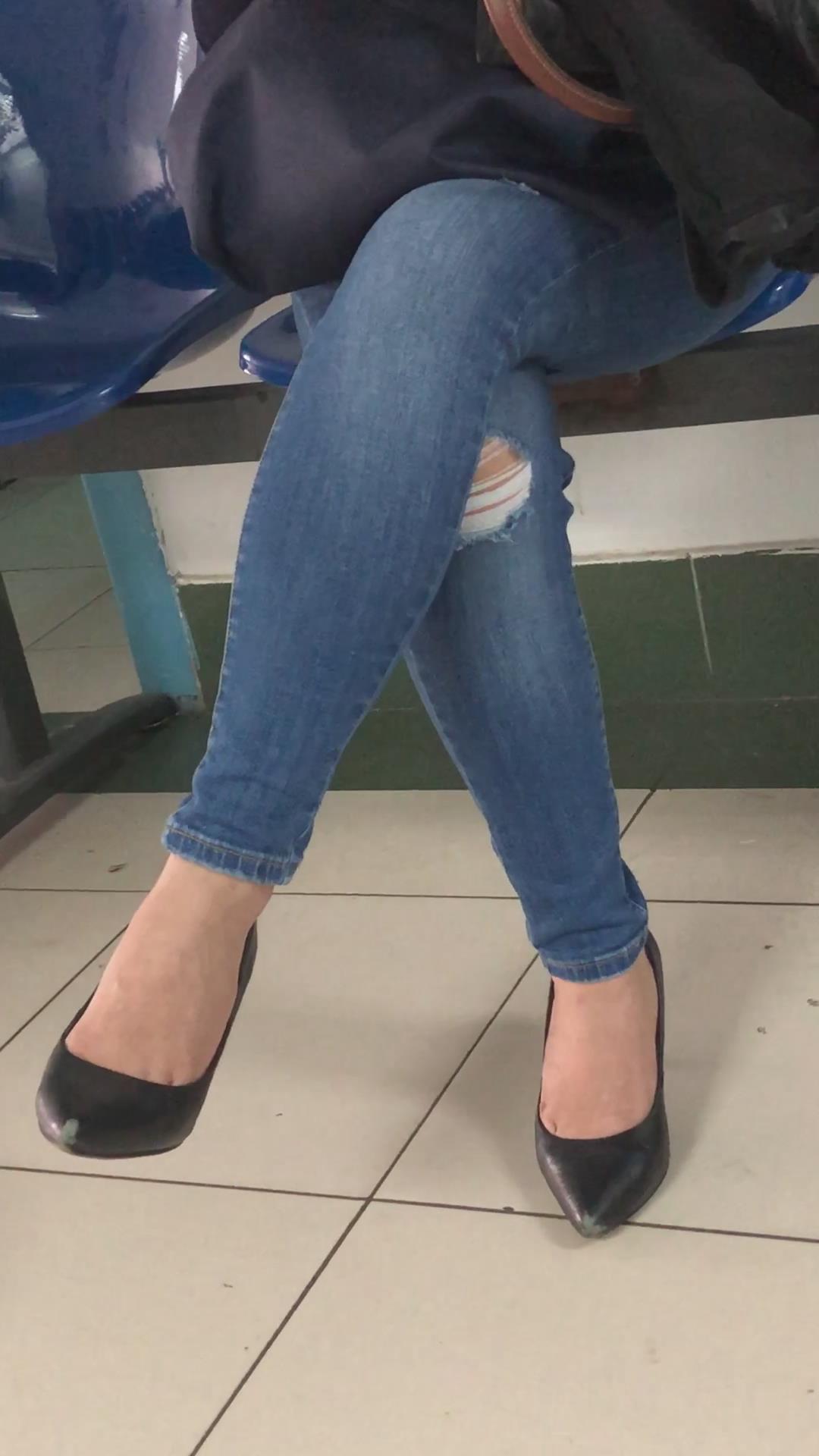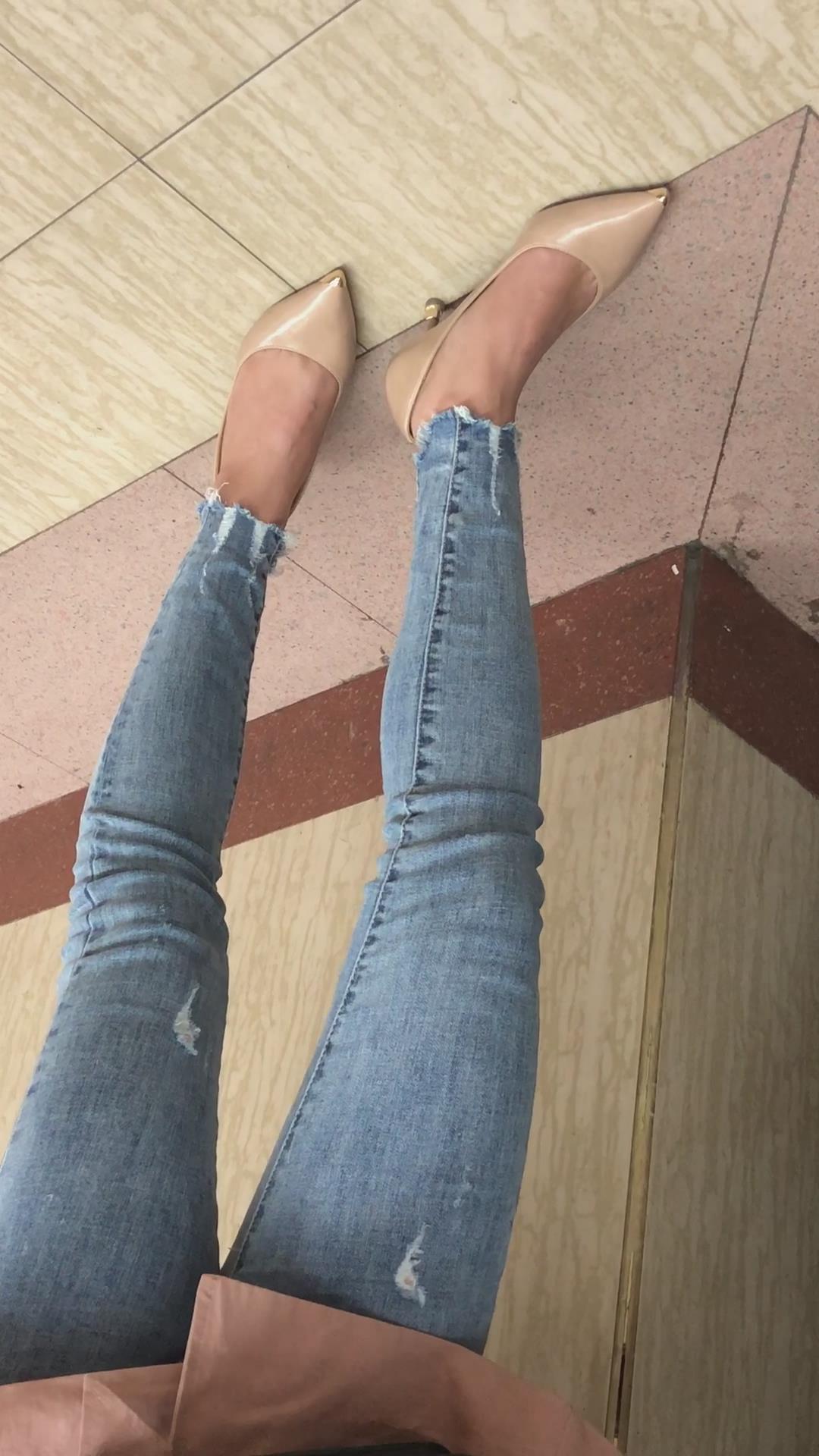 街拍紧身蓝牛高跟鞋美女 编号1645