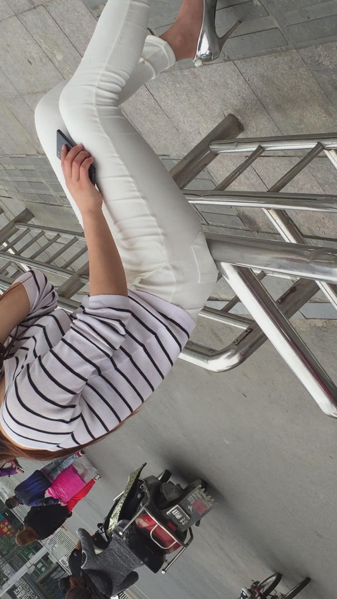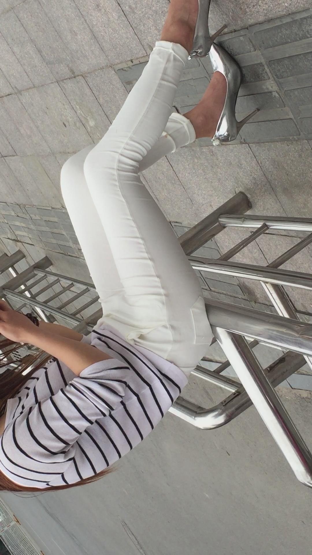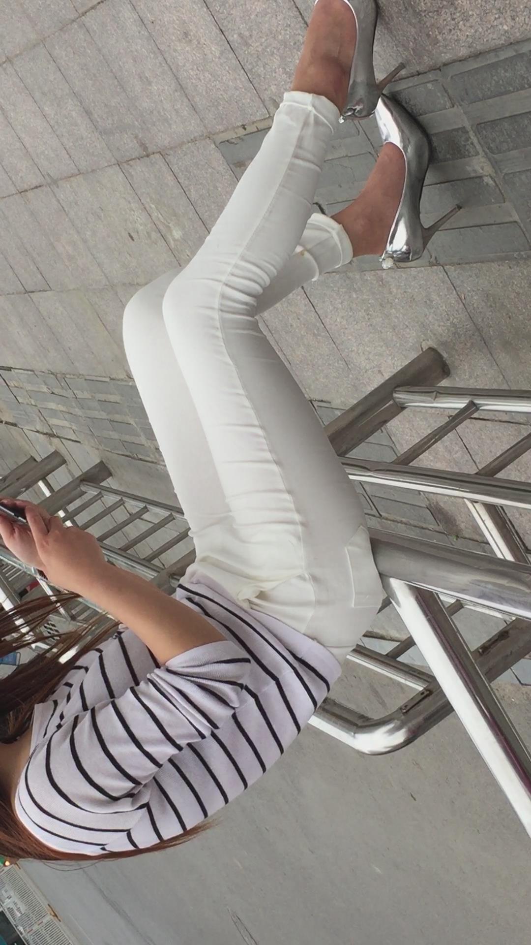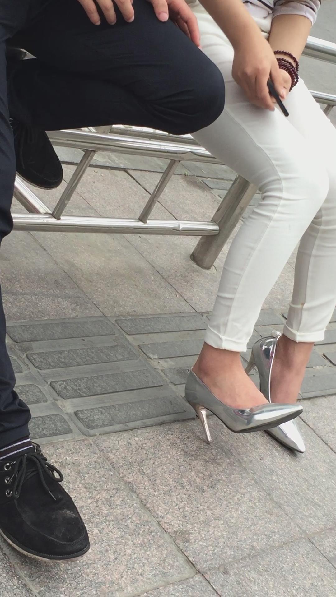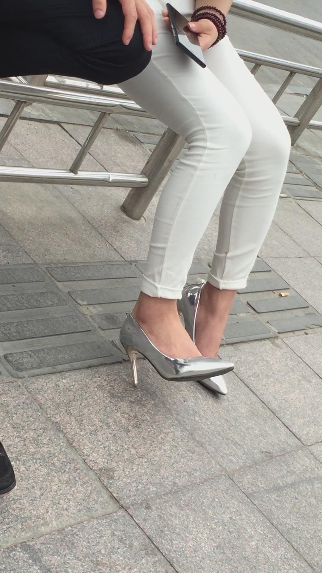 街拍极品美腿紧身裤银白色高跟鞋美女。 编号1761