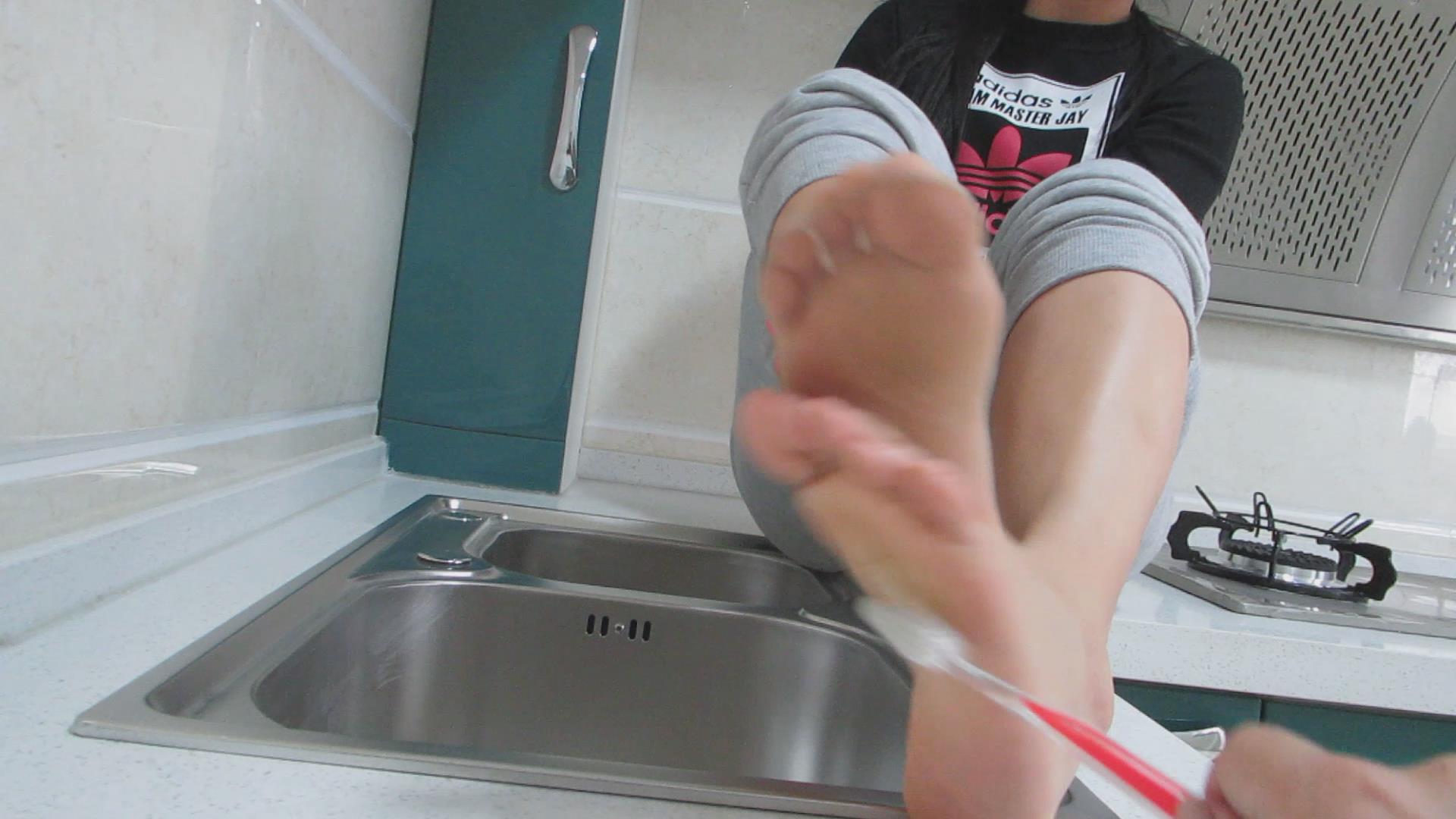 用牙刷挑逗美女的干净玉足 编号6440