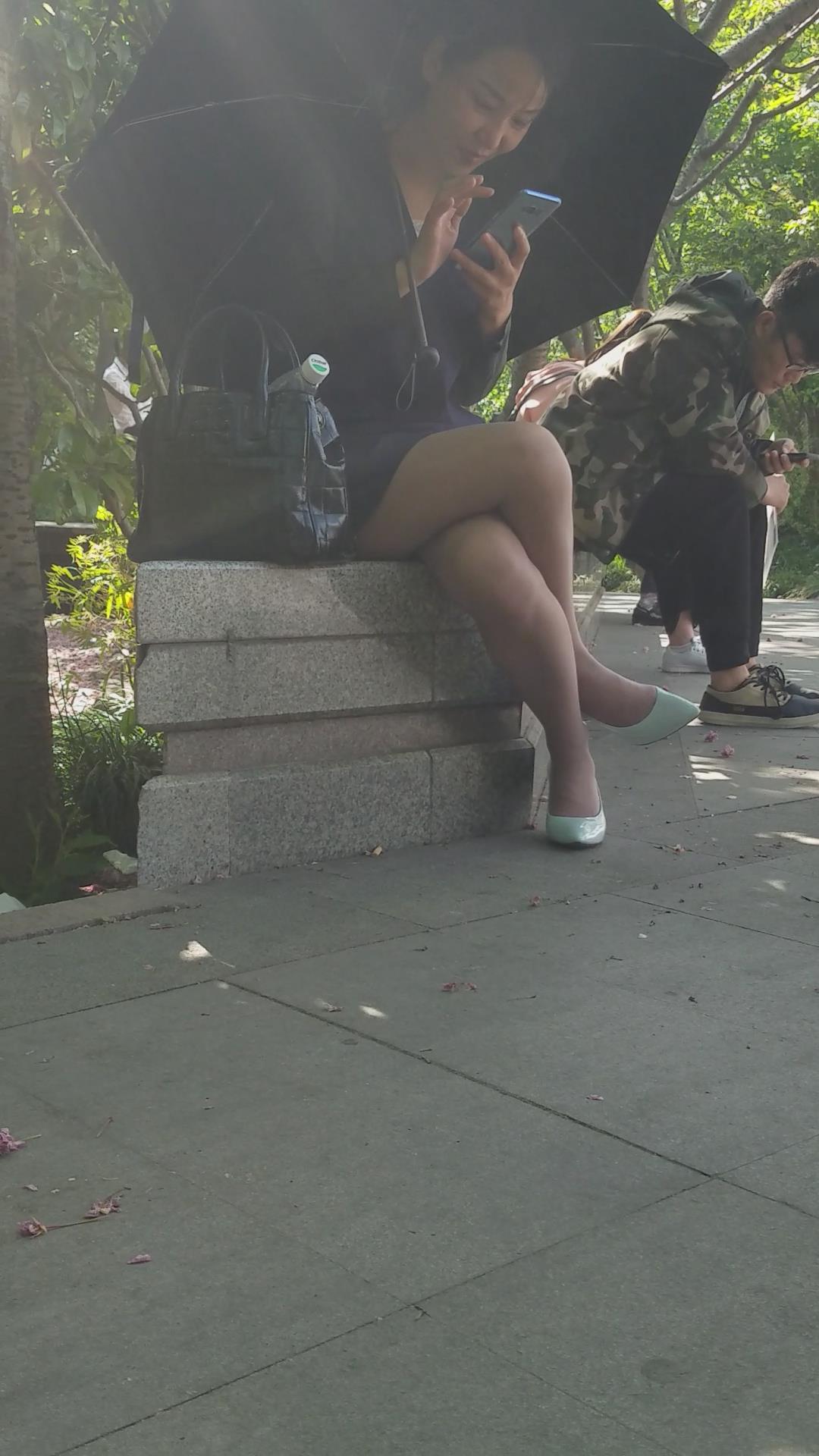 石凳上的黑丝高跟鞋性感美女对着手机傻乐 编号2051