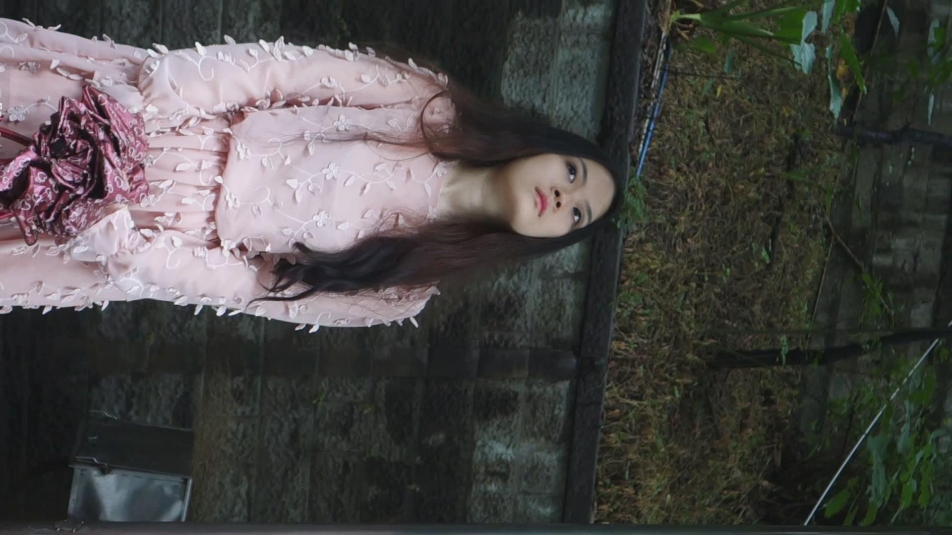 街拍粉色连衣裙丝袜美女在等公交车 编号2057