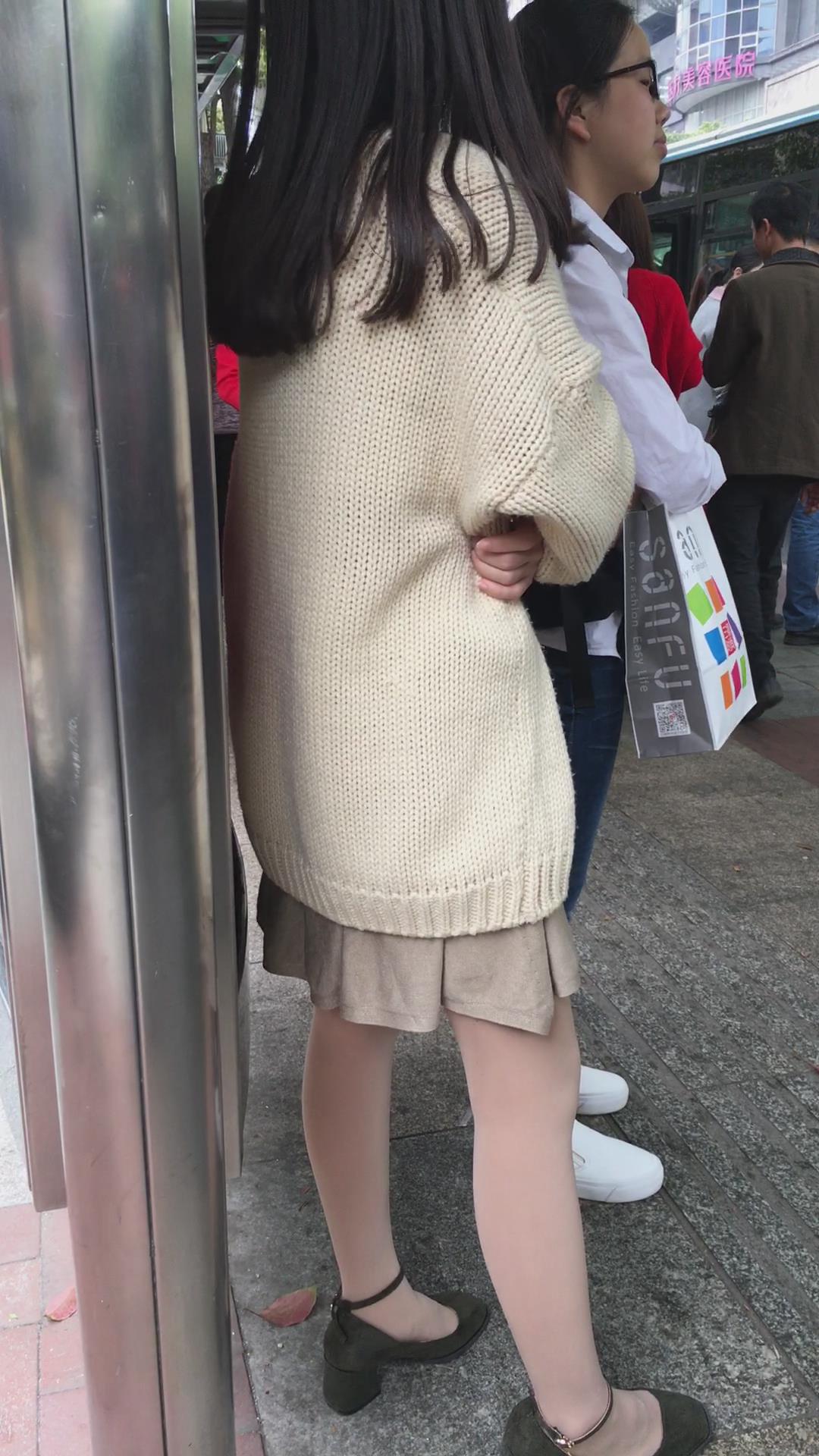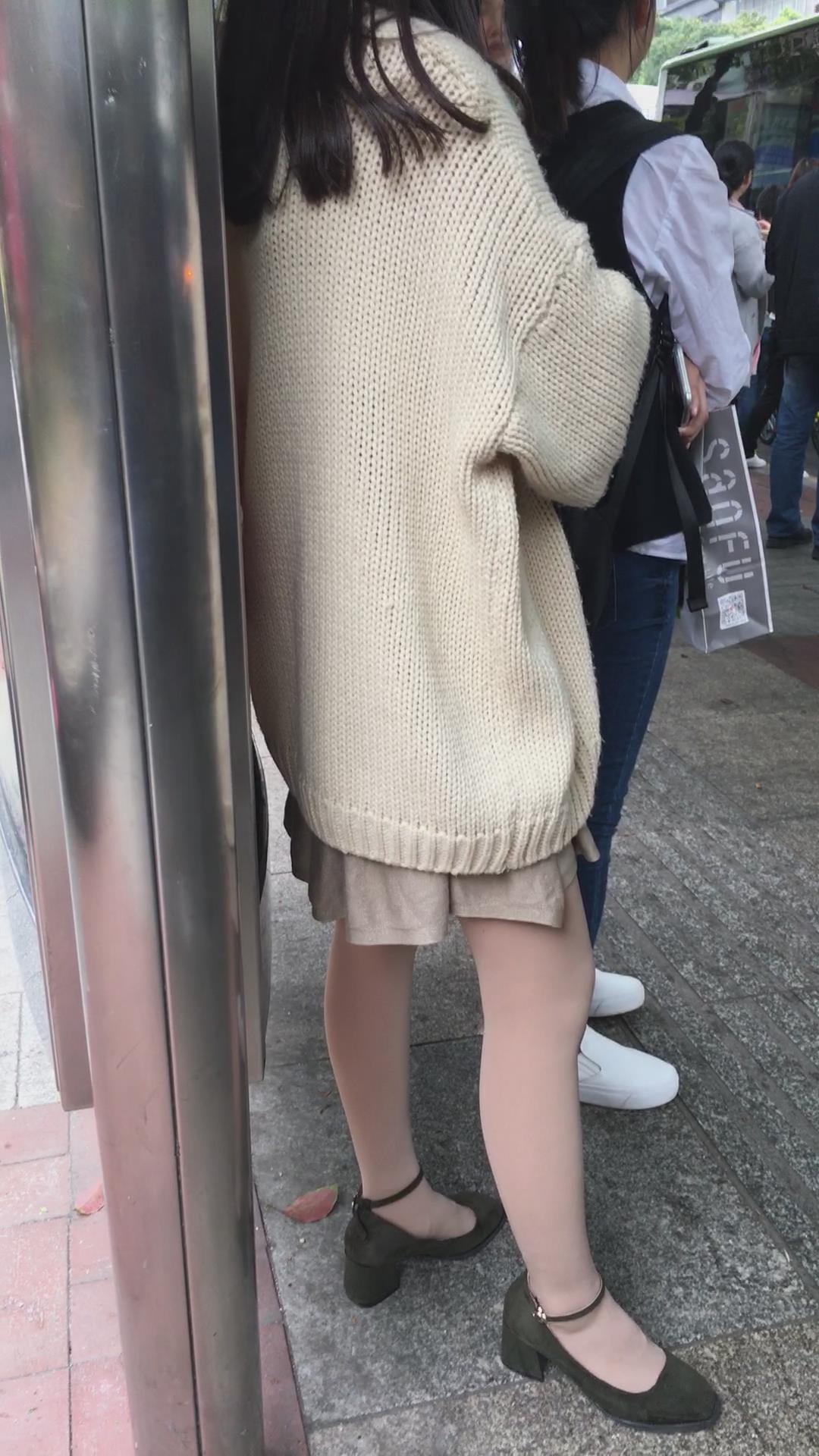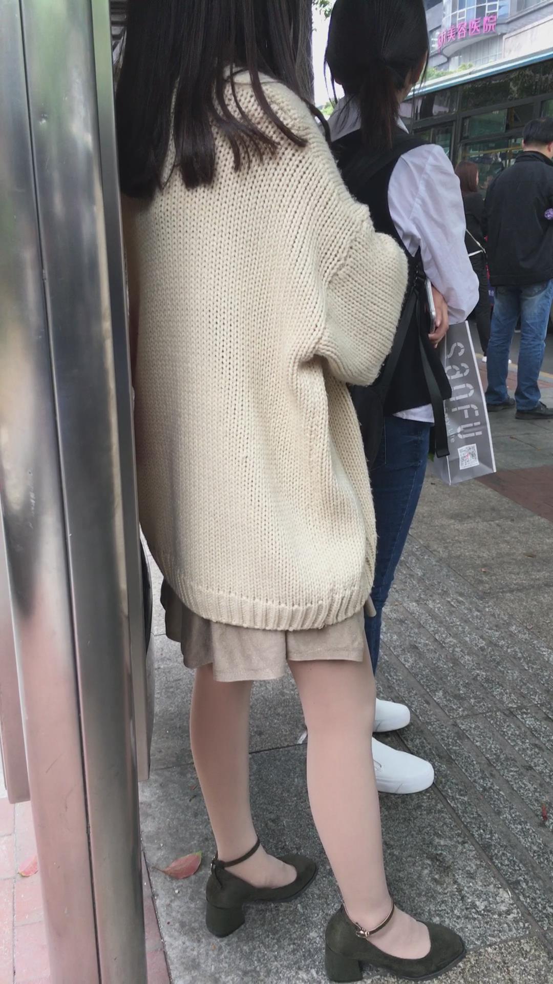街拍公交站等车的米色毛衣短裙丝袜街拍美腿 编号2139